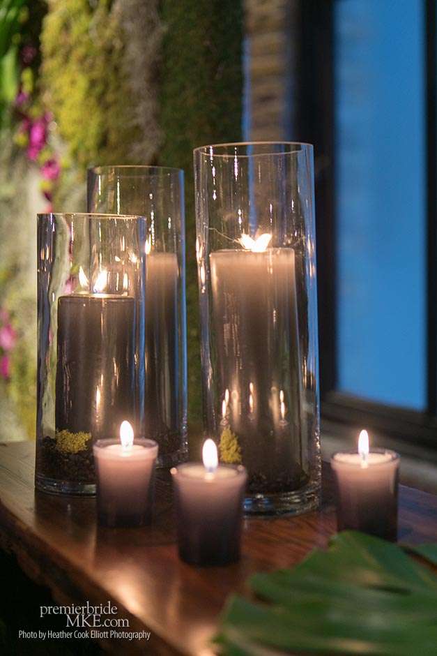 Kimmie and Patrick certainly succeeded in creating a shining, singular space. The ceremony centered on three large, living wall pieces. Candles were thoughtfully placed throughout the room, giving off an enchanted glow. “There was a tropical feel, even on a cold, snowy day.” For the reception, the room was divided in two distinct areas, one for dining and the other for cocktail hour and dancing. “A beautiful hand-dyed fabric separated the space. Guests were transported to a new experience throughout the evening.”