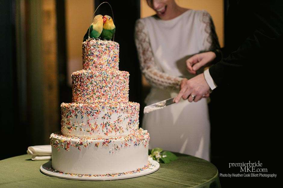 For dinner, guests had a choice of three entrées. Dessert was a mixture of petite desserts and a festive rainbow sprinkle cake with two lovebirds perched atop the highest tier. Later in the evening, folks were treated to build-your-own tacos and a margarita machine dispensing two delicious flavors.