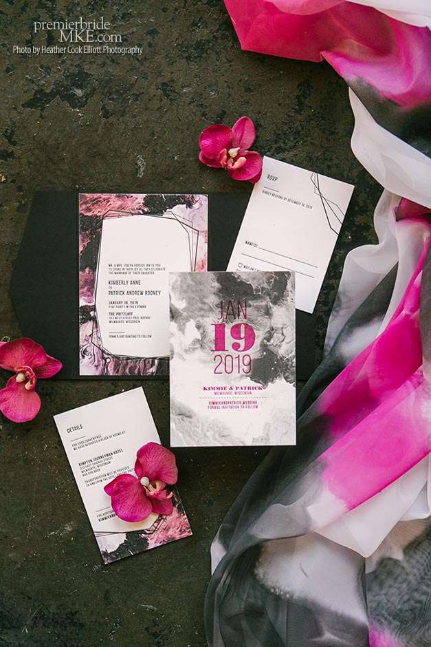 Patrick and Kimmie landed on a vibe that was neo-hippie, playful, simple, and elegant. “We didn’t want it to feel like a winter wedding at all.” Patrick and Kimmie accented a refined color palette of black, white, and grey with pops of orchid pink and purple, plus lots of marbling and tie-dye. Kimmie found decor inspiration by creating vision boards galore. Her advice to other brides: “Create boards that include art, architecture, colors, and design that speak to you and your tastes—not just pictures of weddings. You will be surprised by how far you can push the space and your own creativity to make this day special and unique.”