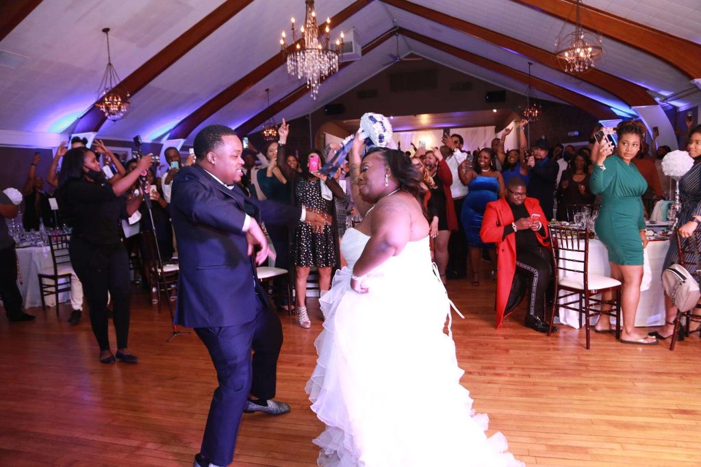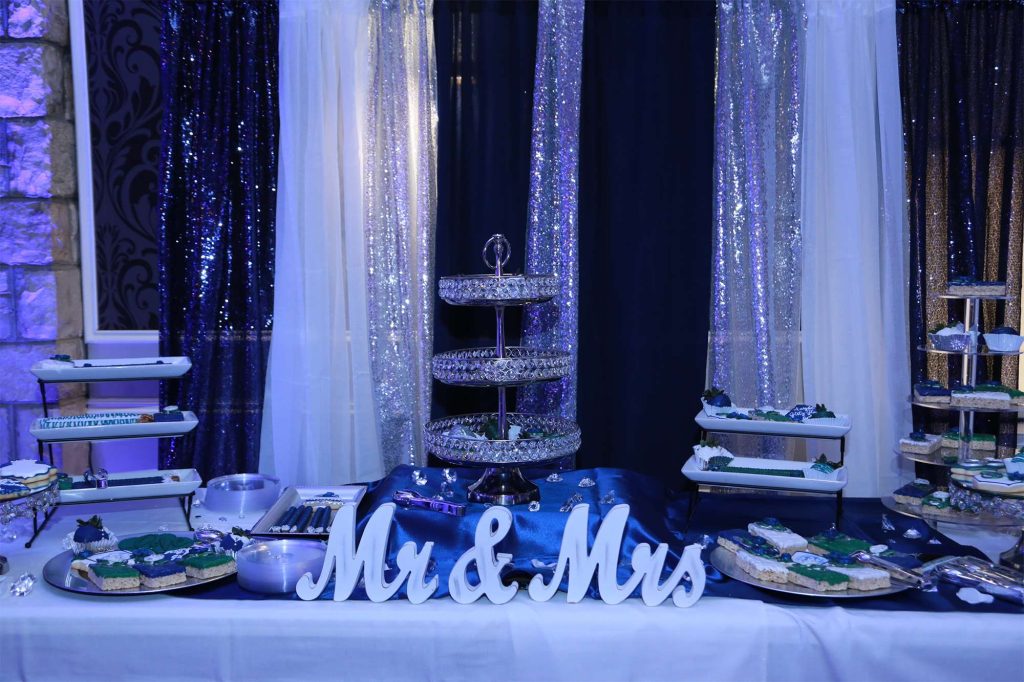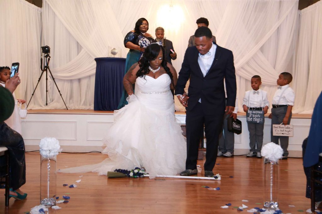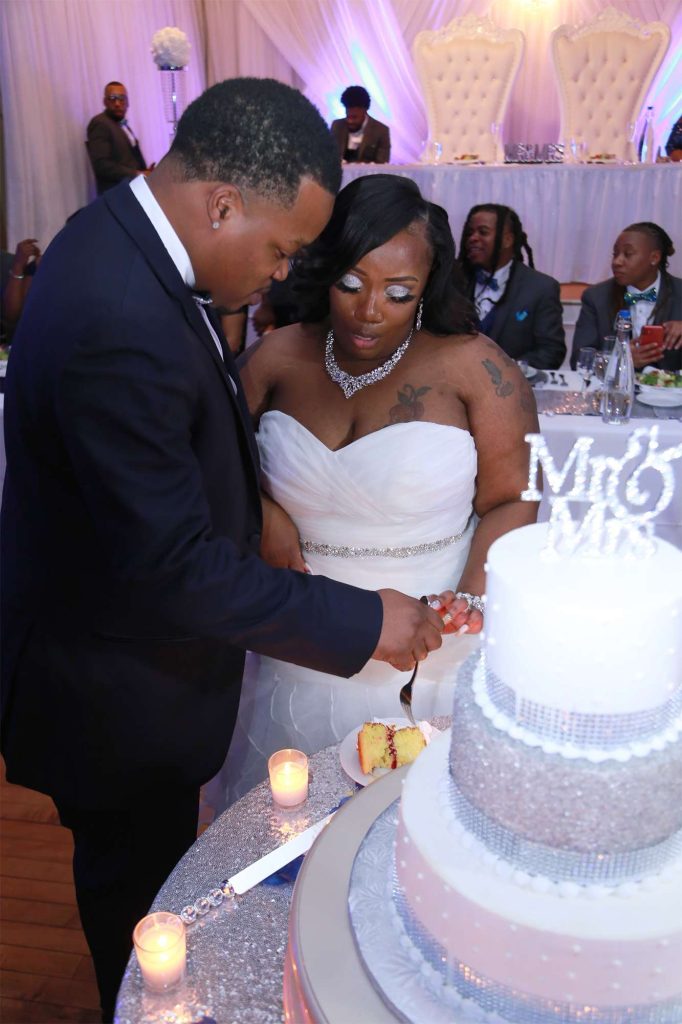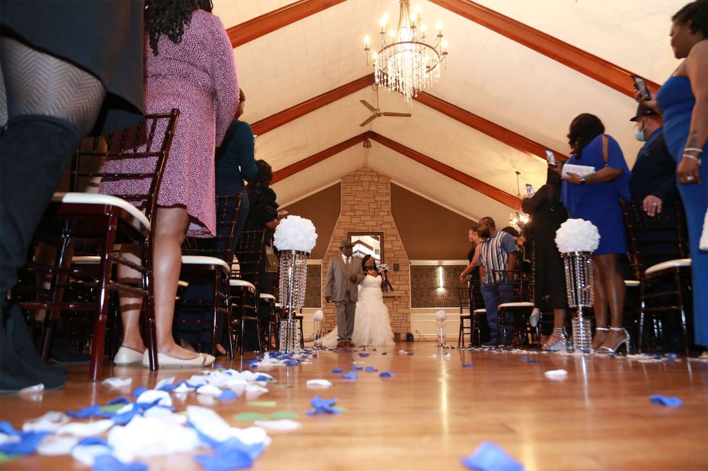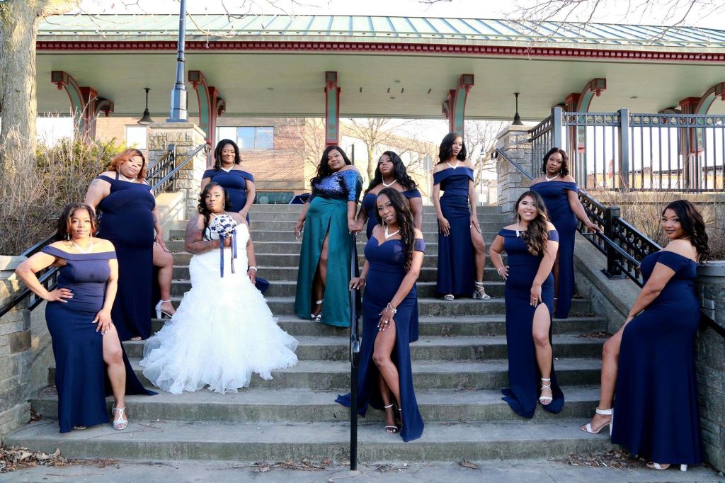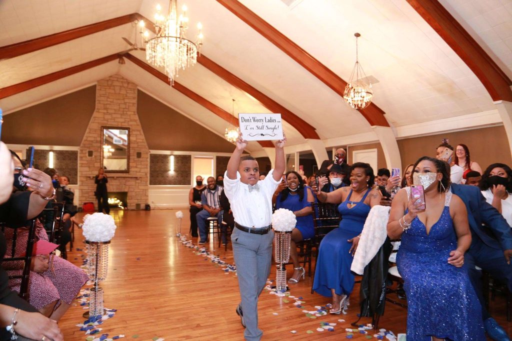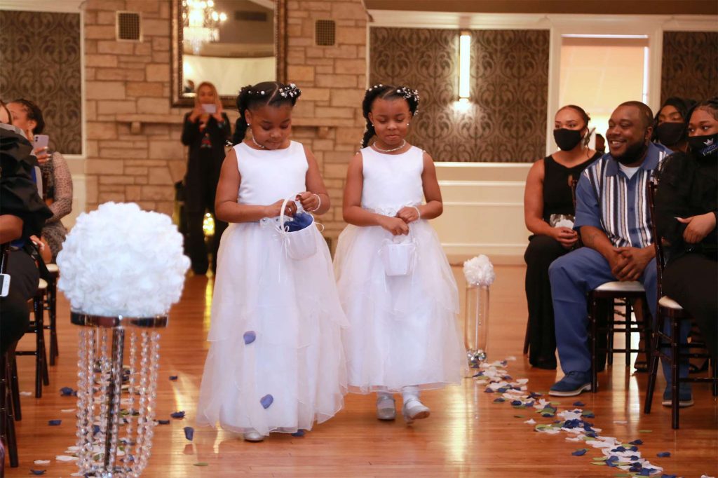 After changing their wedding date a handful of times due to Covid, the happy couple finally settled on March 3rd, 2021—their anniversary! “The theme was glitz and glam because I love, love, love bling!” Kristin says. The wedding colors were navy blue, emerald green, white, and silver. The wedding party featured nine bridesmaids, one maid of honor, seven groomsmen, one groomswoman, one best man, two flower girls, two ring bearers, and one little guy to announce the bride’s arrival.