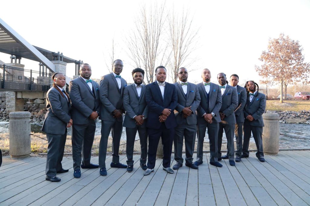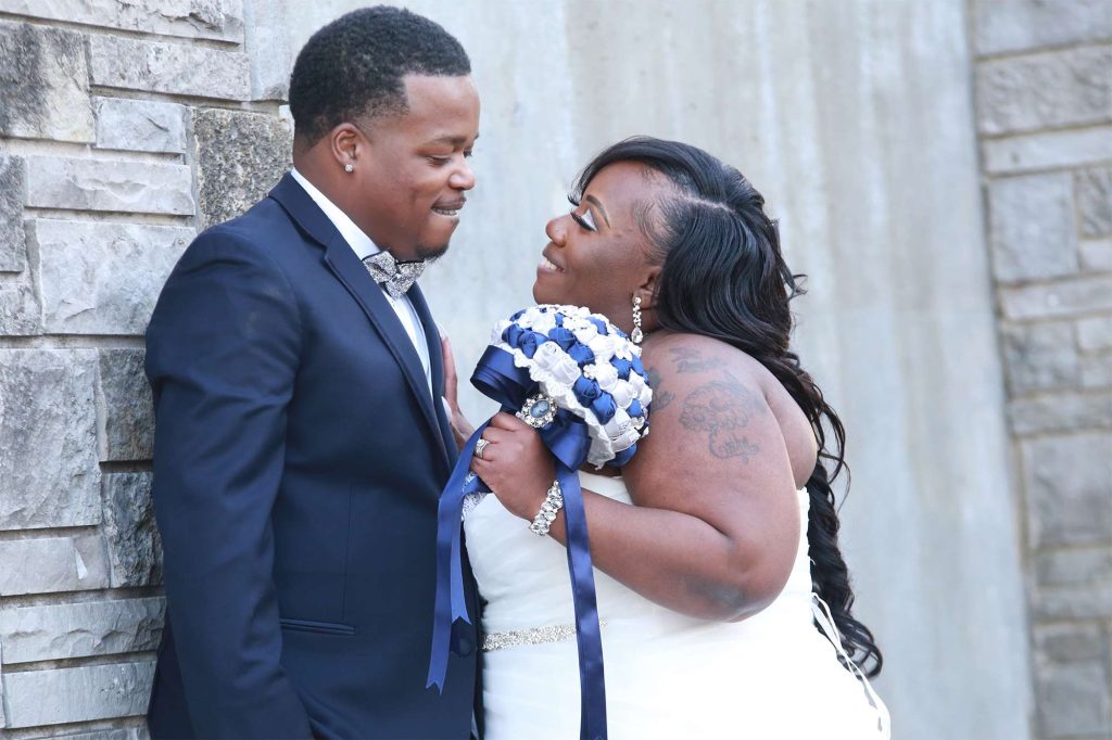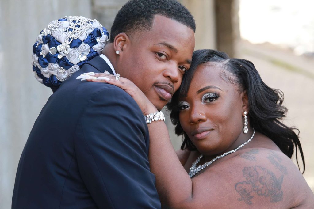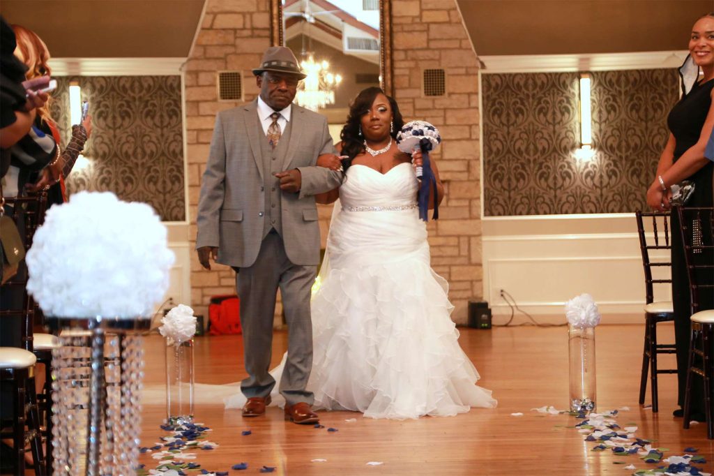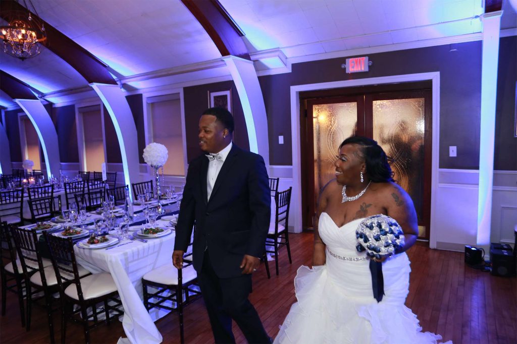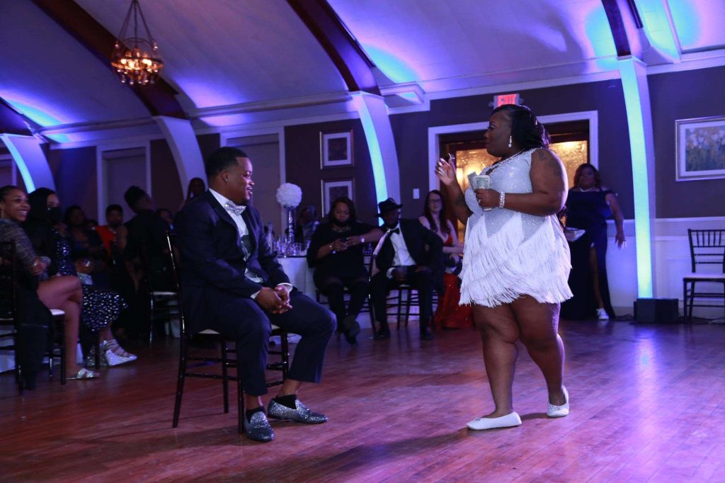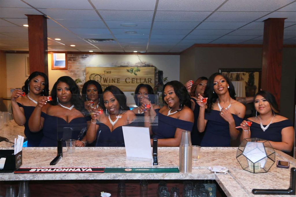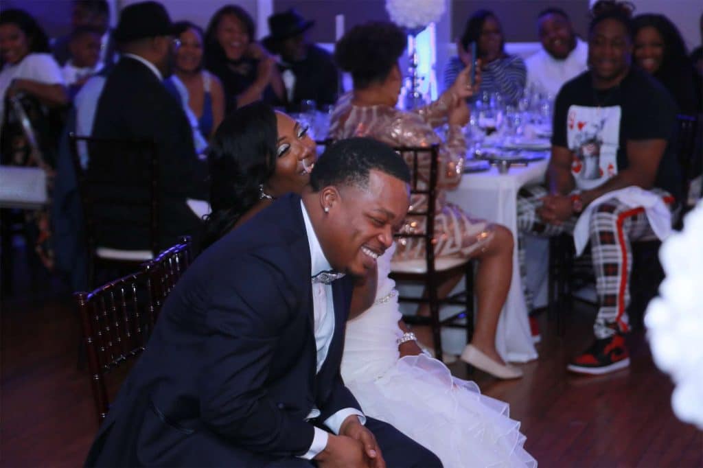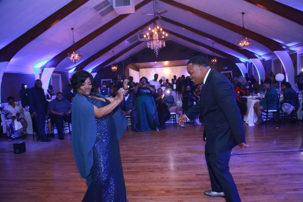 After changing their wedding date a handful of times due to Covid, the happy couple finally settled on March 3rd, 2021—their anniversary! “The theme was glitz and glam because I love, love, love bling!” Kristin says. The wedding colors were navy blue, emerald green, white, and silver. The wedding party featured nine bridesmaids, one maid of honor, seven groomsmen, one groomswoman, one best man, two flower girls, two ring bearers, and one little guy to announce the bride’s arrival.