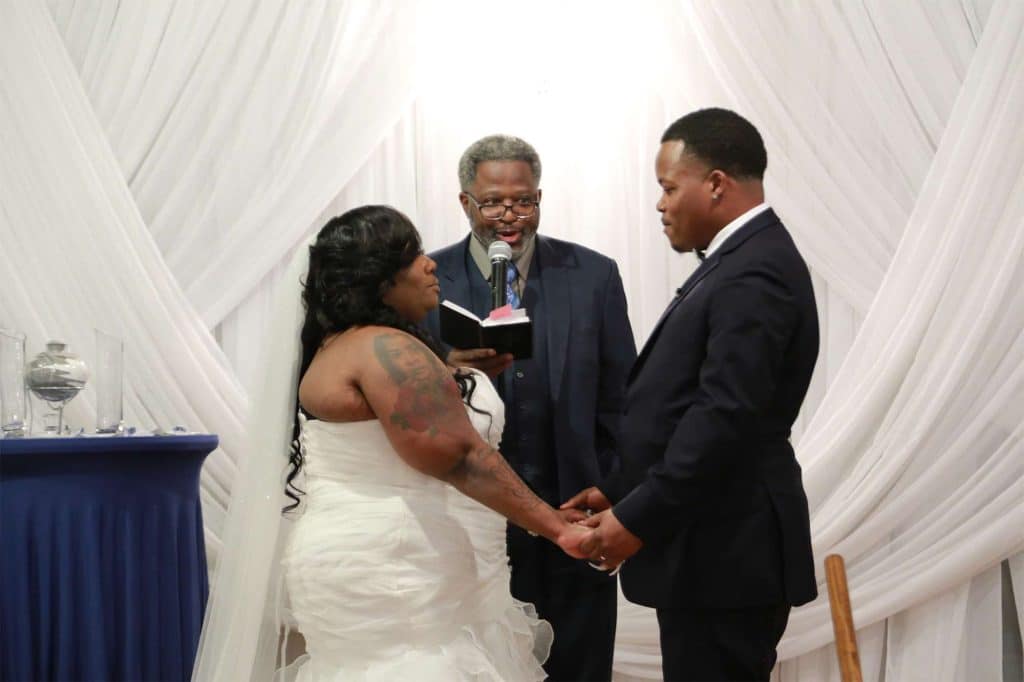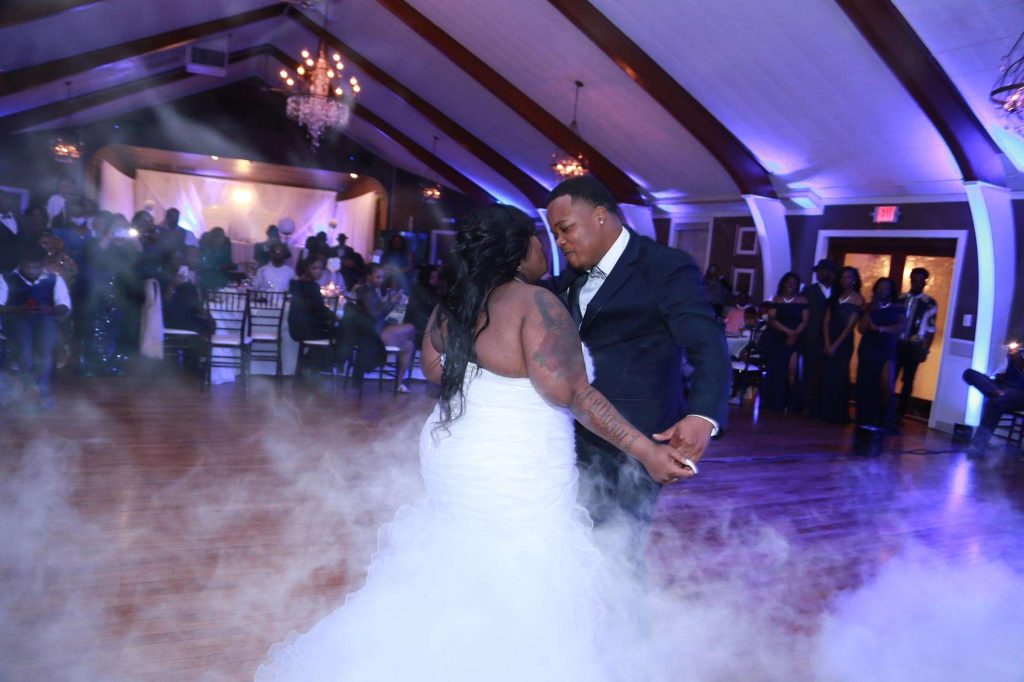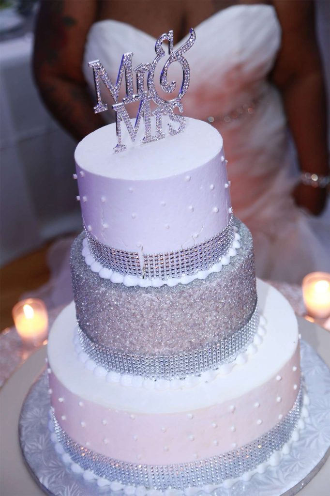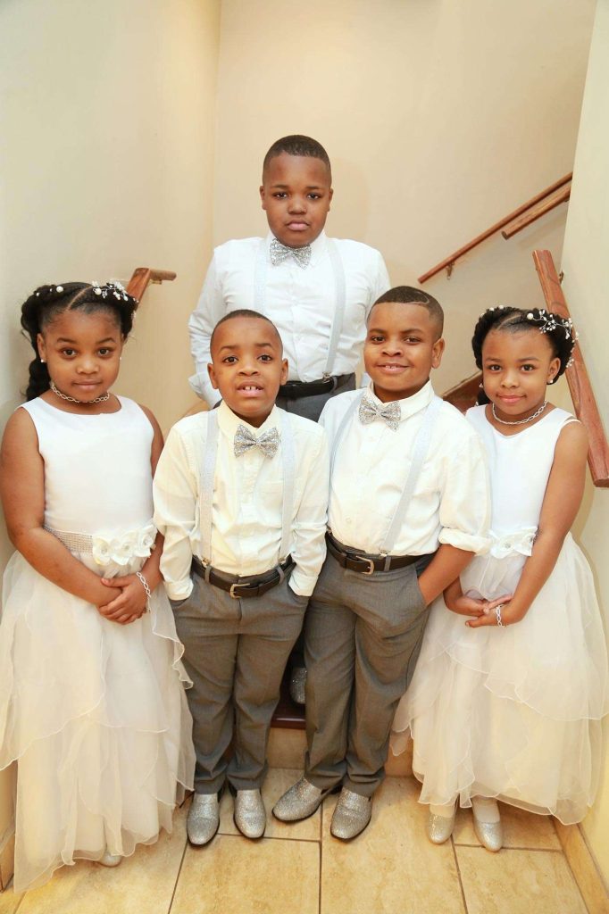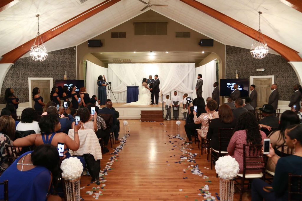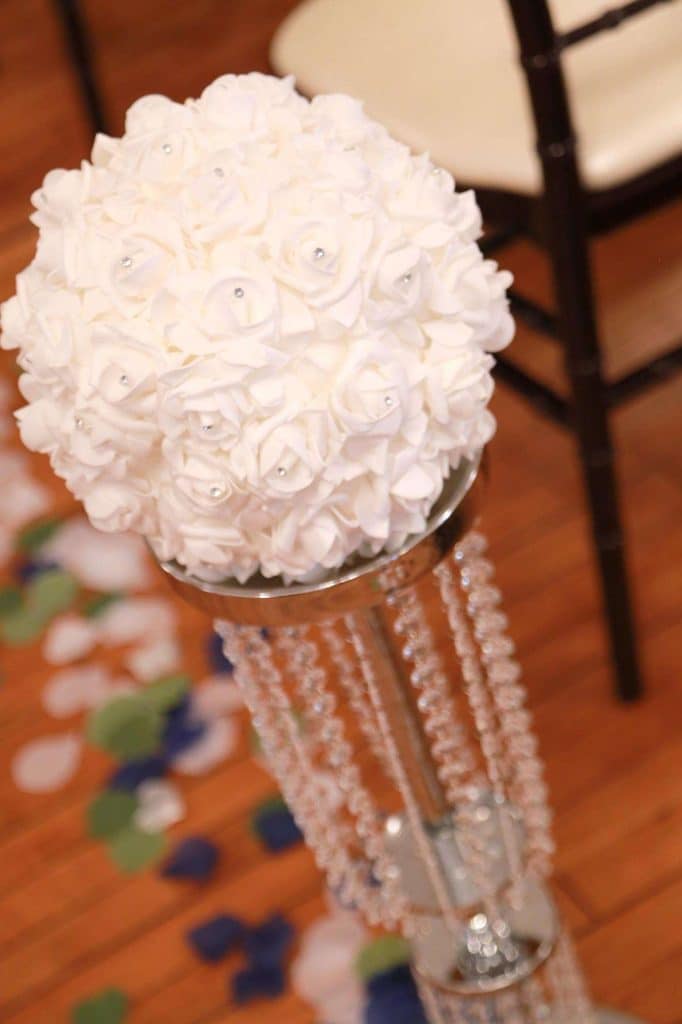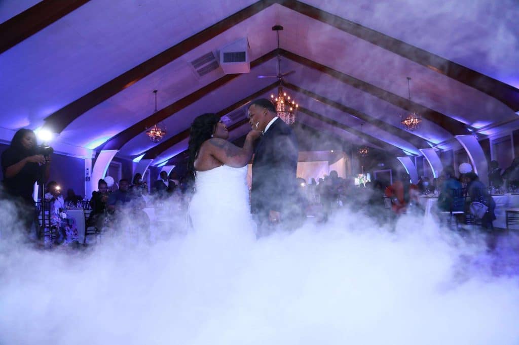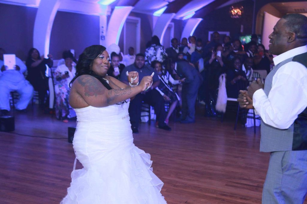 After changing their wedding date a handful of times due to Covid, the happy couple finally settled on March 3rd, 2021—their anniversary! “The theme was glitz and glam because I love, love, love bling!” Kristin says. The wedding colors were navy blue, emerald green, white, and silver. The wedding party featured nine bridesmaids, one maid of honor, seven groomsmen, one groomswoman, one best man, two flower girls, two ring bearers, and one little guy to announce the bride’s arrival.