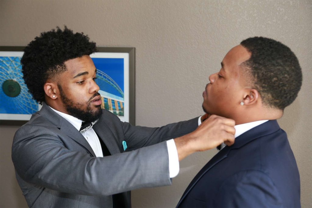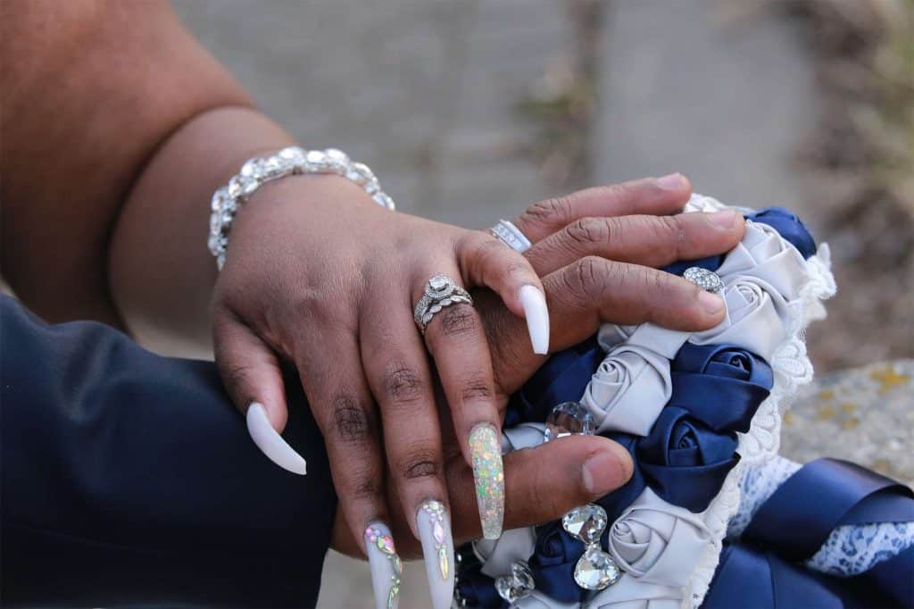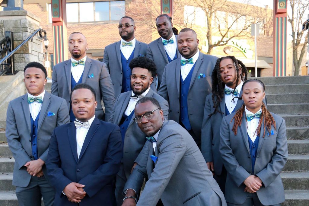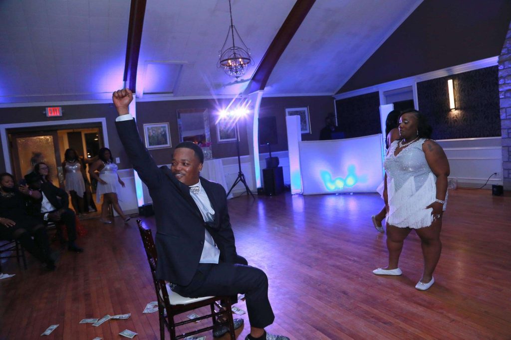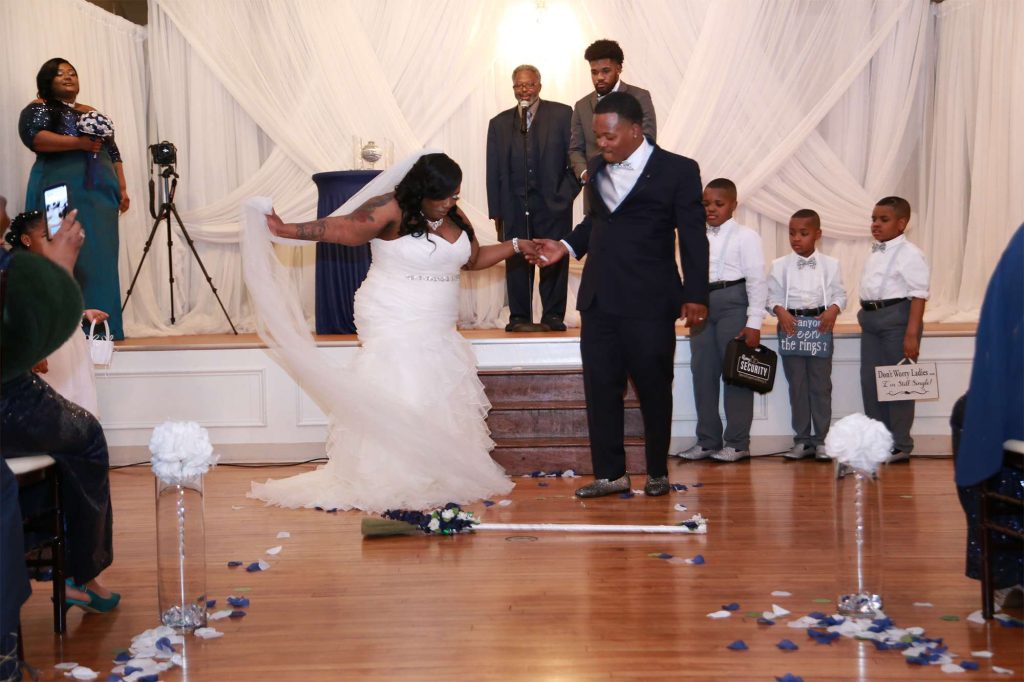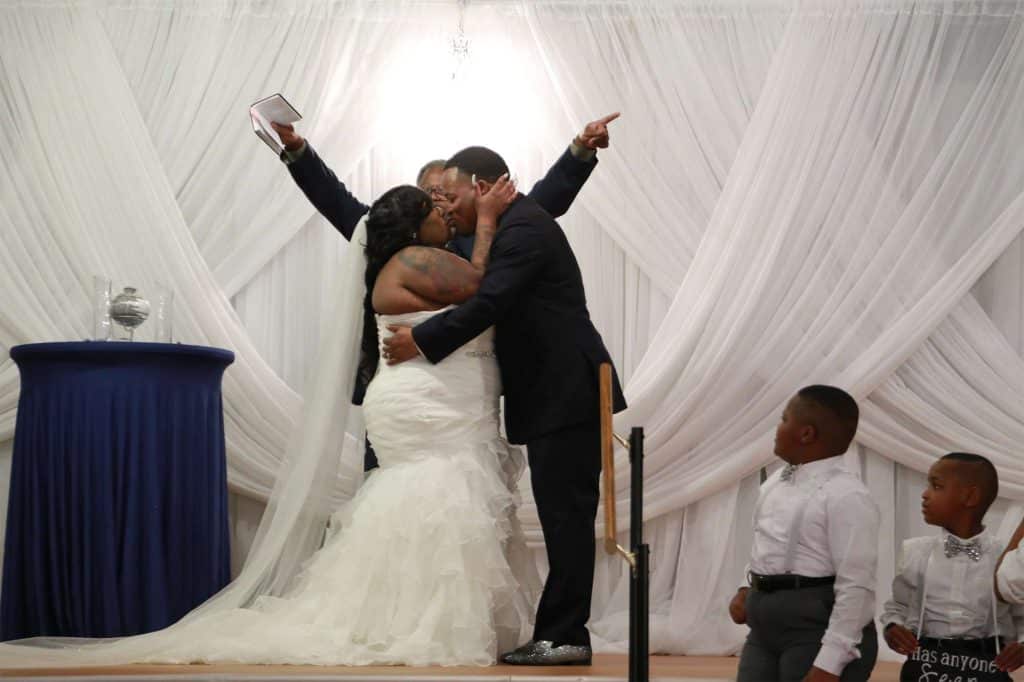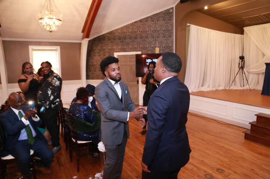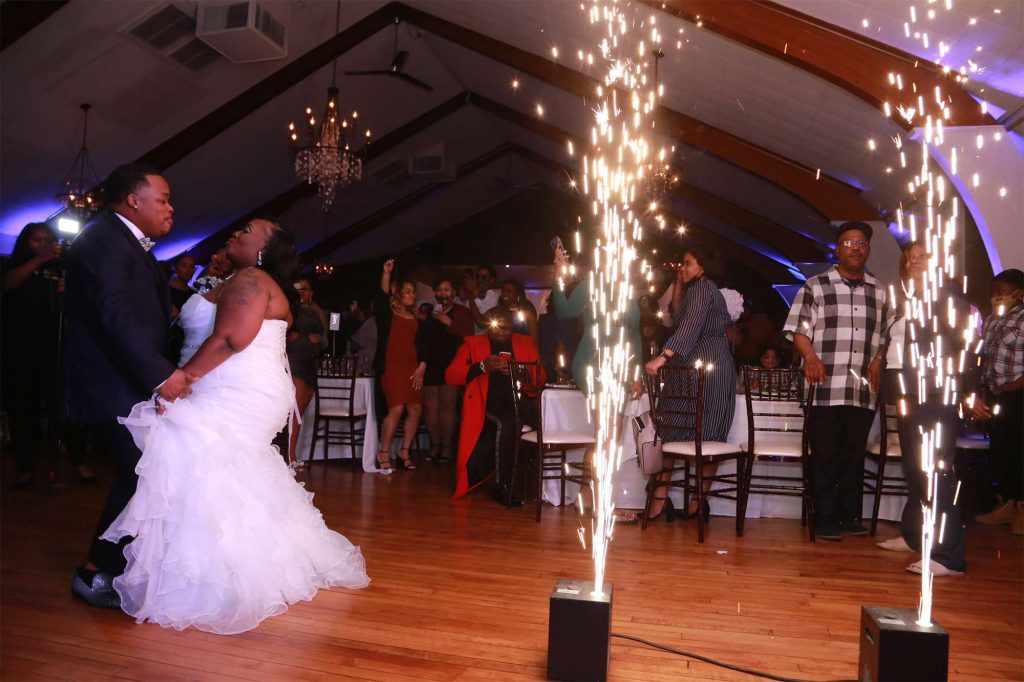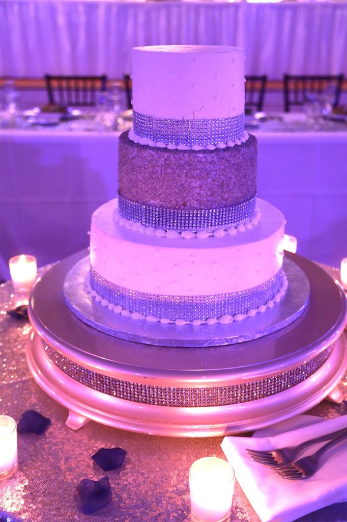 After changing their wedding date a handful of times due to Covid, the happy couple finally settled on March 3rd, 2021—their anniversary! “The theme was glitz and glam because I love, love, love bling!” Kristin says. The wedding colors were navy blue, emerald green, white, and silver. The wedding party featured nine bridesmaids, one maid of honor, seven groomsmen, one groomswoman, one best man, two flower girls, two ring bearers, and one little guy to announce the bride’s arrival.