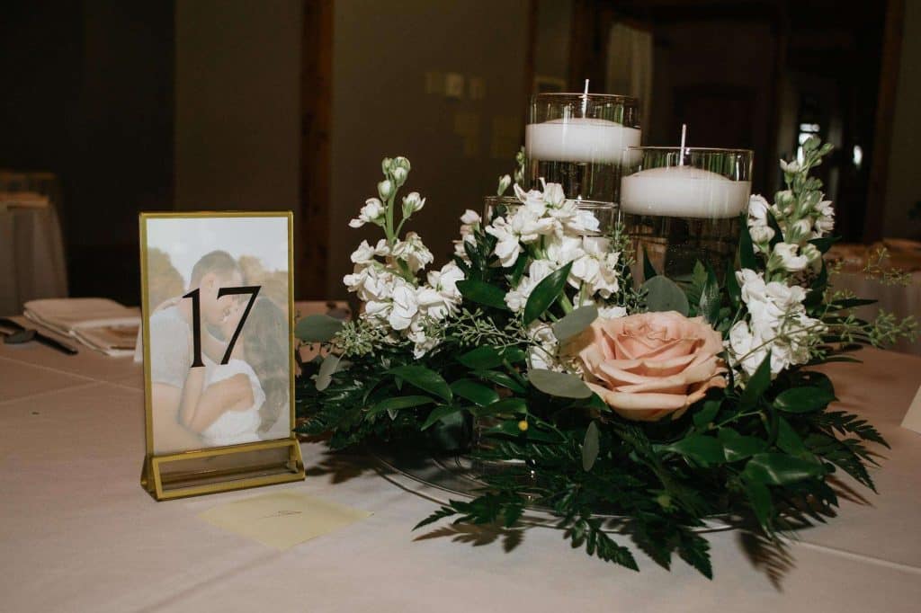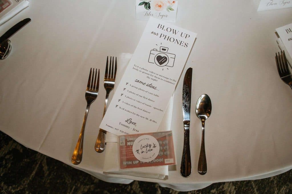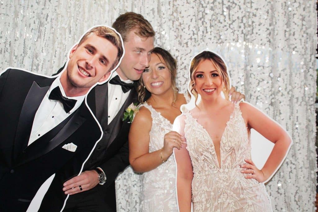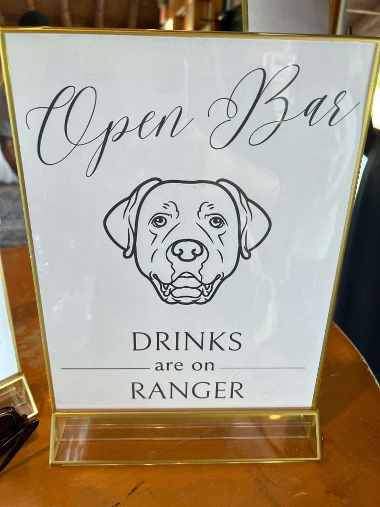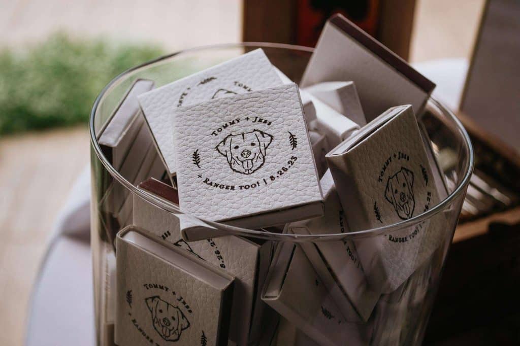 The color palette for Jess and Tommy’s wedding included rose and champagne with hints of gold and sage green. The flowers from Trellis Weddings were breathtakingly beautiful! “My florist truly knocked it out of the park,” Jessica shared. There were a number of personal touches around their venue, including custom matchbooks with their dog Ranger on them, along with an open bar sign that read, “Drinks are on Ranger.” The couple also had a photobooth, which they had lifesize cutouts created of themselves people could take pictures with – something that started as a joke but became reality.