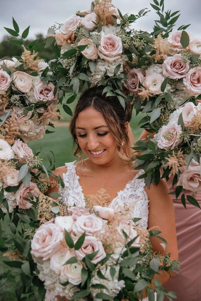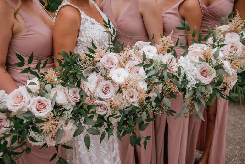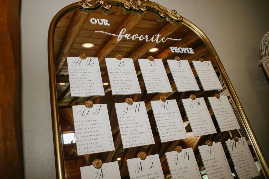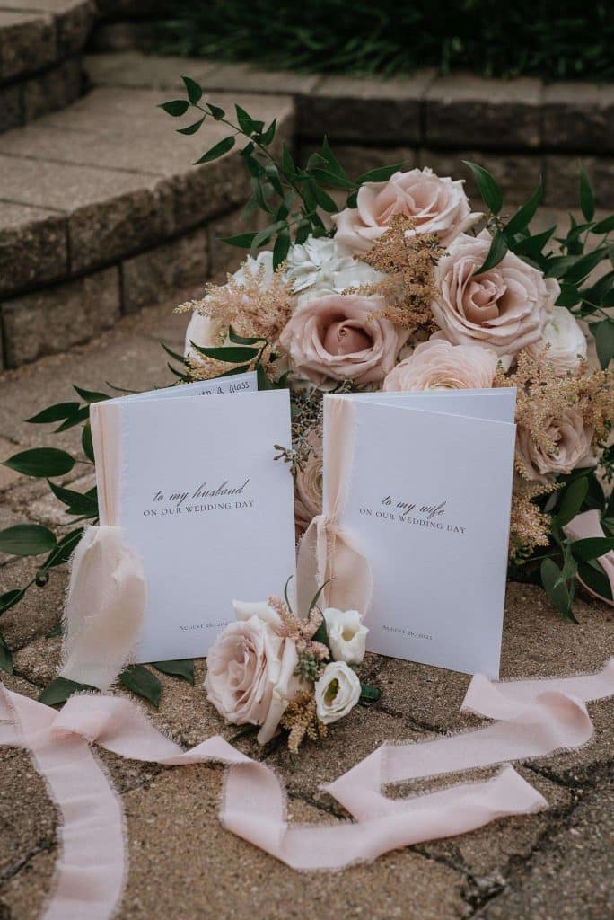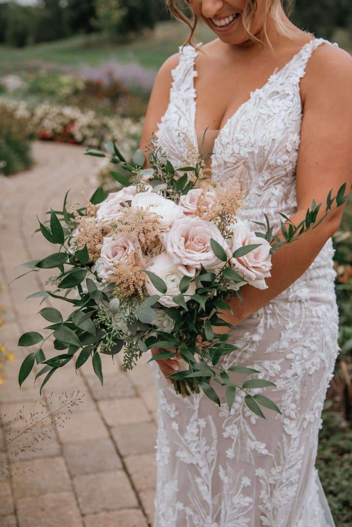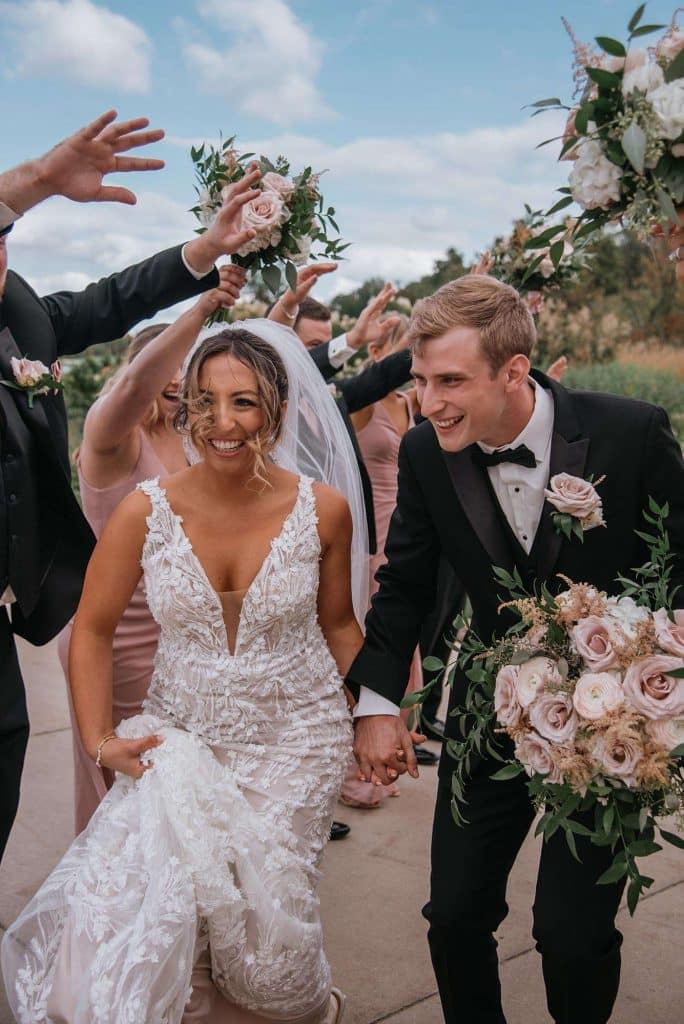 The color palette for Jess and Tommy’s wedding included rose and champagne with hints of gold and sage green. The flowers from Trellis Weddings were breathtakingly beautiful! “My florist truly knocked it out of the park,” Jessica shared. There were a number of personal touches around their venue, including custom matchbooks with their dog Ranger on them, along with an open bar sign that read, “Drinks are on Ranger.” The couple also had a photobooth, which they had lifesize cutouts created of themselves people could take pictures with – something that started as a joke but became reality.