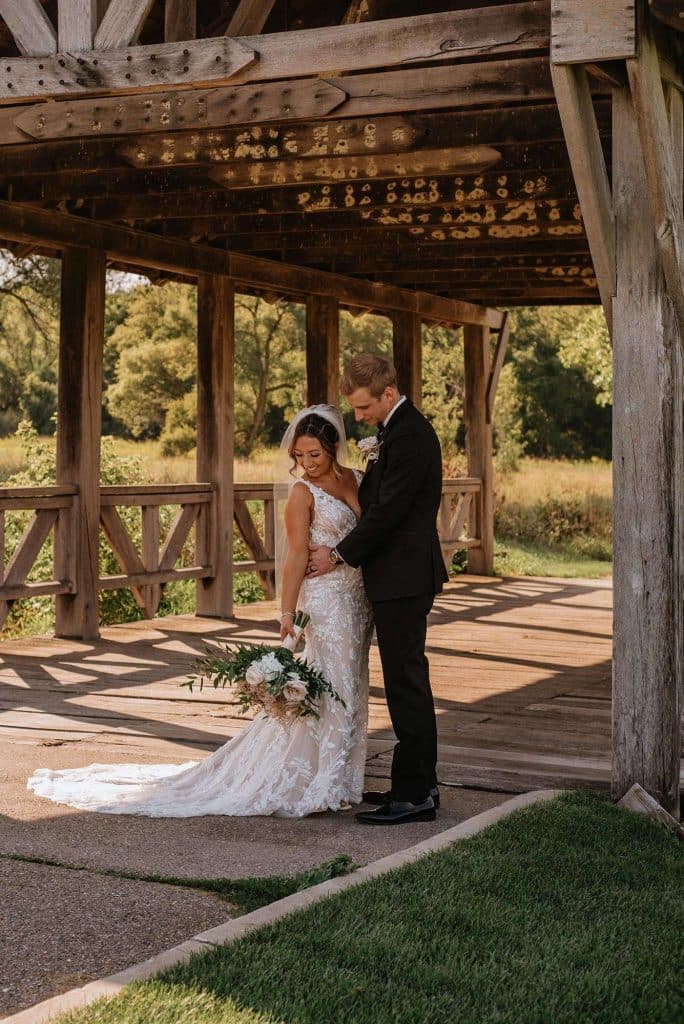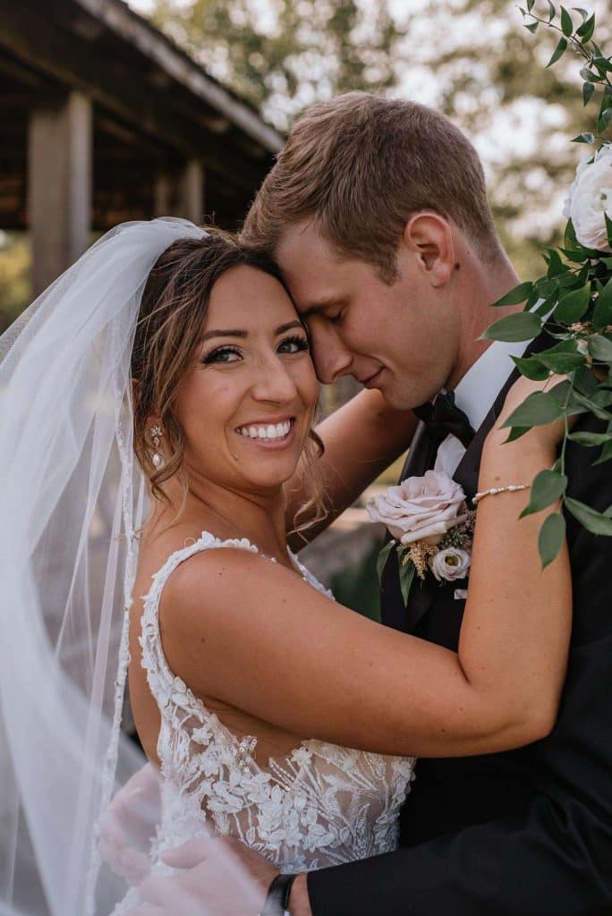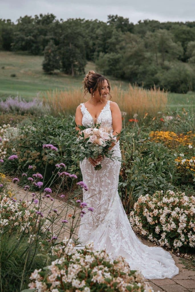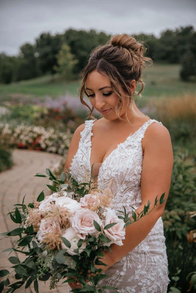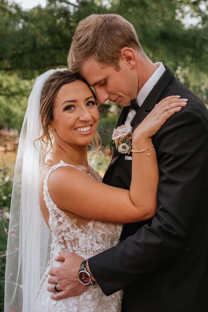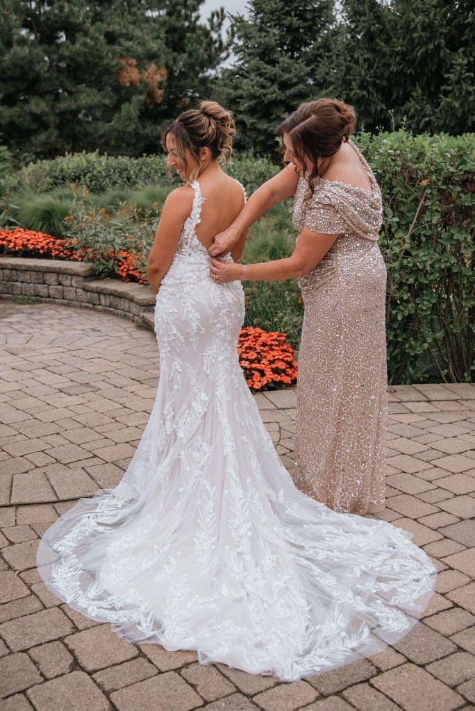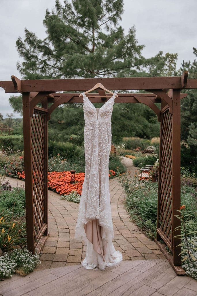Jess found her dream wedding dress, a Lillian West, at Grace and Lace in Richmond, Illinois. She knew it was “the one” when she had butterflies in her stomach and her mom and sister teared up when she tried it on.