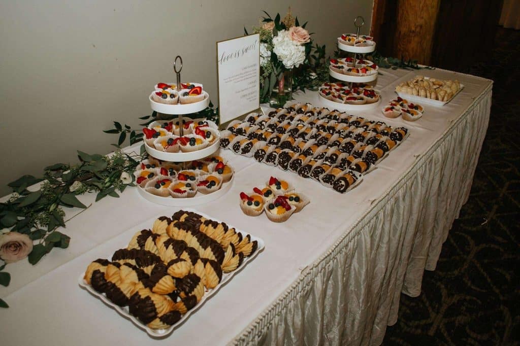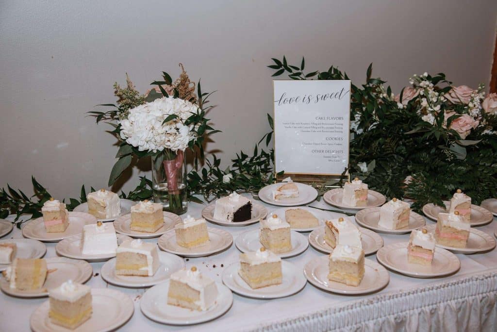 Everything on Jess and Tommy’s wedding menu, catered by the venue, was delicious. Hors d’oeuvres served during cocktail hour included Southwest egg rolls, buffalo chicken skewers, bruschetta, and stuffed mushrooms. For dinner, guests enjoyed ravioli, Italian baked fish, and sun-dried tomato chicken. Dessert featured three different flavors of cake from Blackbird Bakery in Burlington: yellow cake with raspberry buttercream, chocolate cake with vanilla buttercream, and yellow cake with vanilla buttercream. There were also cannolis, butter cookies, and summer tarts. The late-night snack, of course, was pizza!