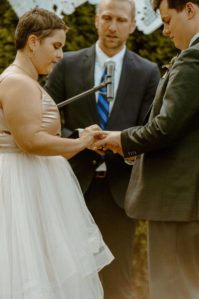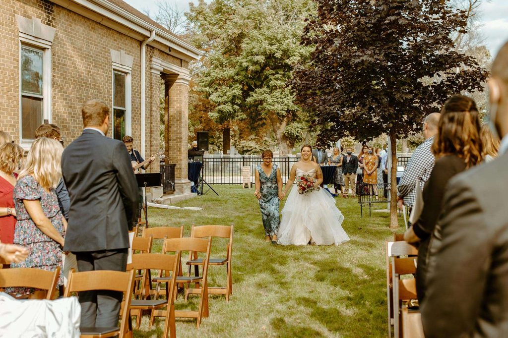 “We loved that we were still able to have our ceremony outside, even with the venue changes.” Schuyler and Lisa’s Christian ceremony was held on the lawn of the Story Hill FireHouse. Lisa’s mom walked her down the aisle, which meant the world. “My dad passed away very suddenly a few years back, so it was very important that she be the one to bring me to Schuyler,” Lisa says.