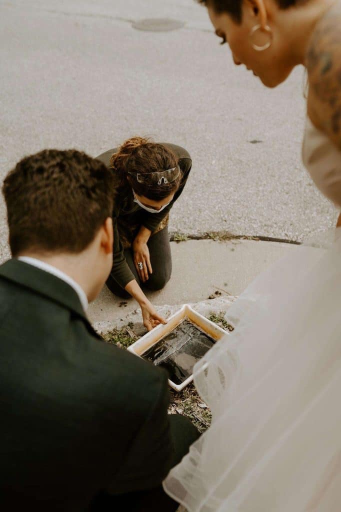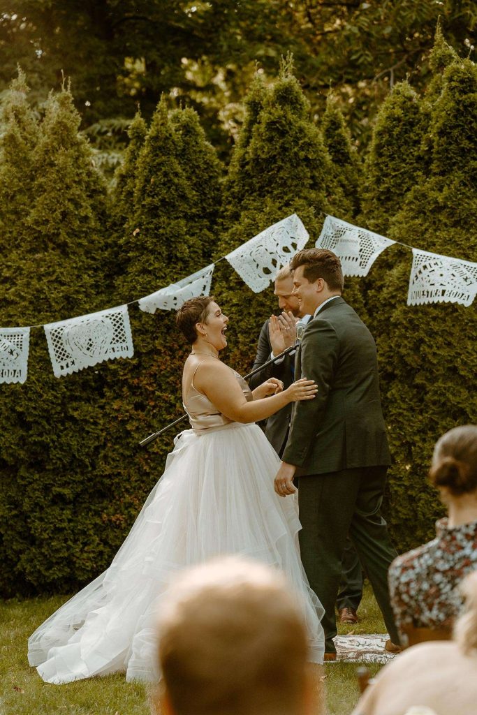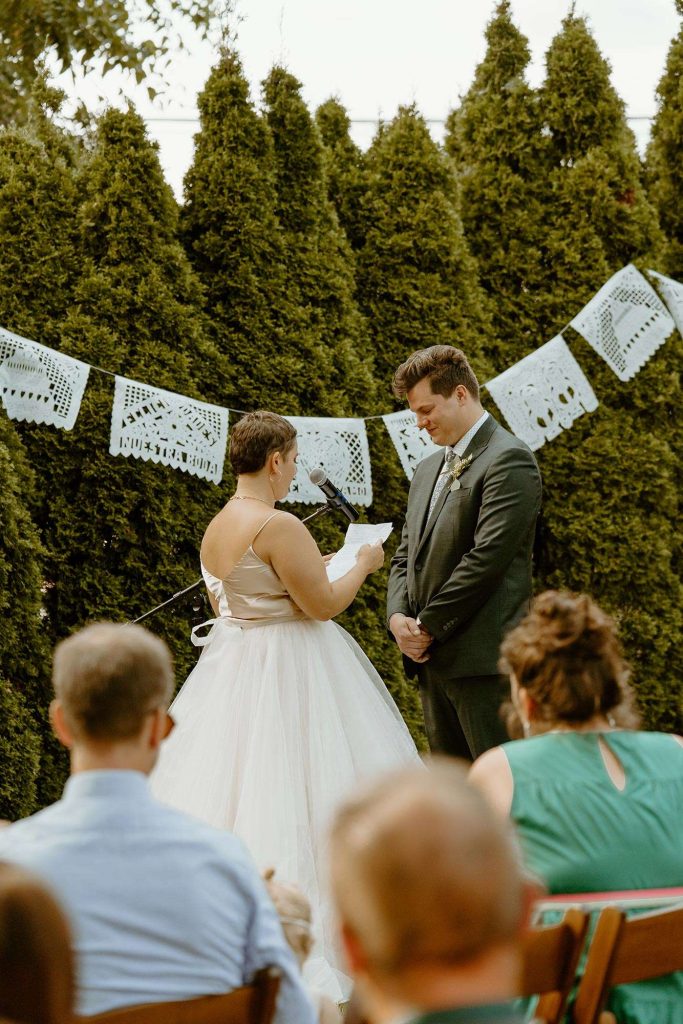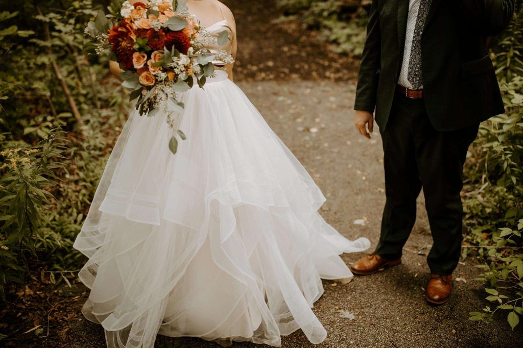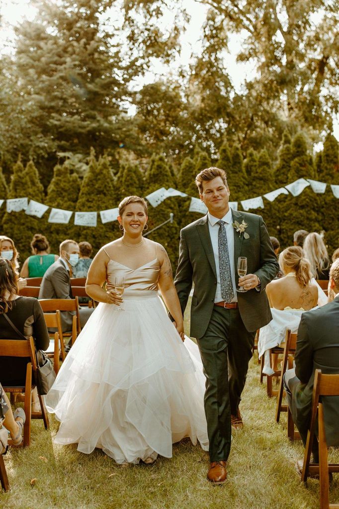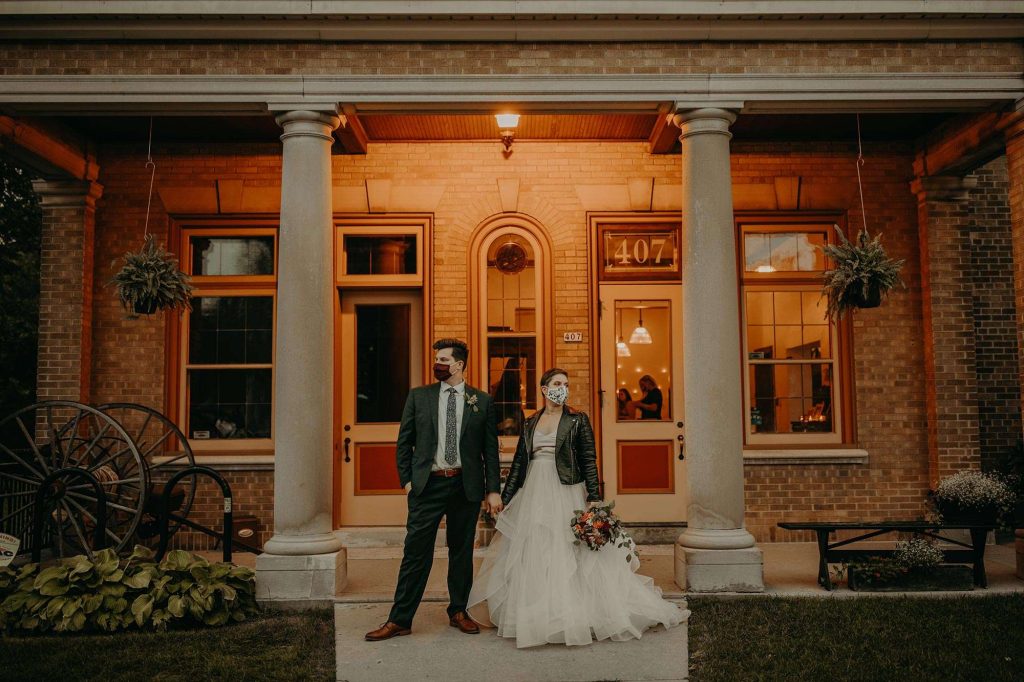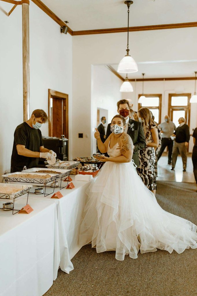 From cancelled venues to rethinking their color scheme to accepting a smaller guest list, Covid changed things for Lisa and Schuyler’s September 2020 wedding. “We weighed the pros and cons of having a wedding during a pandemic. We knew that no matter what, we wanted to get married on our wedding day, whether it was just us in a backyard with our family or having an intimate wedding, like we ended up having. We had about 85 guests. Everyone was told to bring masks, to wear them when sitting during the ceremony, and to wear them when inside, whenever possible.”