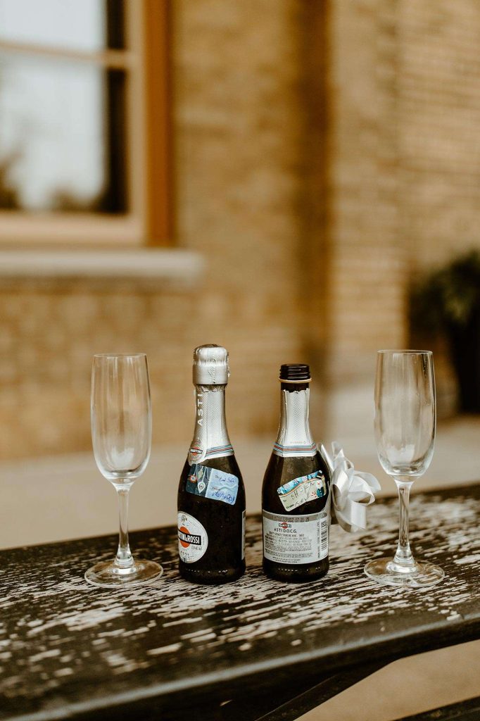 After Lisa and Schuyler were announced husband and wife, there was a very special champagne toast. “Every year for Christmas, my dad would gift everyone splits of champagne bottles,” Lisa says. “This had become a traditional gift from my dad to us kids. He had gifted us bottles the Christmas before he passed, and we saved them to toast on our wedding day—to have him with us.”
