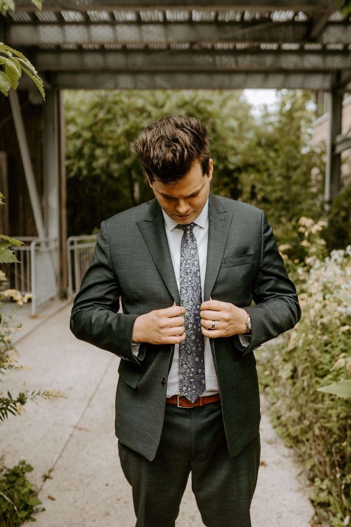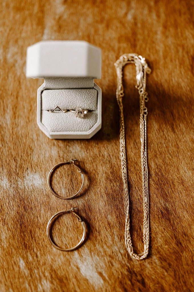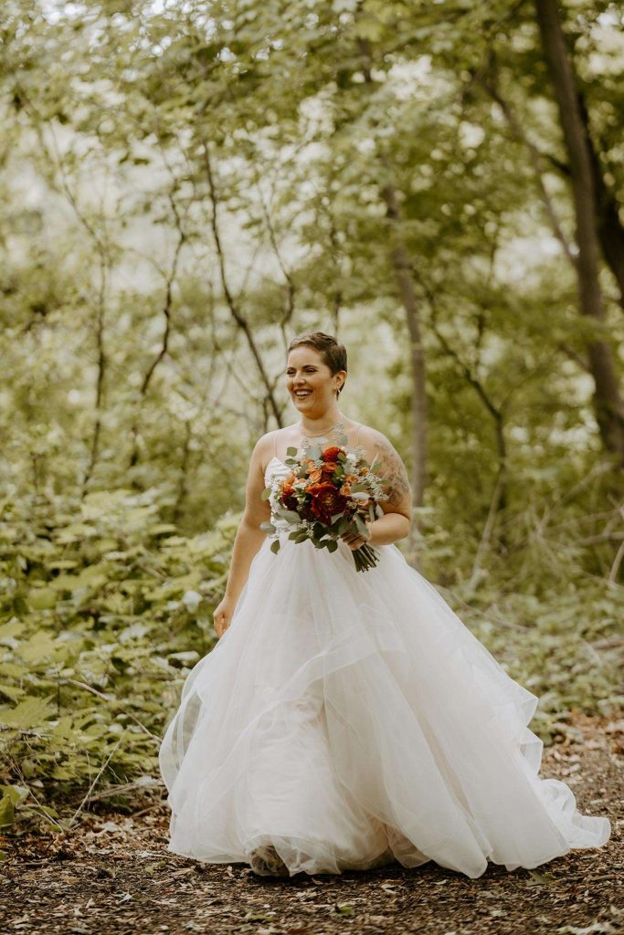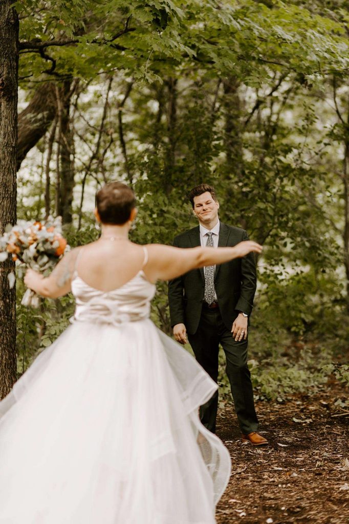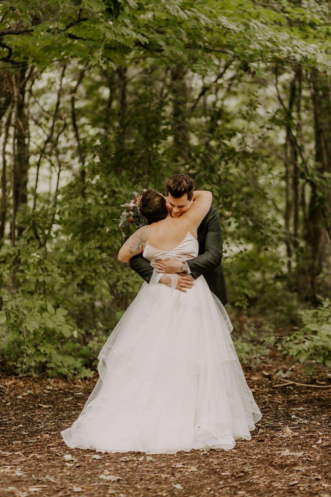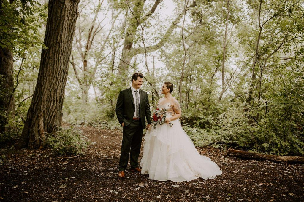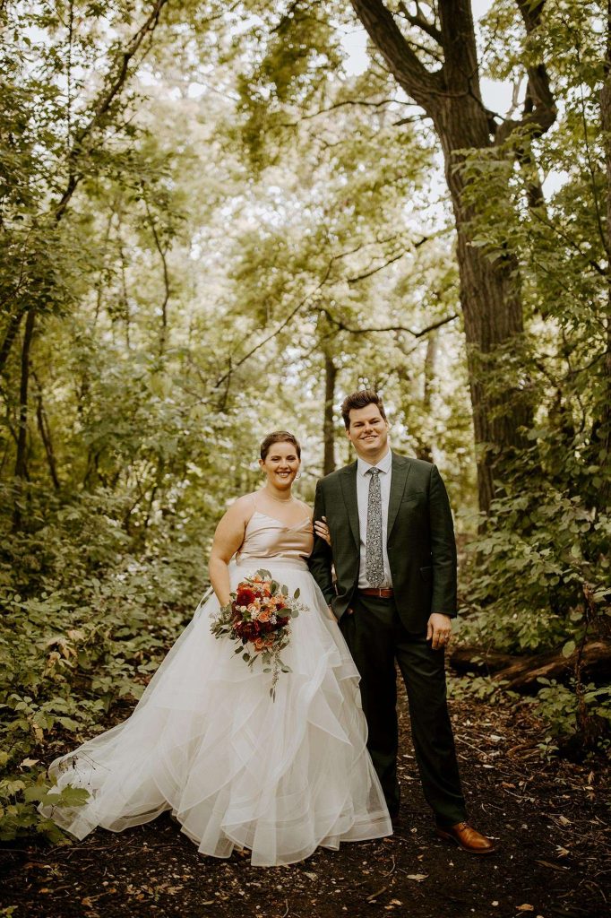 Schuyler and Lisa are big on hiking and exploring local, state, and national parks. “It makes sense that Schuyler proposed while we were doing our absolute favorite thing.” Lisa knew the proposal was imminent because Schuyler was using diamonds from Lisa’s grandmother’s wedding ring. “So I knew he had the ring, but I didn’t know how or when he was going to ask me.” Schuyler popped the question during a hike at Milwaukee’s Havenswood State Forest. “He kept it super simple,” Lisa says. “He got down on one knee, pulled the loose engagement ring (yes, loose!) from his flannel chest pocket, and asked me to marry him.”