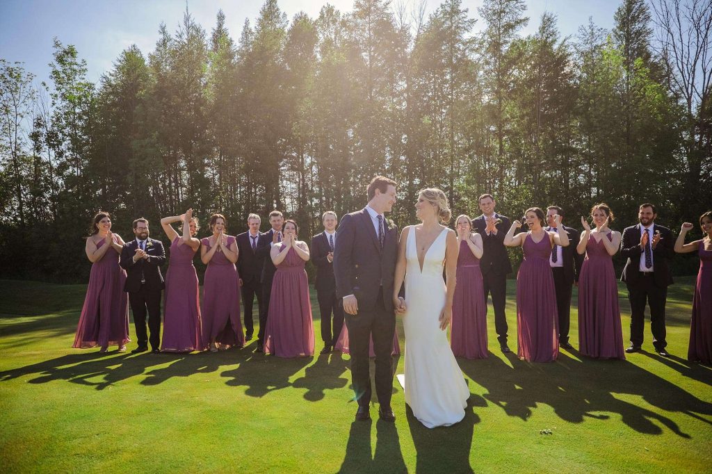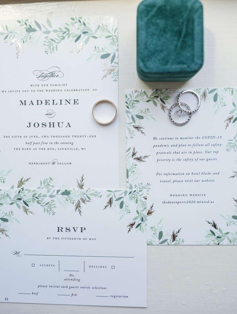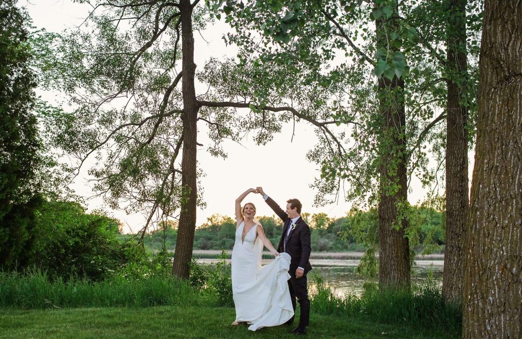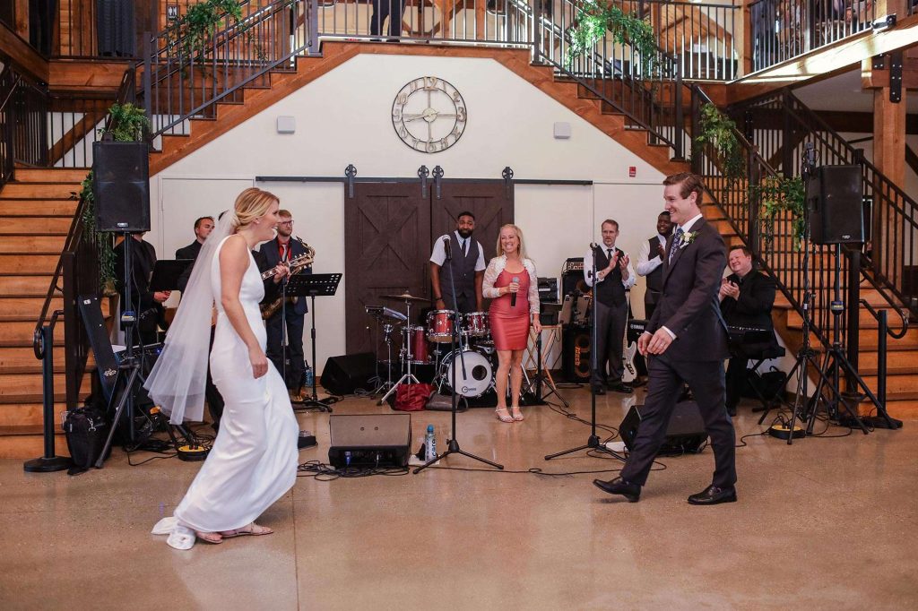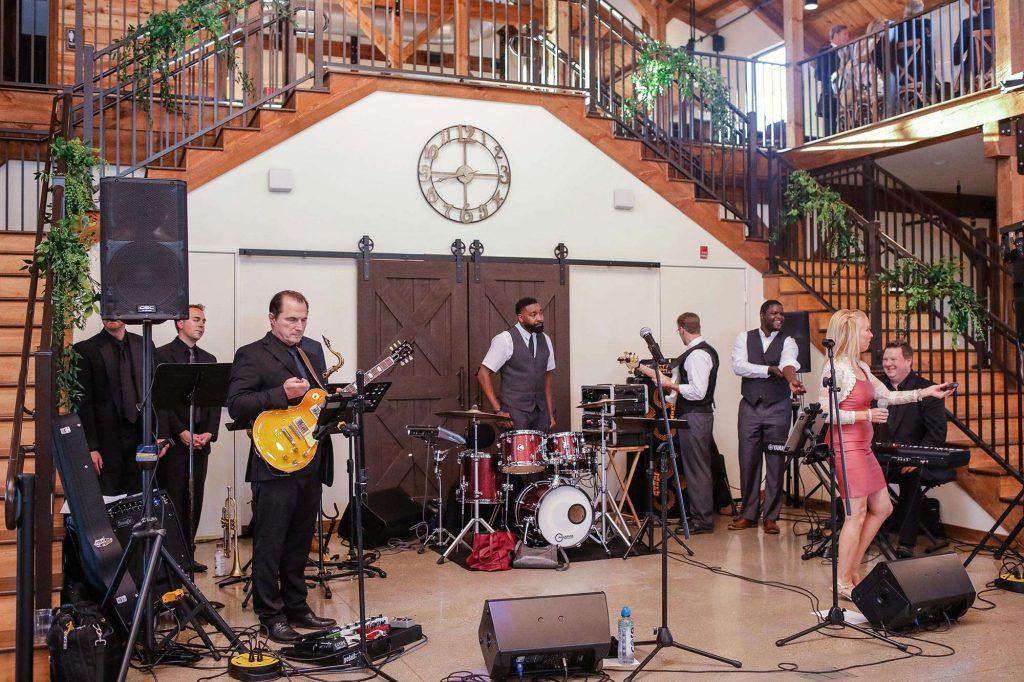 Madeline and Josh planned an elegant, rustic June wedding at The Barn at The Bog in Saukville, Wisconsin. The Bog is a world-class golf course that also hosts events. They chose a timeless color palette of green, white, and navy. For music, they booked the band Livin the Dream through ACA Entertainment. Livin The Dream is a 6 piece band, complete with a rhythm section and two dynamic singers. “They kept the dance floor moving!”