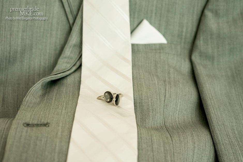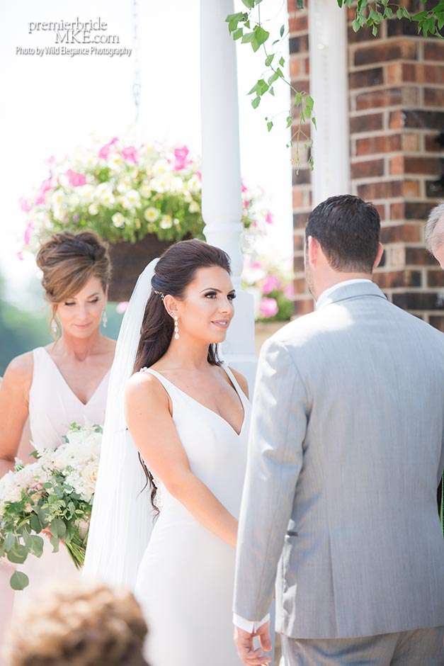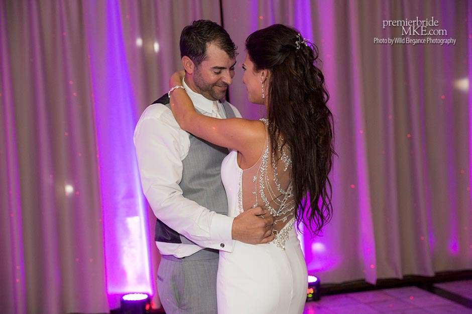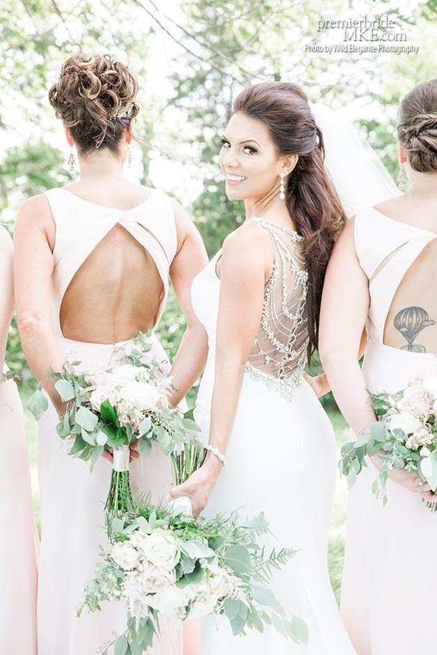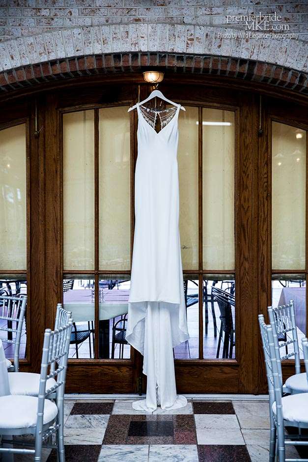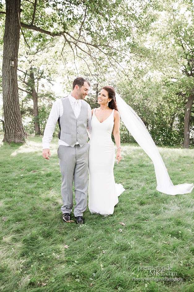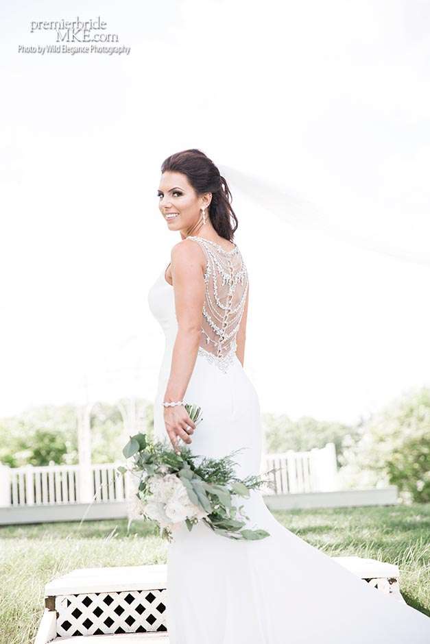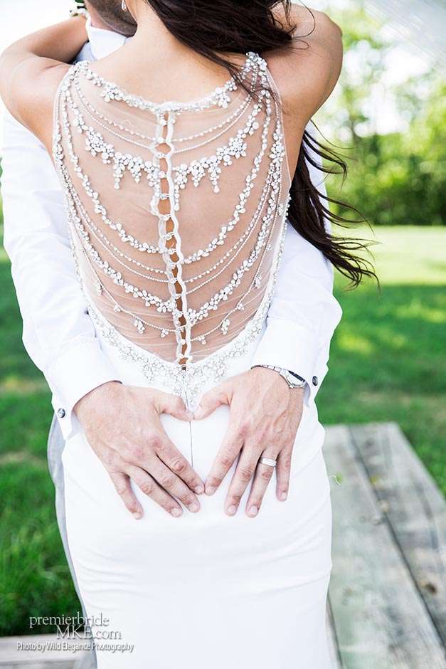 Maggie found her Enzoani wedding gown at White Dress — a boutique that, she says, really made the experience one to remember. “The boutique is fabulously decorated and the dress selection far exceeds any other bridal store in Milwaukee,” Maggie says. “The customer service was stellar. I felt like such a princess while I was trying on dresses. I knew exactly what I wanted: something simple with tasteful bling.” Maggie’s gown was just that — a simple silhouette with bling on the back.