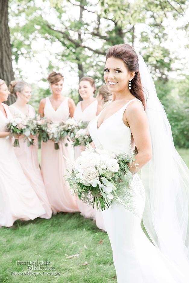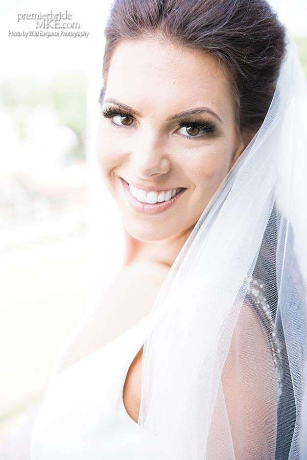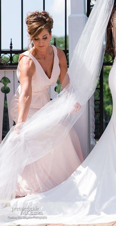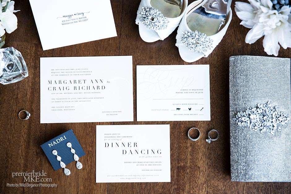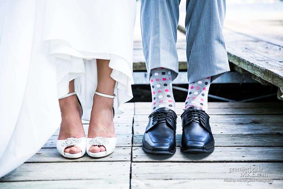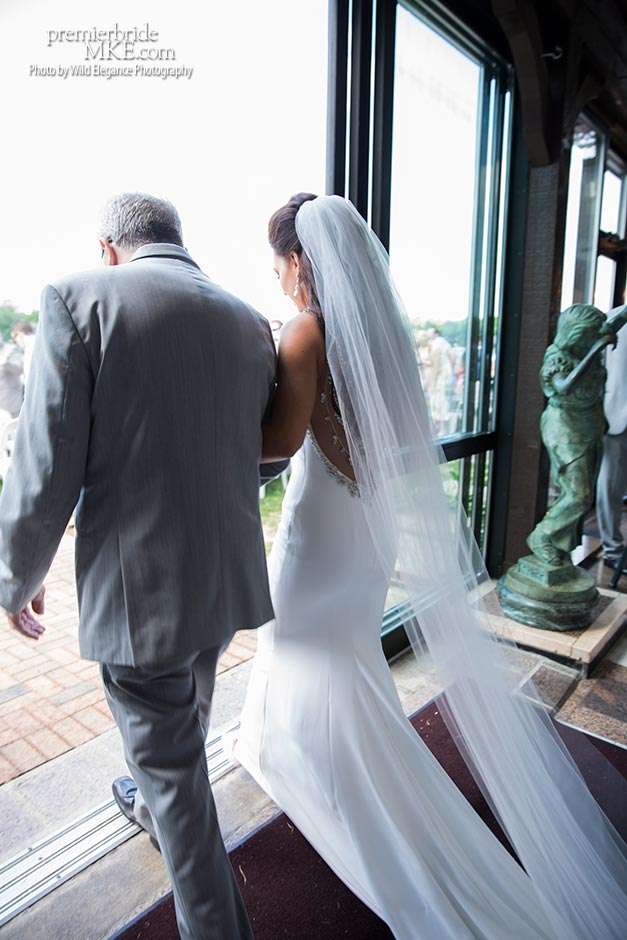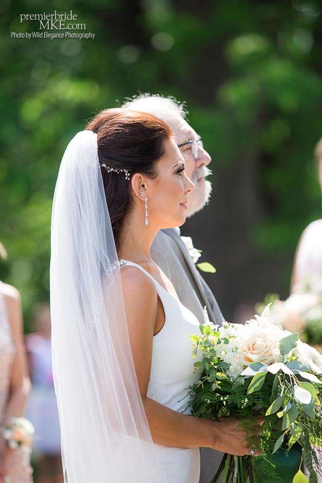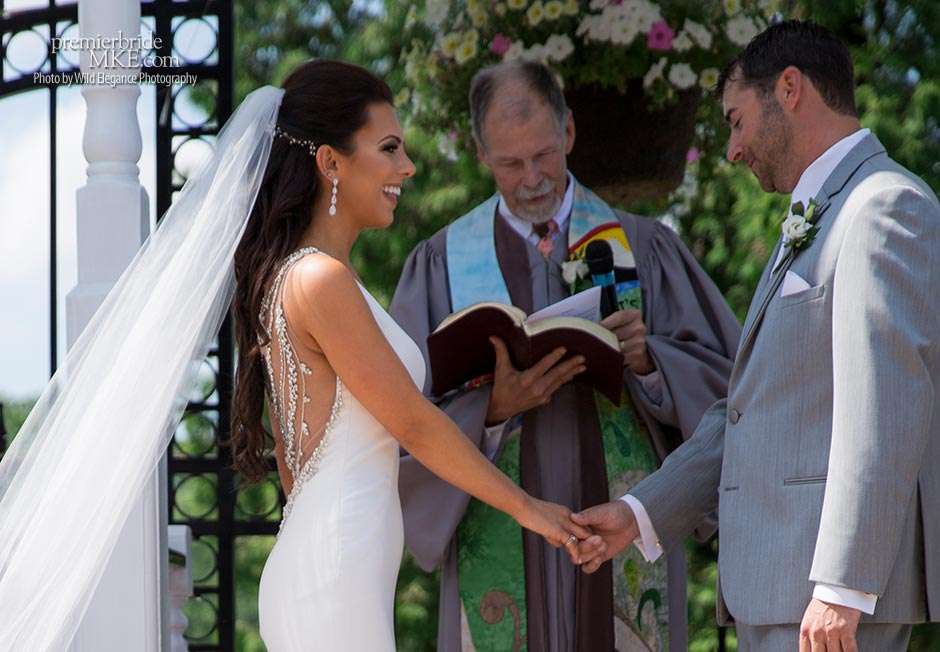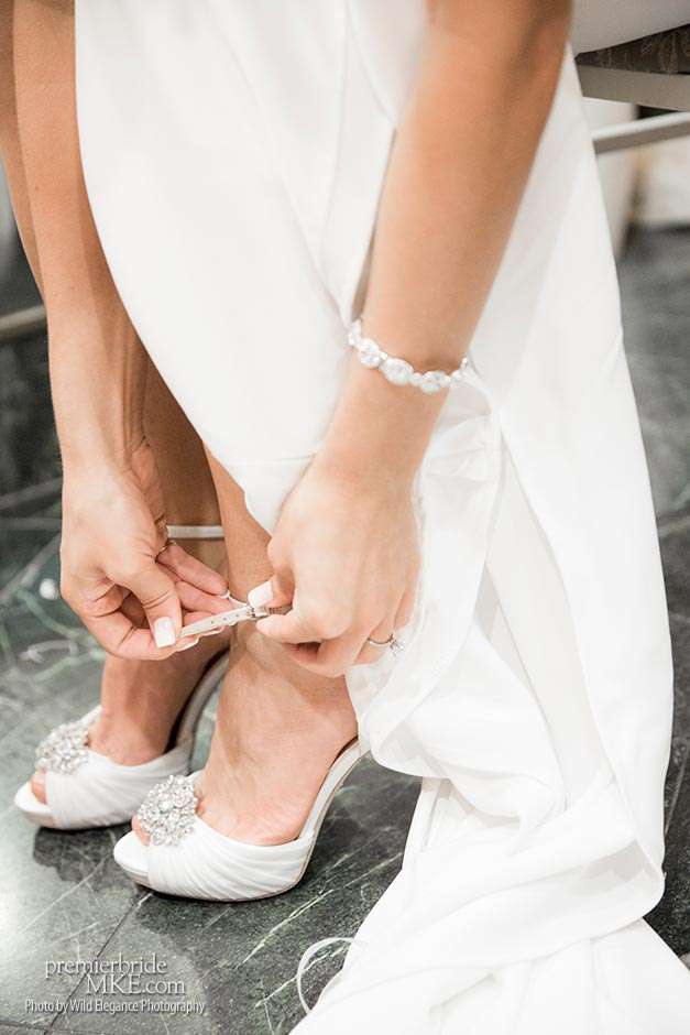 Maggie found her Enzoani wedding gown at White Dress — a boutique that, she says, really made the experience one to remember. “The boutique is fabulously decorated and the dress selection far exceeds any other bridal store in Milwaukee,” Maggie says. “The customer service was stellar. I felt like such a princess while I was trying on dresses. I knew exactly what I wanted: something simple with tasteful bling.” Maggie’s gown was just that — a simple silhouette with bling on the back.