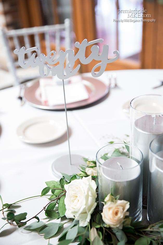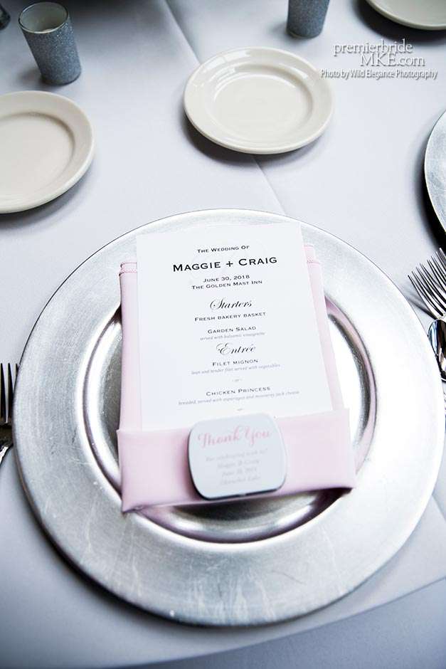 To decorate the reception space, the couple chose a color scheme of blush pink and silver. Maggie rented white floor-length tablecloths from Arena Americas, “because the Golden Mast had shorter ivory ones and I wanted white for a crisp look.” She also rented blush napkins and silver chargers — ”chargers totally transform a table.” Rented Chiavari chairs completed the room’s gorgeous look.