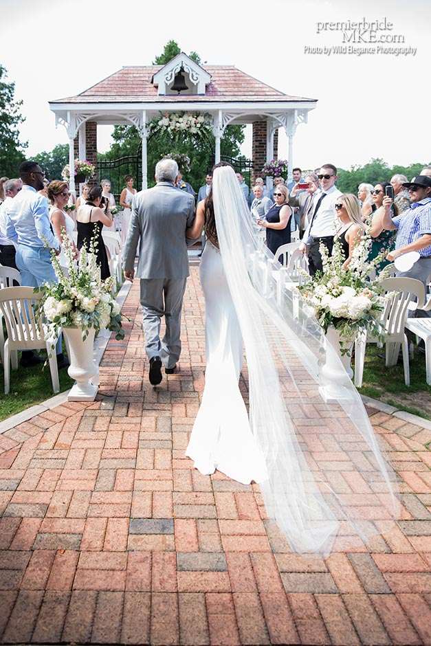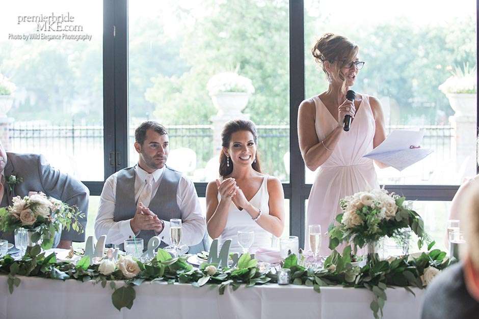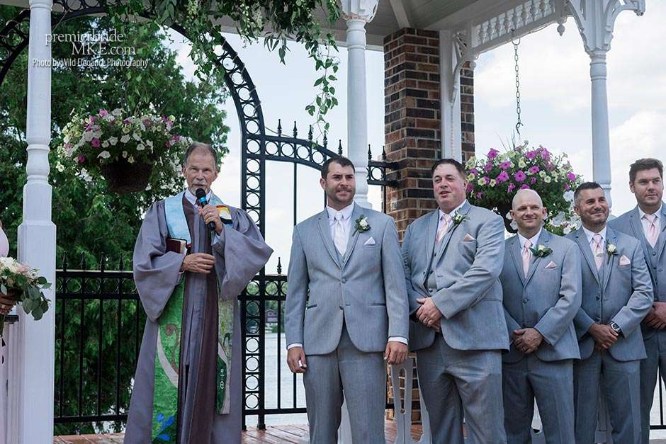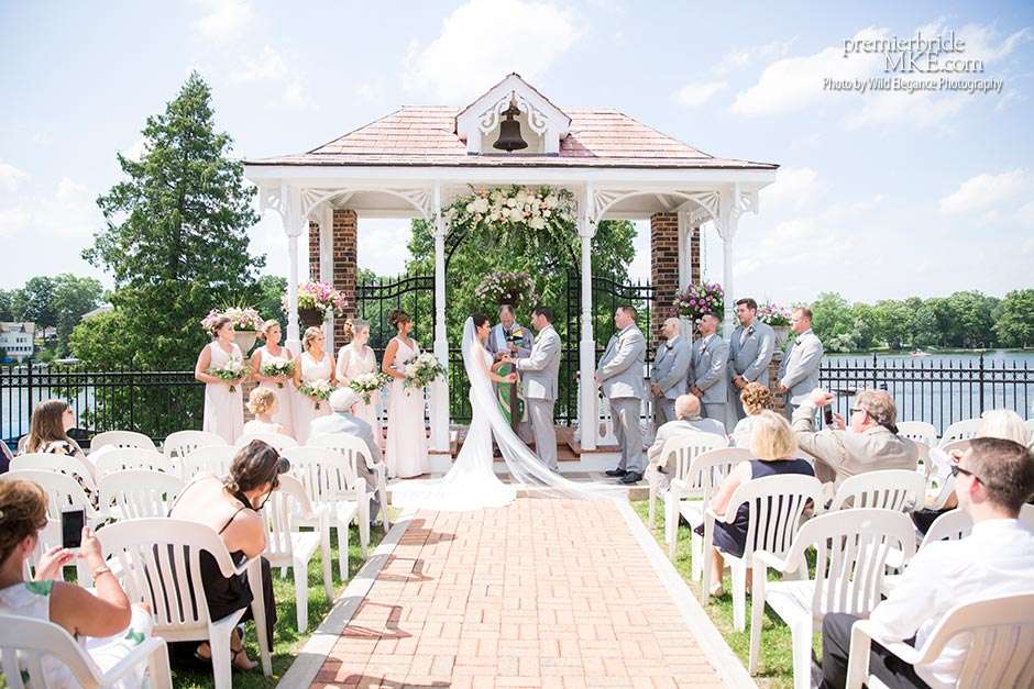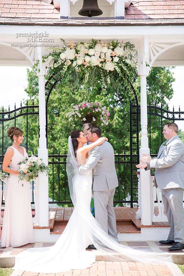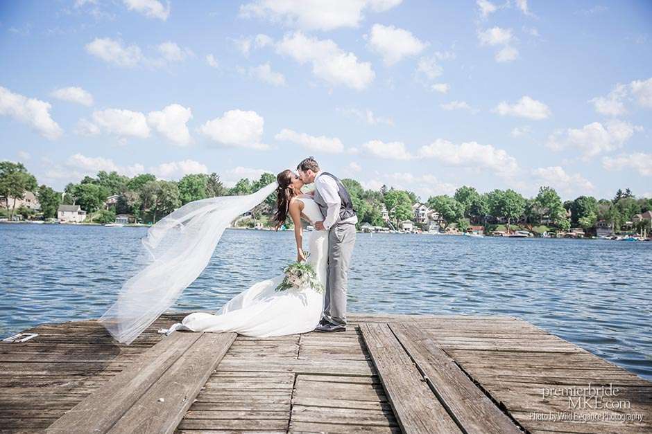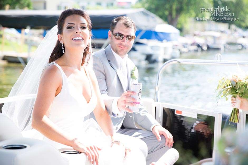 Following the sweltering ceremony, the newlyweds and the wedding party took two pontoon boats to an island on Okauchee lake. “We took all of our group photos there, which included beautiful greenery,” Maggie says. “Craig and I took some amazing photos on the island’s pier with the lake in the background. There was a breeze on the island, which made the 100-degree heat a little more bearable and made for some amazing veil shots!”