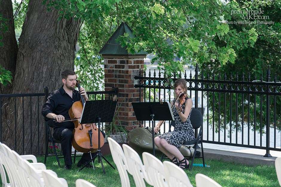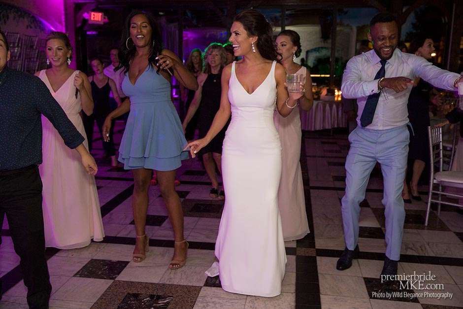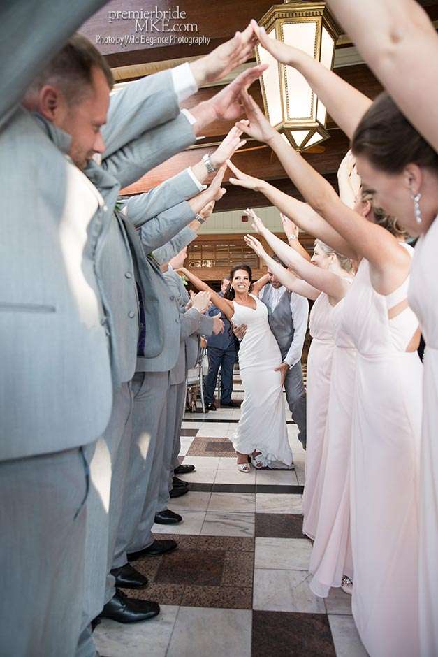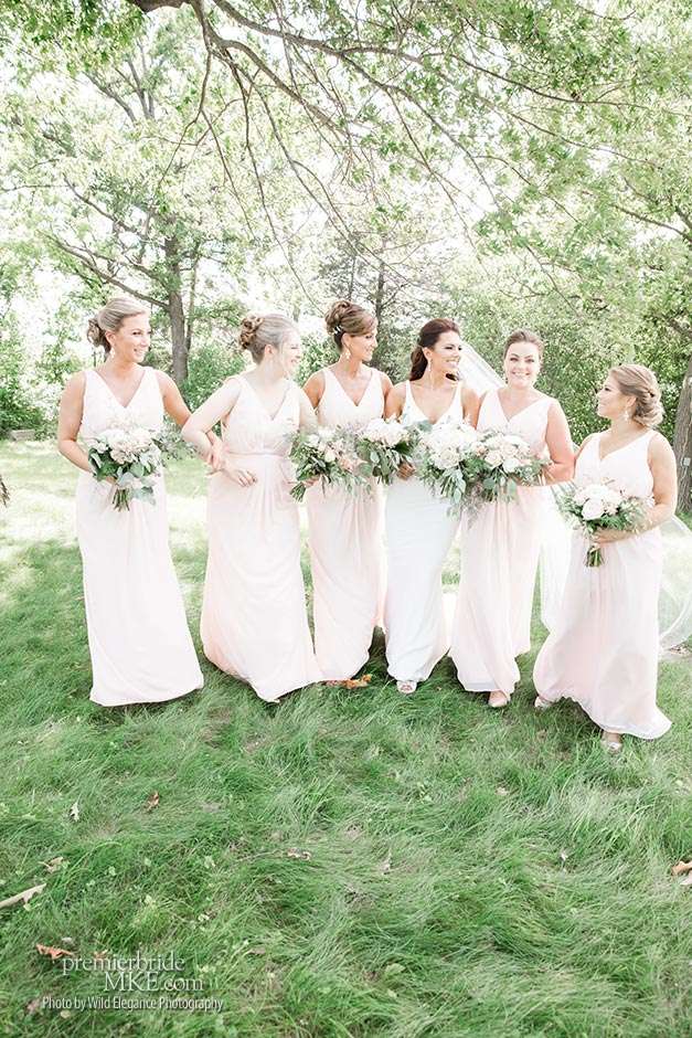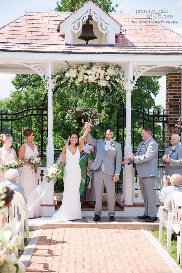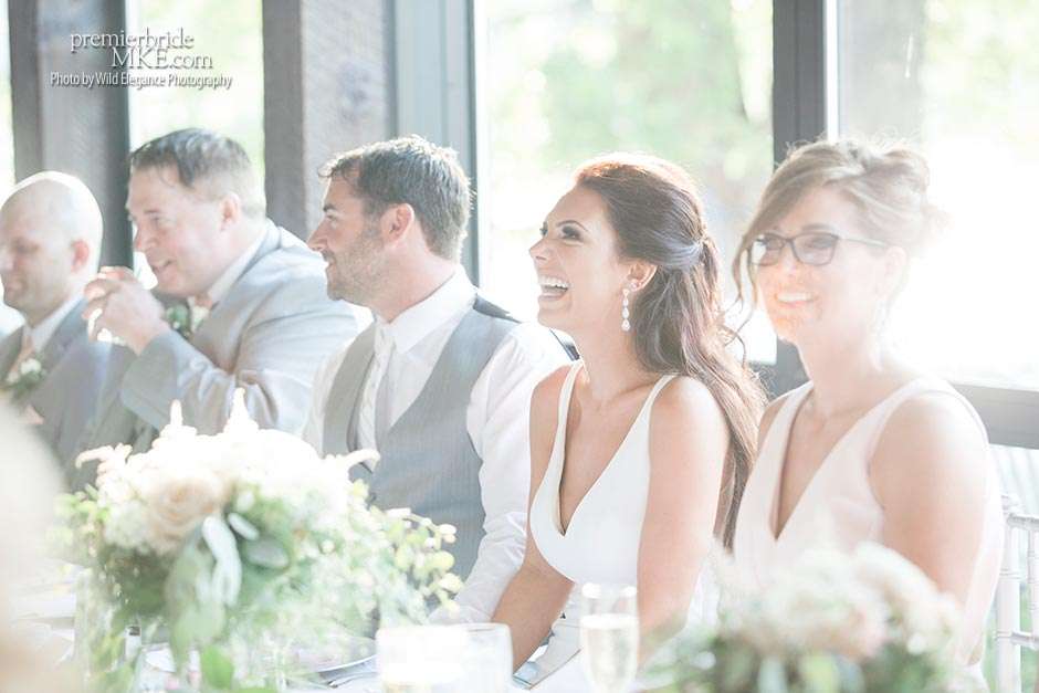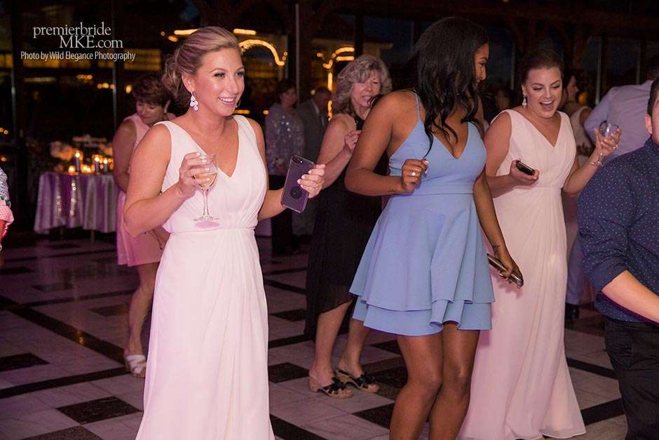 Following the sweltering ceremony, the newlyweds and the wedding party took two pontoon boats to an island on Okauchee lake. “We took all of our group photos there, which included beautiful greenery,” Maggie says. “Craig and I took some amazing photos on the island’s pier with the lake in the background. There was a breeze on the island, which made the 100-degree heat a little more bearable and made for some amazing veil shots!”