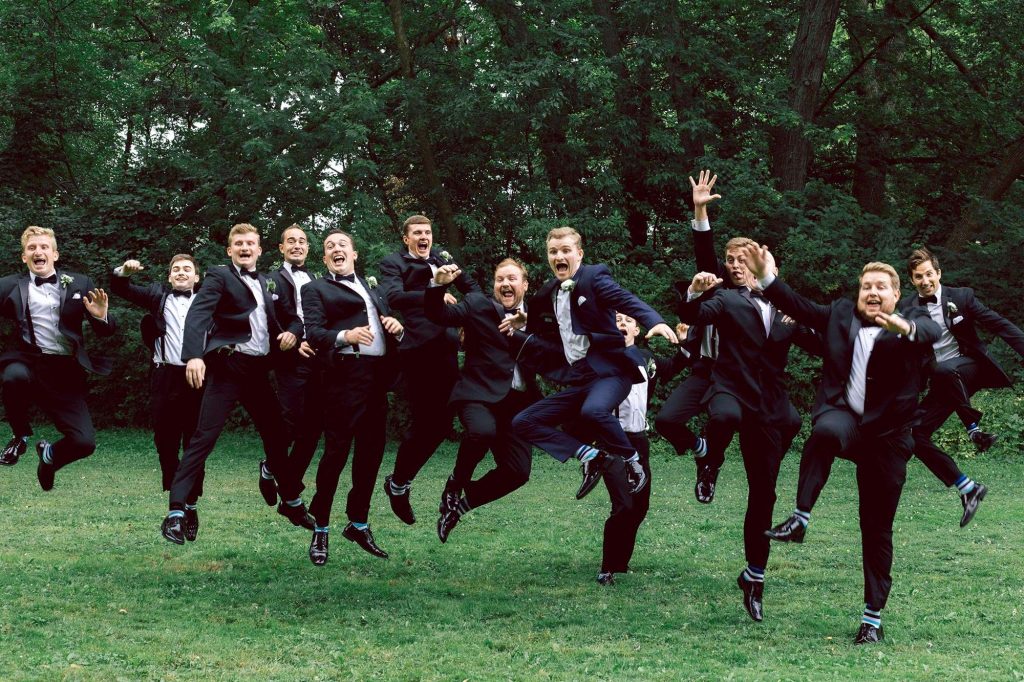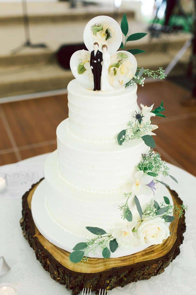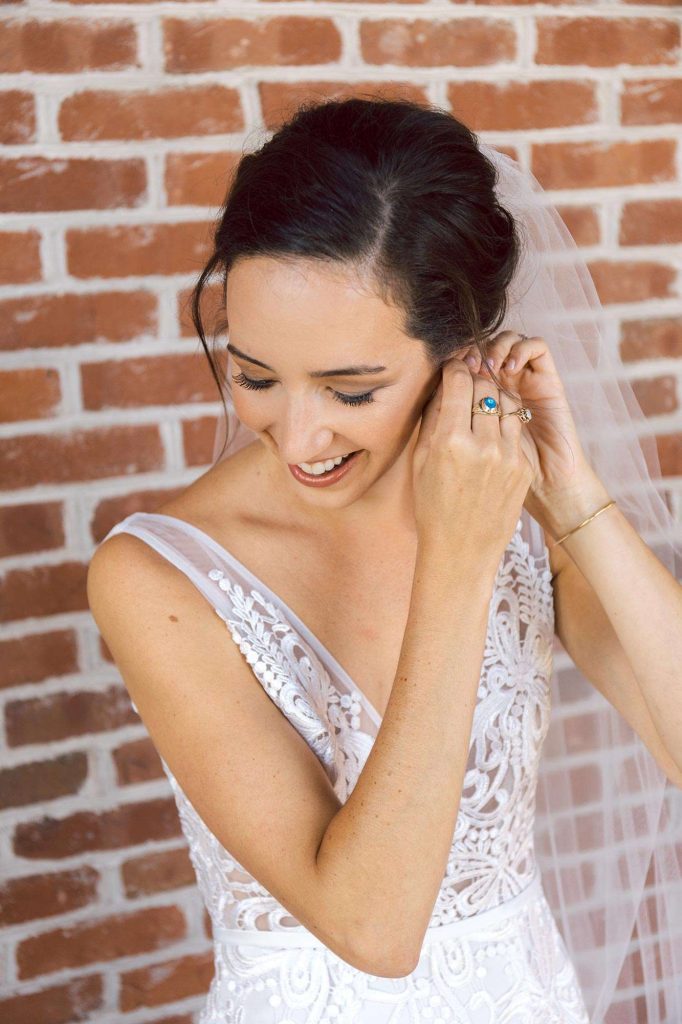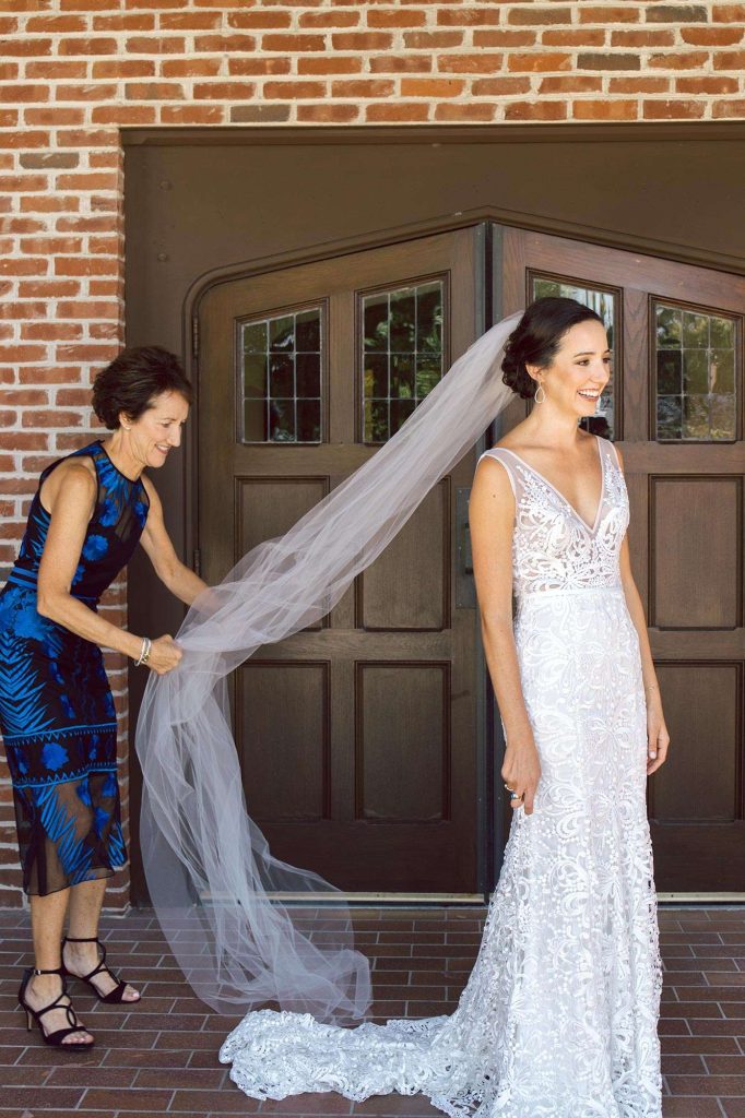 What did the bride and groom love most about their reception? “Just being with all our family and friends!” They also particularly loved the dances, with live music by Velocity of ACA Entertainment. “Our favorite parts were our first dance and our last dance at the end of the night with everyone on the dance floor.” To really go out with a splash, the entire bridal party and lots of their friends all jumped into the pool at the very end of the night.