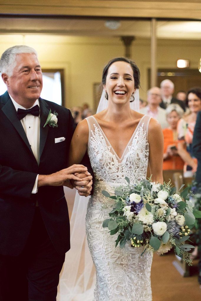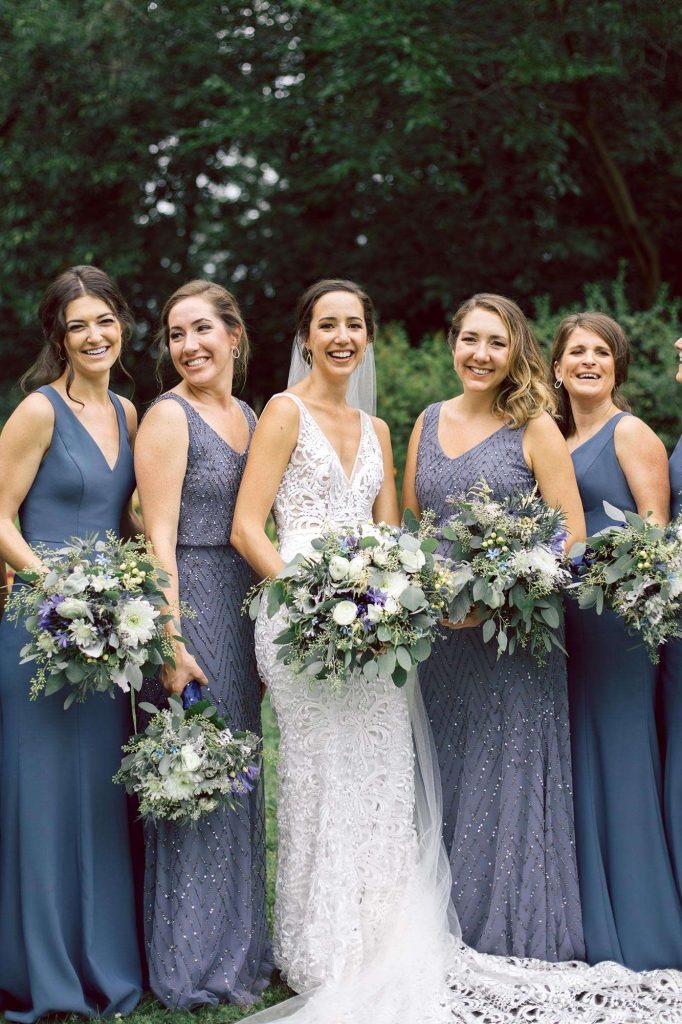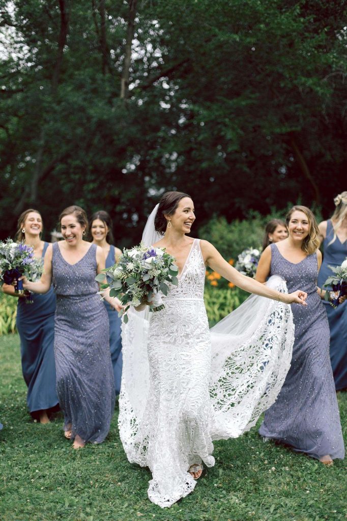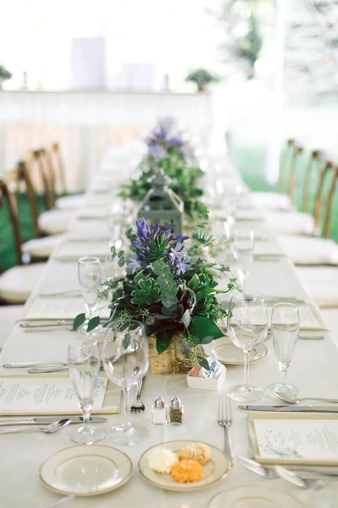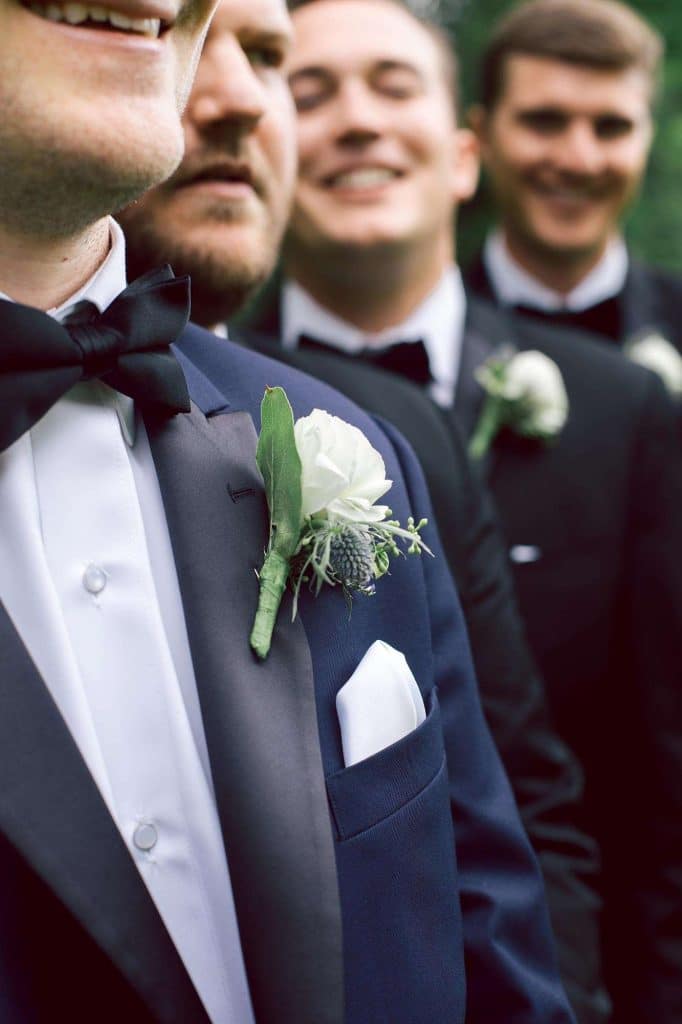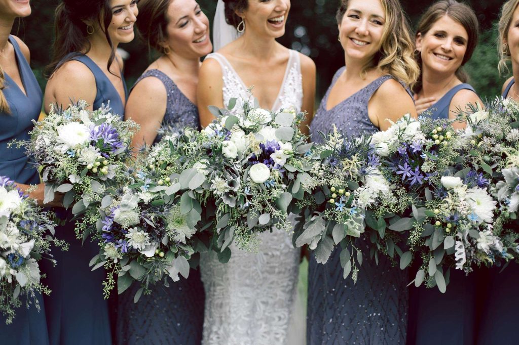 The vibe of the wedding was one of natural beauty, with colors of hydrangea, navy, and greenery. To bring together all the moving parts of a wedding at home, Maureen and Daniel relied on événement as their wedding consultant. Maureen found her gorgeous gown (with a killer train!) at Bucci’s Bridal. Daniel’s suiting came courtesy of DuBois Formalwear.