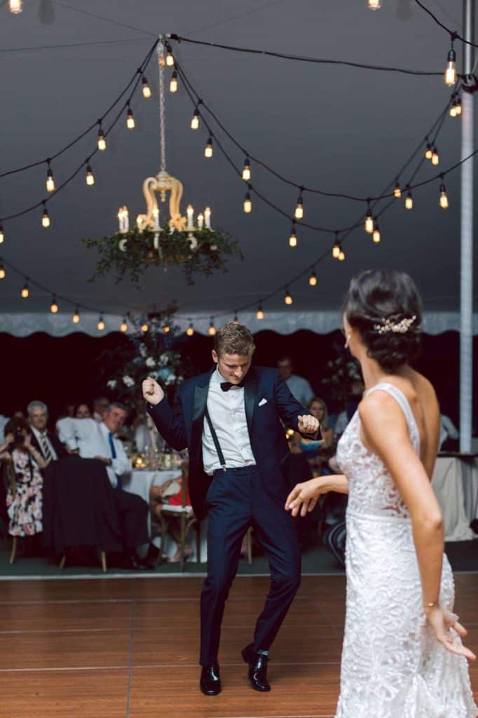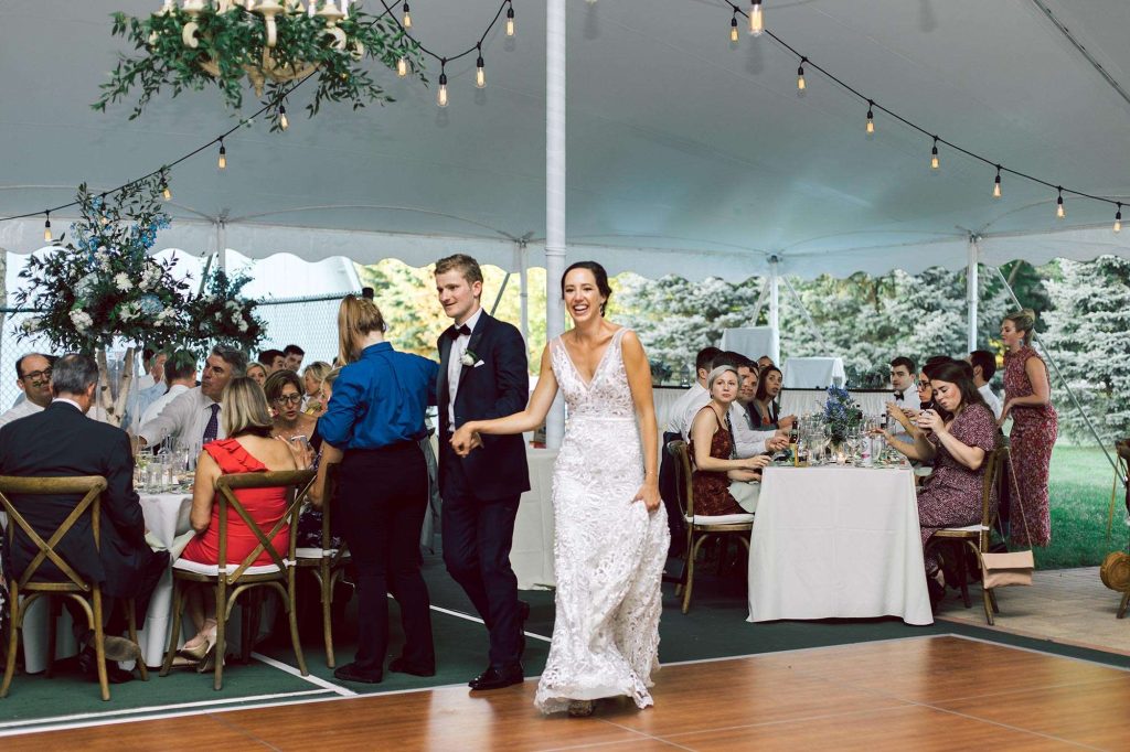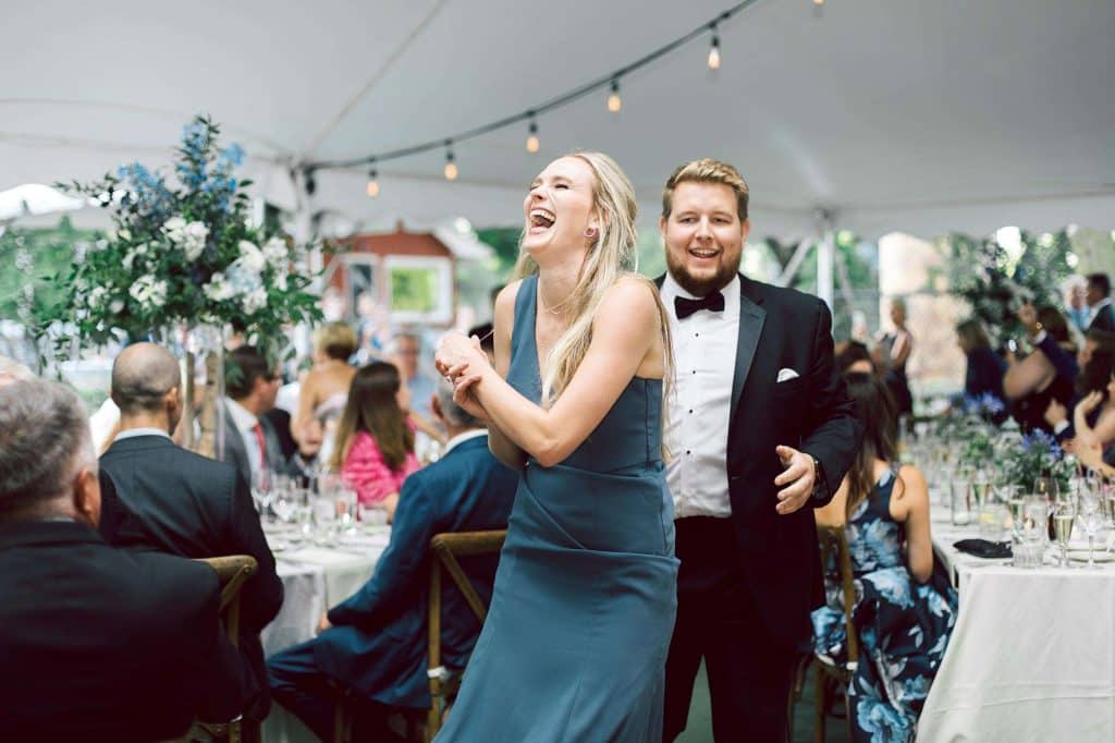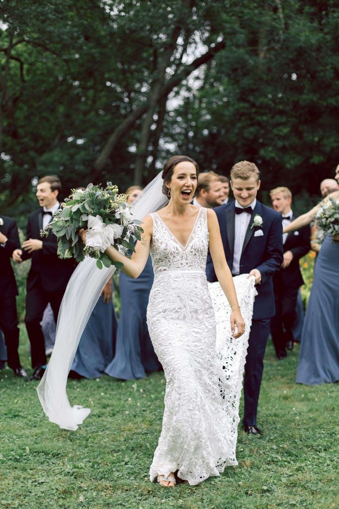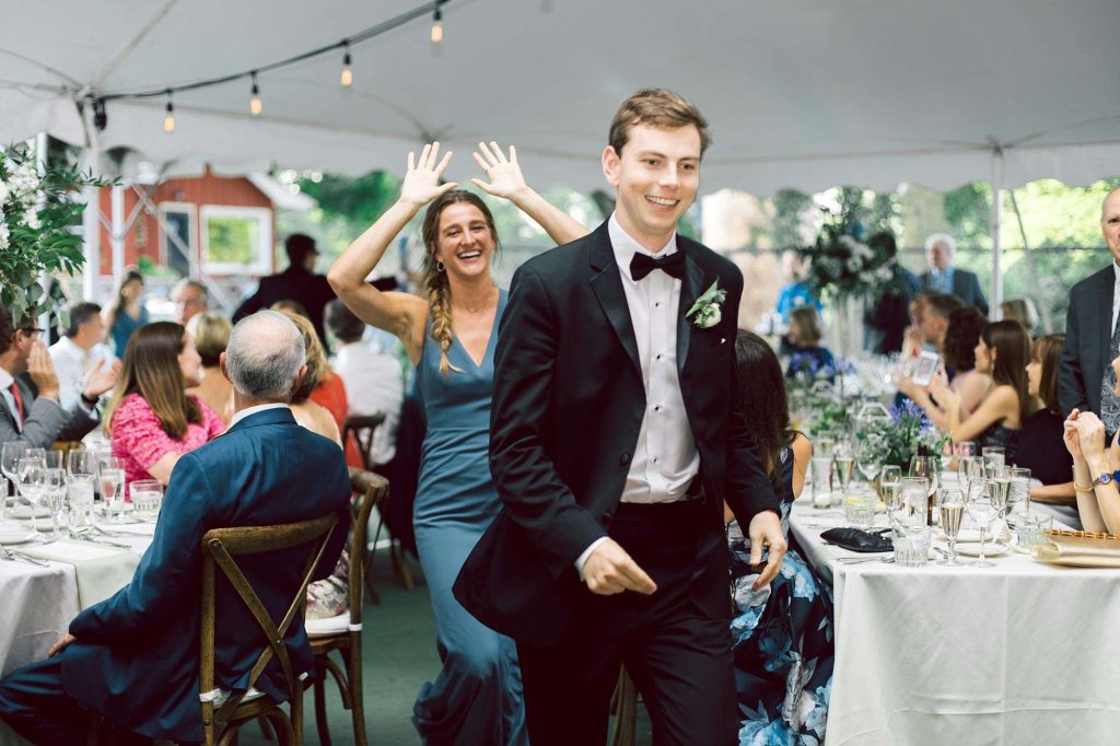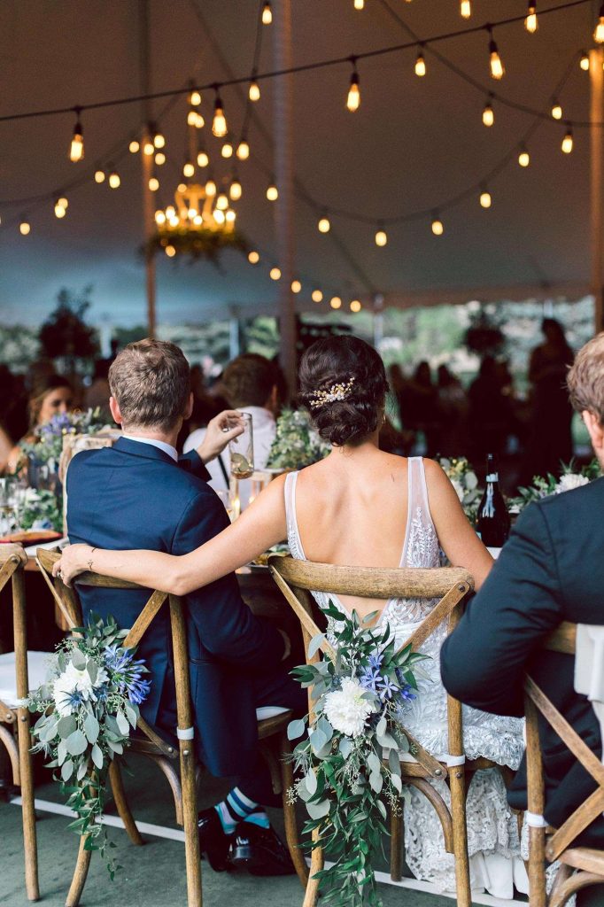 The vibe of the wedding was one of natural beauty, with colors of hydrangea, navy, and greenery. To bring together all the moving parts of a wedding at home, Maureen and Daniel relied on événement as their wedding consultant. Maureen found her gorgeous gown (with a killer train!) at Bucci’s Bridal. Daniel’s suiting came courtesy of DuBois Formalwear.