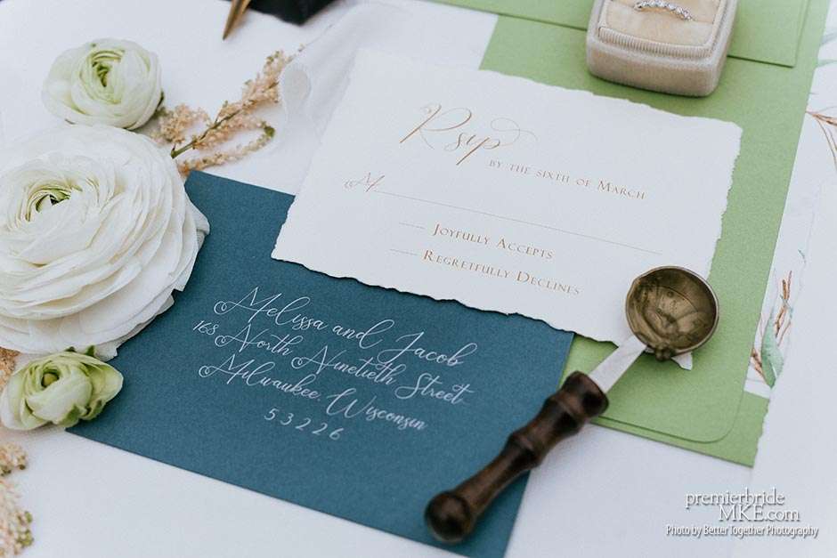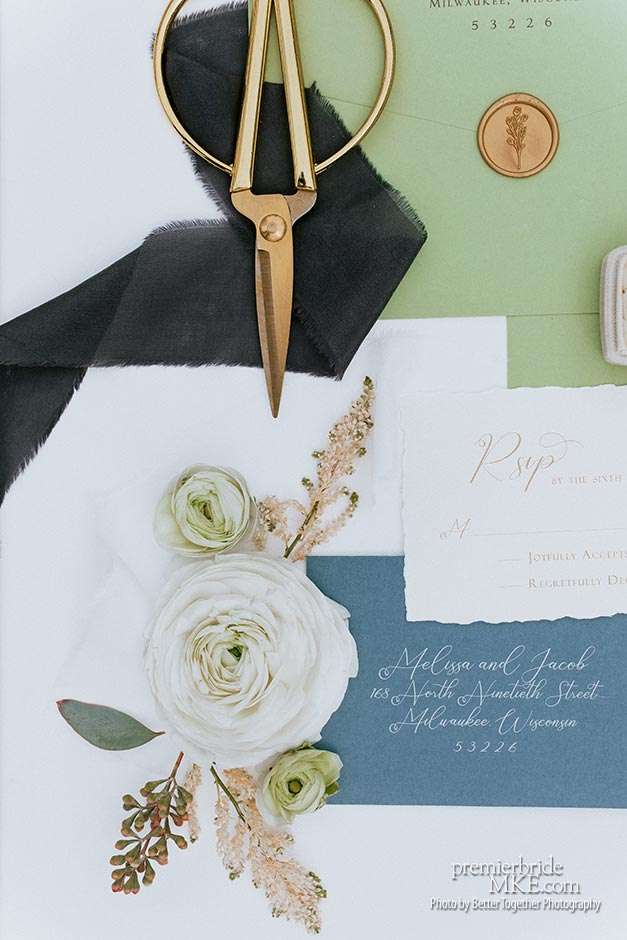 First up, Melissa naturally found her gown and bridesmaids dresses at Bucci’s Bridal. Rings came from Craig Husar, and invitations from Paperwhites. “Because of the short timeframe for planning, we did all of our invites by word of mouth and online. But I also wanted something to remember the date and venue by. Paperwhites was able to create a beautiful bridal suite, so there was an RSVP to photograph and eventually put into a shadow box. I loved the natural, raw paper with a mix of blue and green colors to create an Italian countryside feel.”