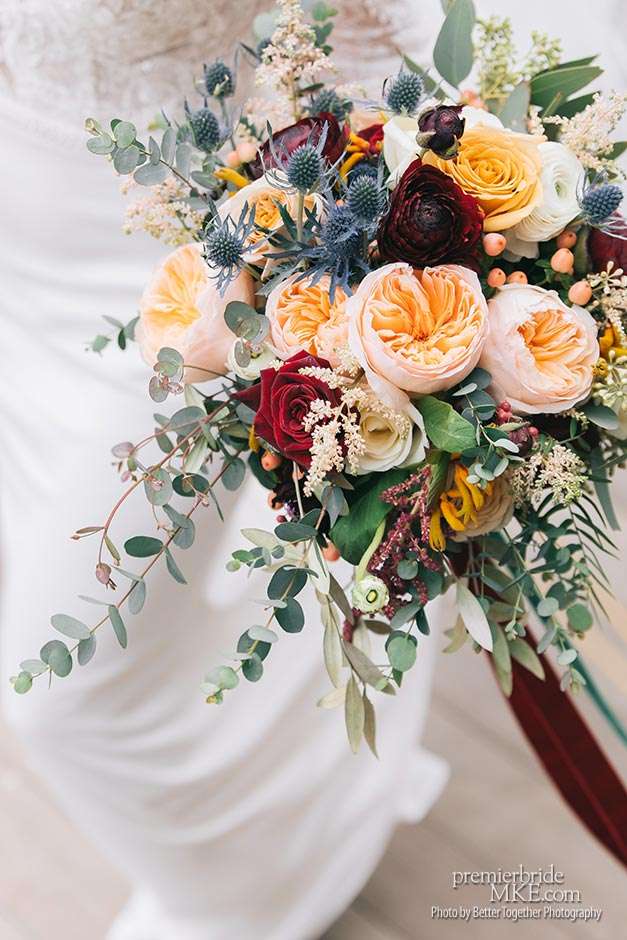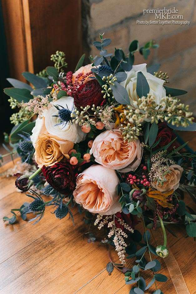 To decorate the space, Melissa worked with Bank of Flowers. She chose a color palette of sage green, dusty blue, butter yellow and orange, and soft pink and maroon. “I didn’t want a lot of décor, but I wanted an organic look to everything through our flowers. Bank of Flowers made a beautiful hanging floral installation for our wedding. They took my inspiration images and ran with it. The flowers were fresh and beautifully arranged. Some of the guests didn’t even think they were real!”