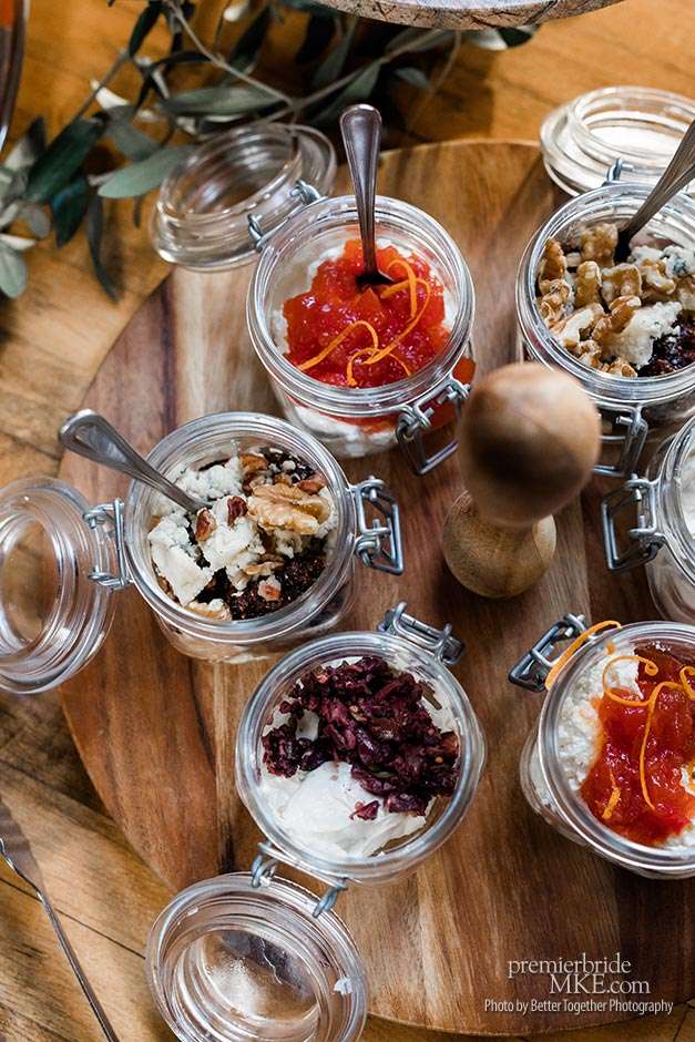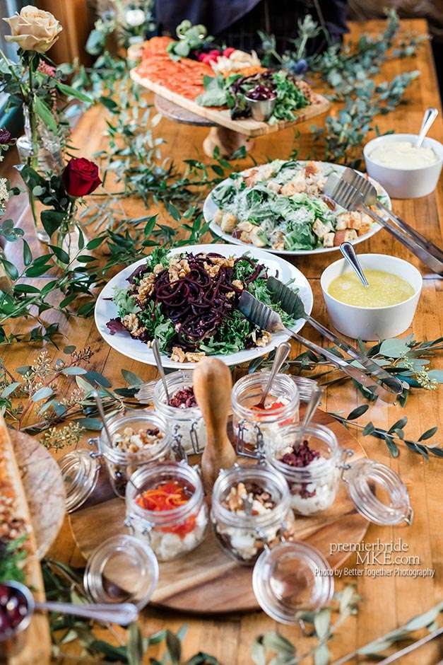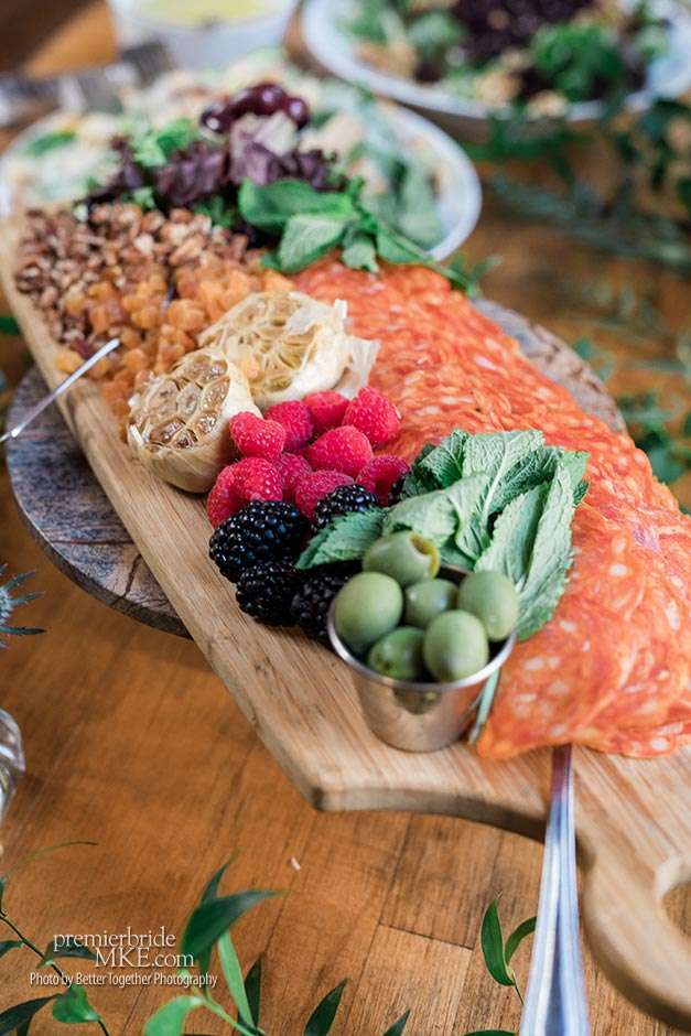 The reception was a chance for Jake and Melissa’s families to really meet each other and mingle. “It was nice to be able to go around and talk to everyone and relax without feeling like we were missing out on our day.” Dinner was served charcuterie style, incorporating a lot of different cheeses, meats, olives, spreads, salads, and pasta.