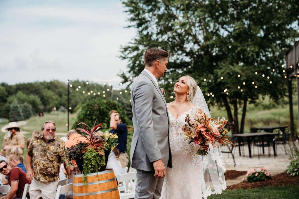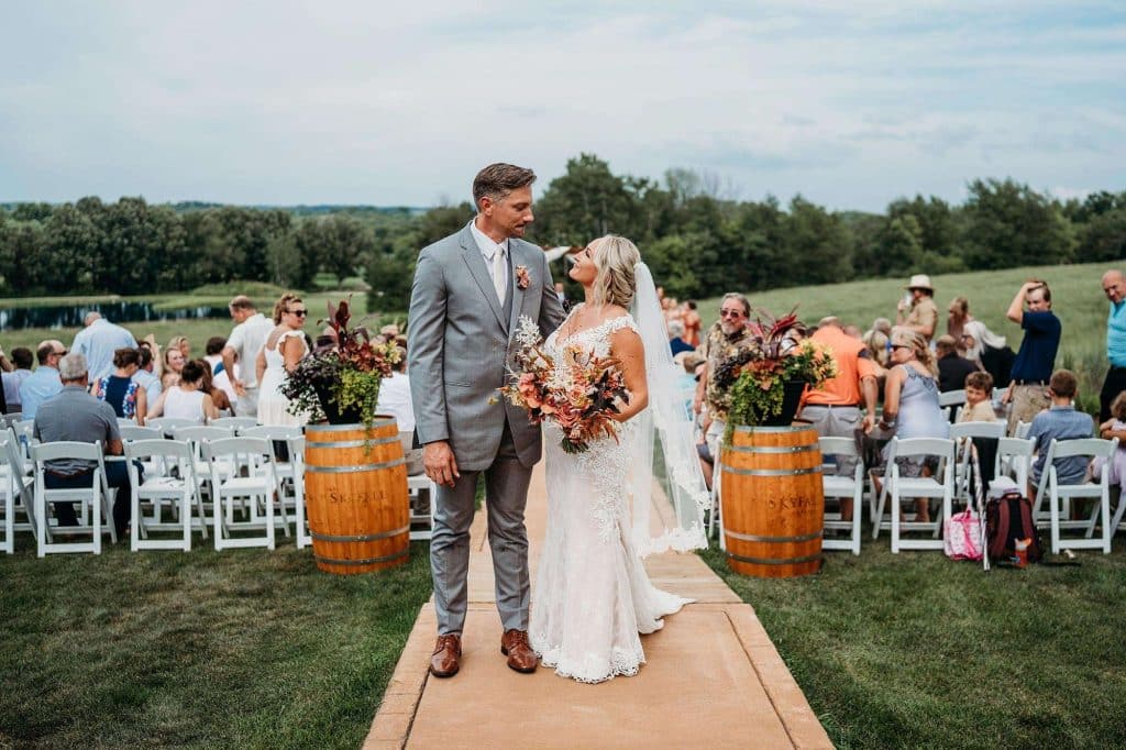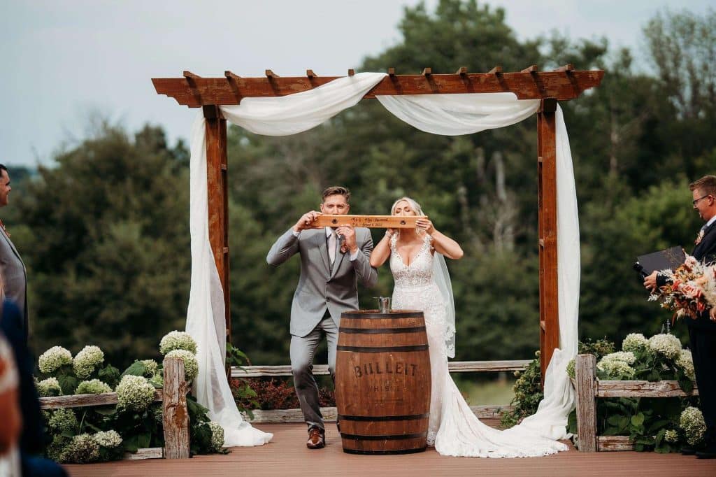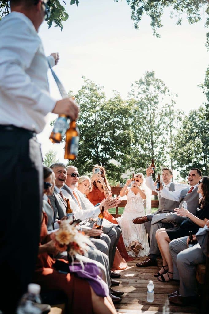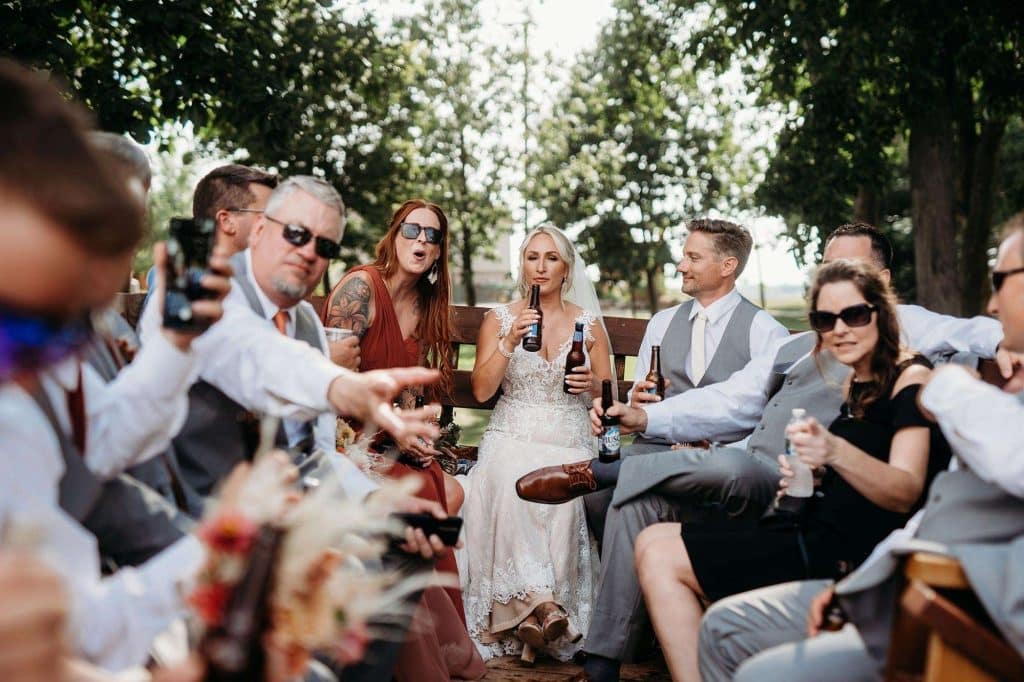 Jordan and Cory got married in August 2022 at Milford Hills in Johnson Creek. Their wedding day weather boasted a whopping 93 degrees, not atypical for late Wisconsin summer. One of Jordan’s friends served as the wedding officiant, which was an extremely special touch. Jordan and Cory wrote their own vows and even took a shot of tequila to make their union official. After the ceremony, the bridal party rode on a tractor-pulled wagon.