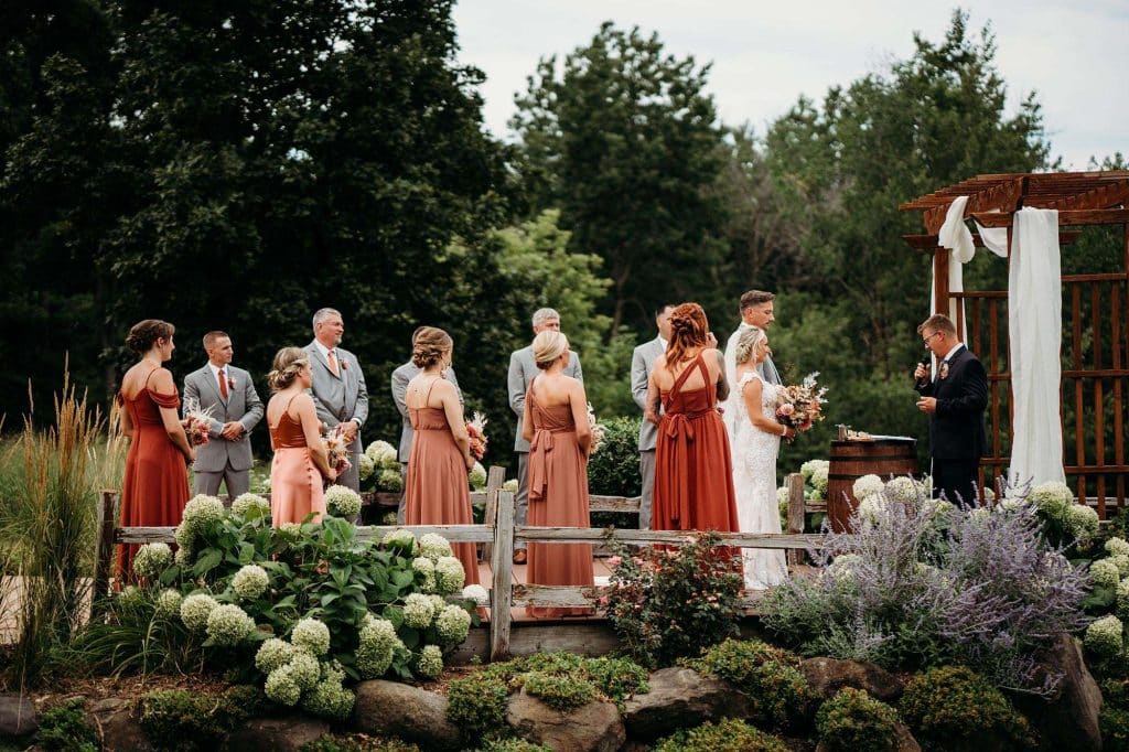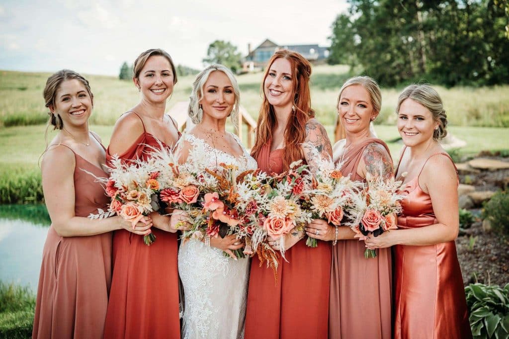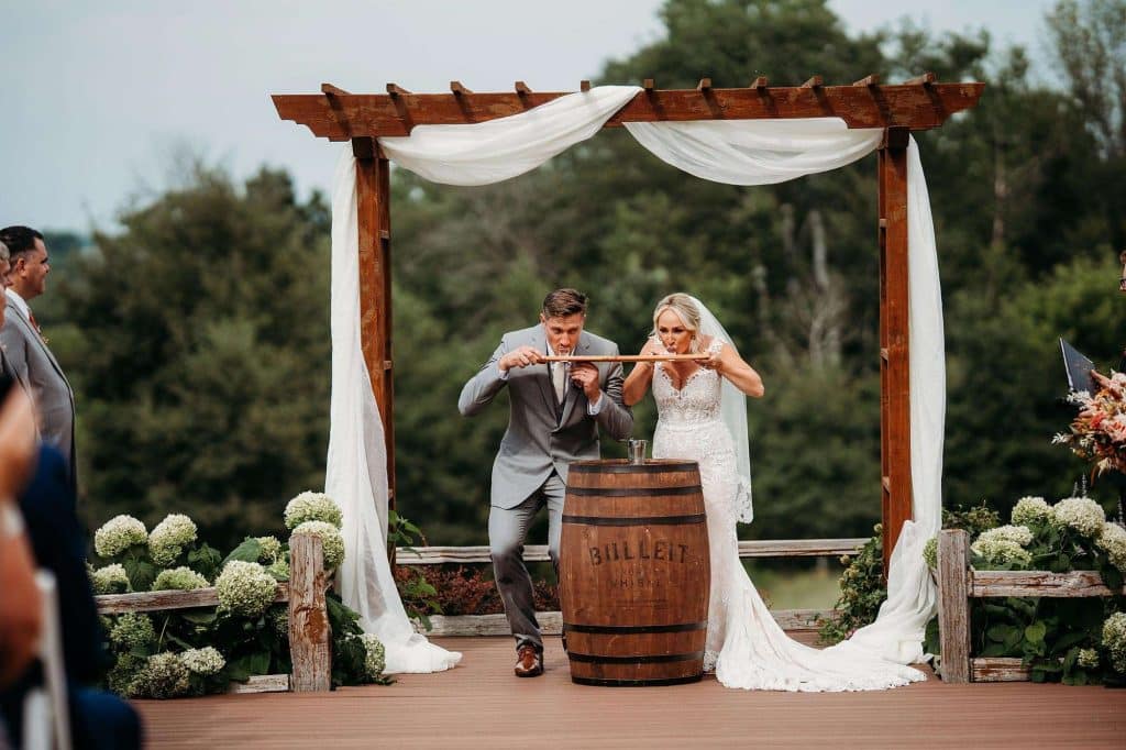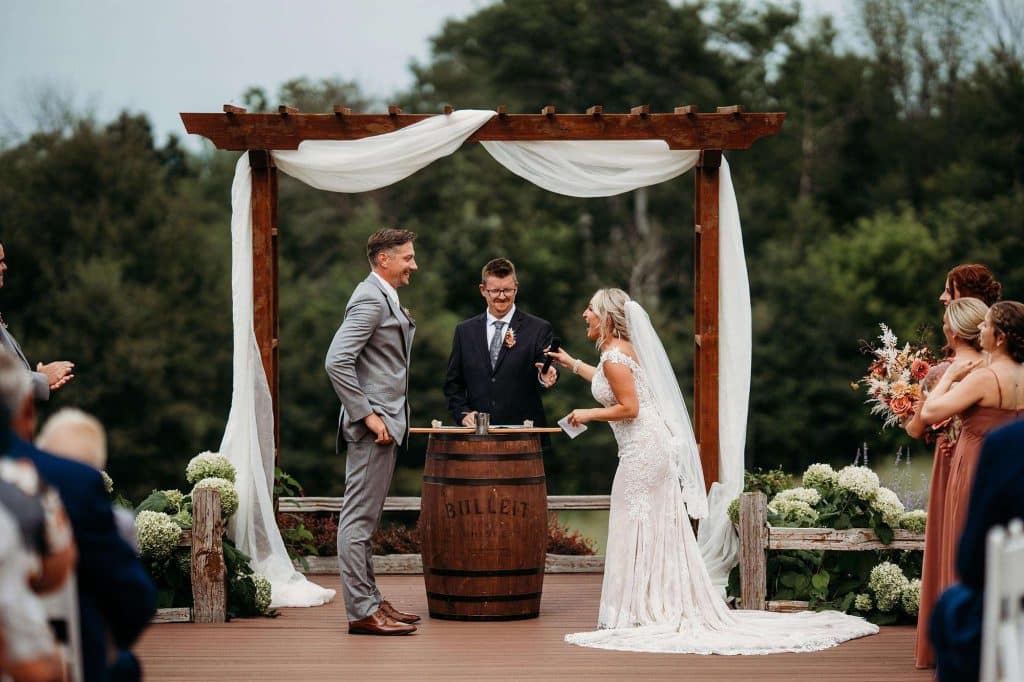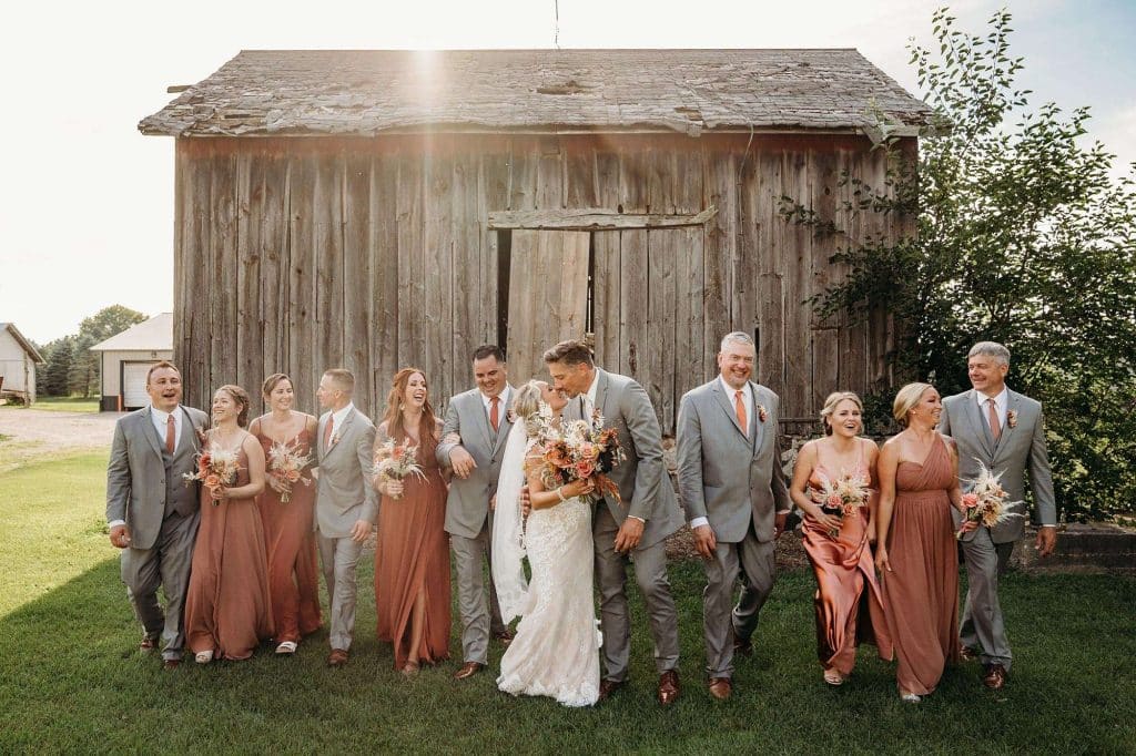 Jordan and Cory got married in August 2022 at Milford Hills in Johnson Creek. Their wedding day weather boasted a whopping 93 degrees, not atypical for late Wisconsin summer. One of Jordan’s friends served as the wedding officiant, which was an extremely special touch. Jordan and Cory wrote their own vows and even took a shot of tequila to make their union official. After the ceremony, the bridal party rode on a tractor-pulled wagon.