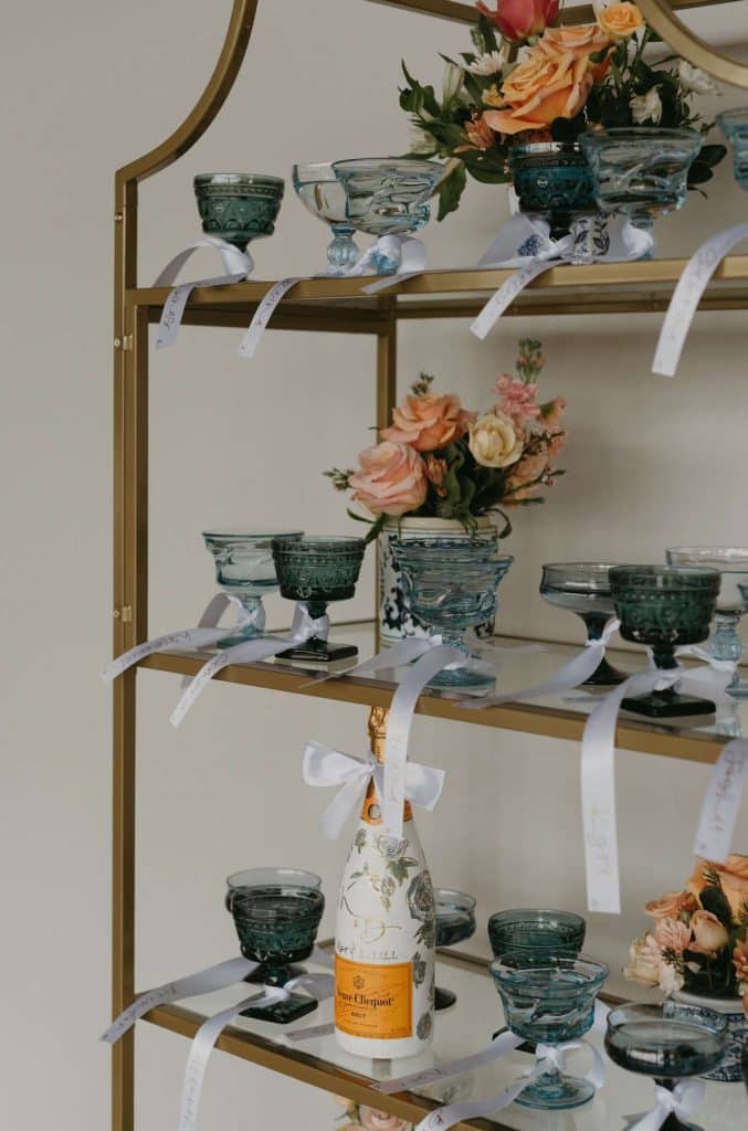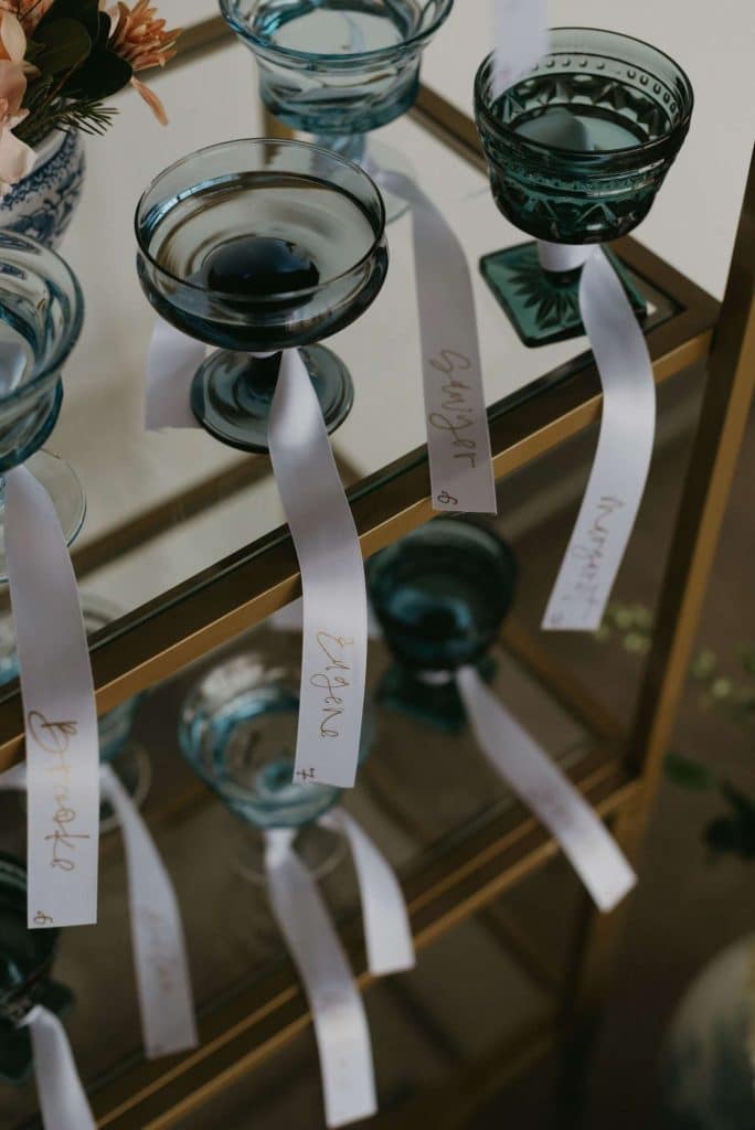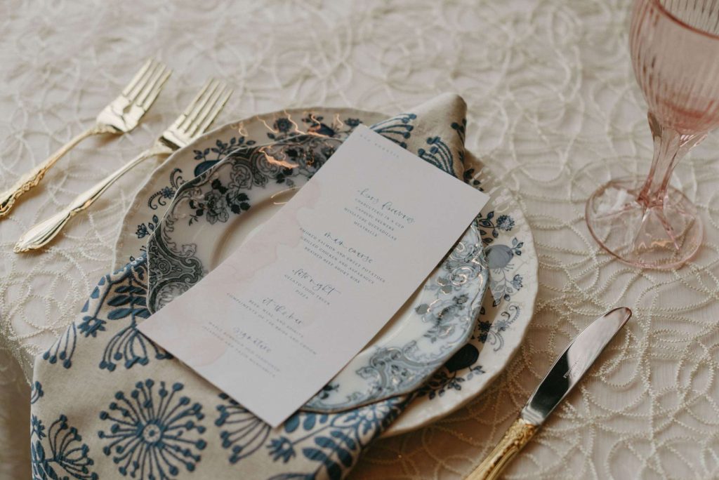 Addie at Adeline Margaret handled all paper goods for our styled shoot. In keeping with the colors of the day, everything was done up in a palette of blue and blush. Not only did Addie design the invitation suite, but also the champagne bottle and ribbon place cards, as well as the dinner menus set atop each place-setting.