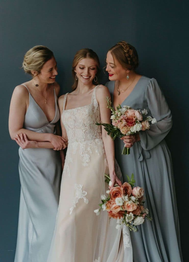 Looking at the decorative touches at our recent styled shoot, the flowers shine throughout the scene. Bank of Flowers chose a palette that ranged from soft peaches to muted rust to stand out in contrast against the blue linens. From the show-stopping high centerpiece to the large and lovely arrangements that adorned the ceremony and photo area, it’s hard to choose a favorite. We asked Bank of Flowers how they felt about working on this shoot: “When you’re in a room with so many creative people, you get recharged! There is so much energy, your mind is filled with new ideas. Your inspiration is through the roof when you leave.”