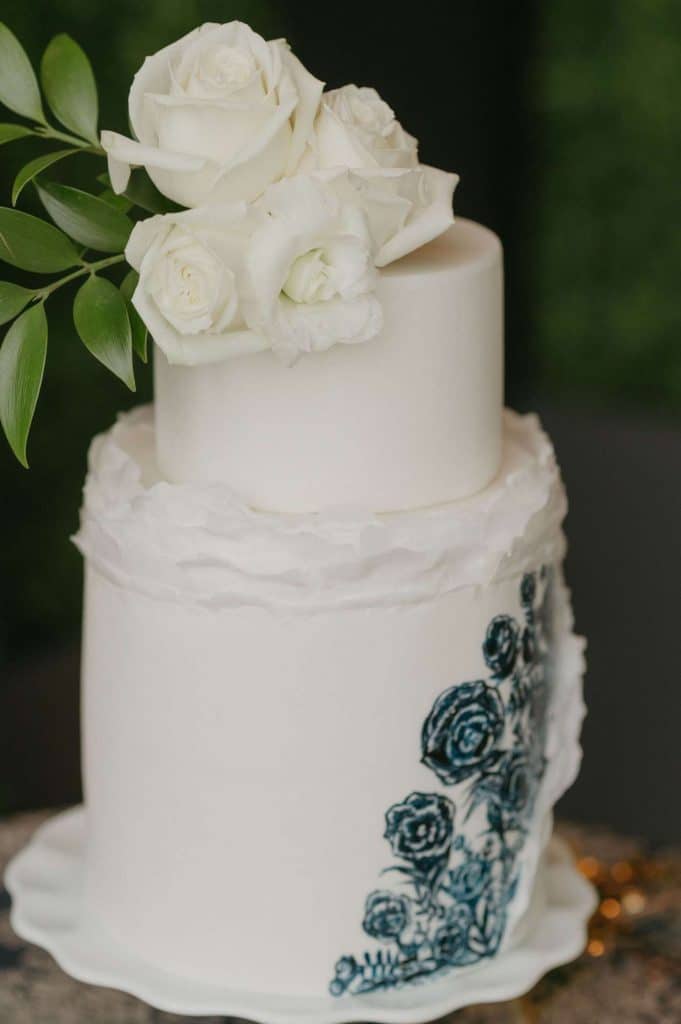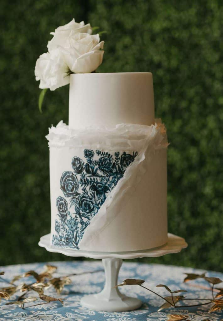 Greige Pâtisserie provided us with an enchanting wedding cake for our styled shoot. Upon the two tiers, you’ll see hand-painted blue garden roses and soft ruffled details in contrast to an otherwise smoothly-frosted confection. For a finishing touch, some fresh white blooms make the perfect topper.