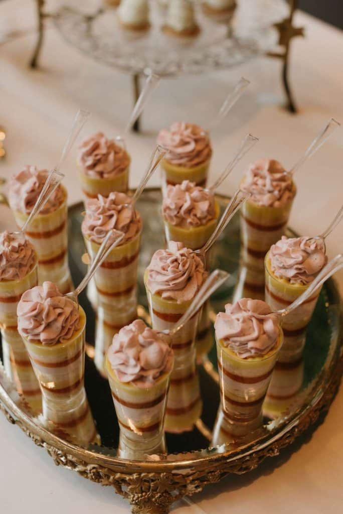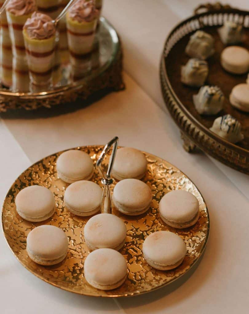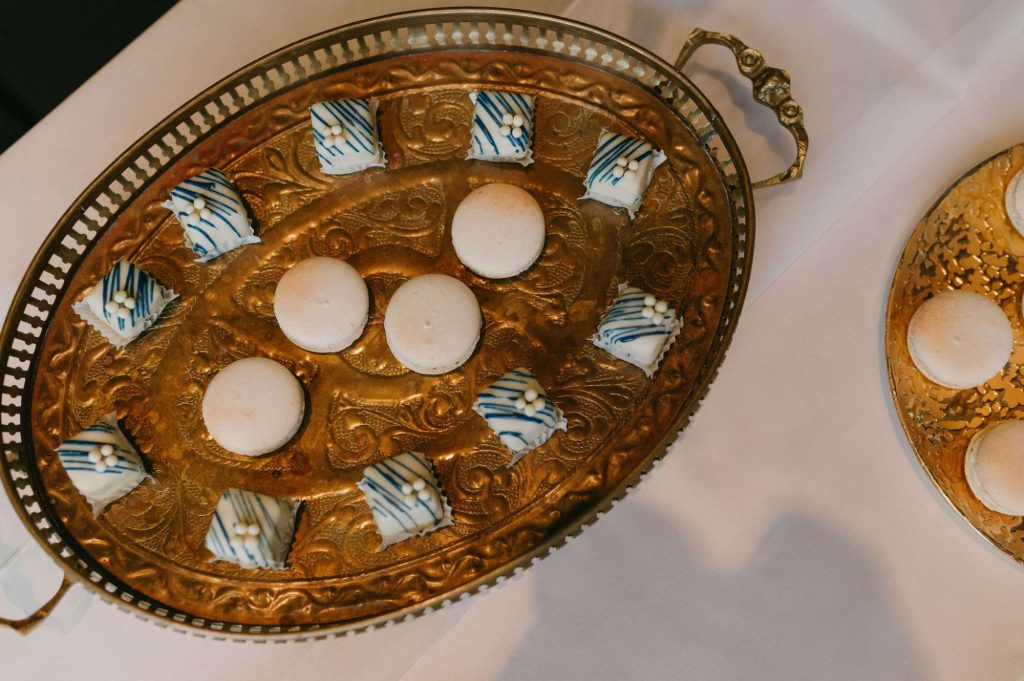 In addition they created custom monogram cookies with the couples initials adorned front and center for each place setting. Along with a delicious sweets table featuring mini specialty desserts and tasty macaroons!