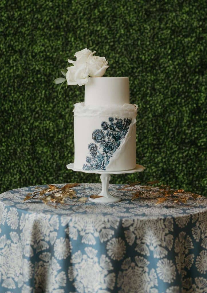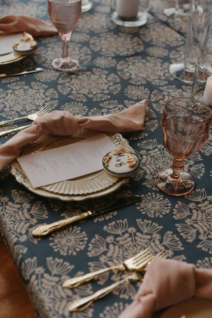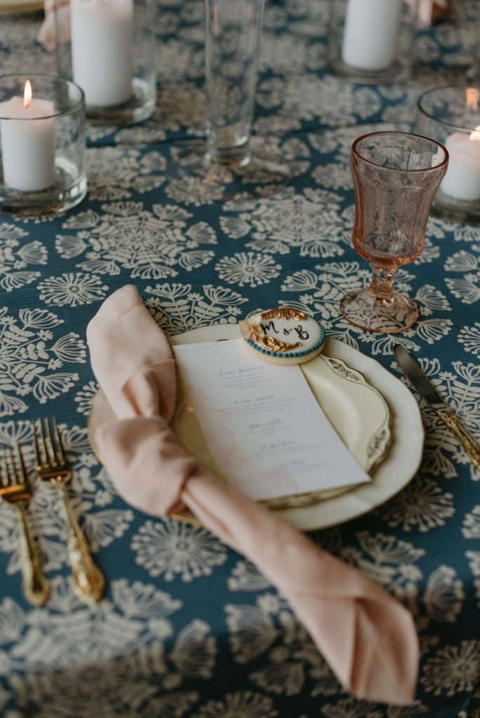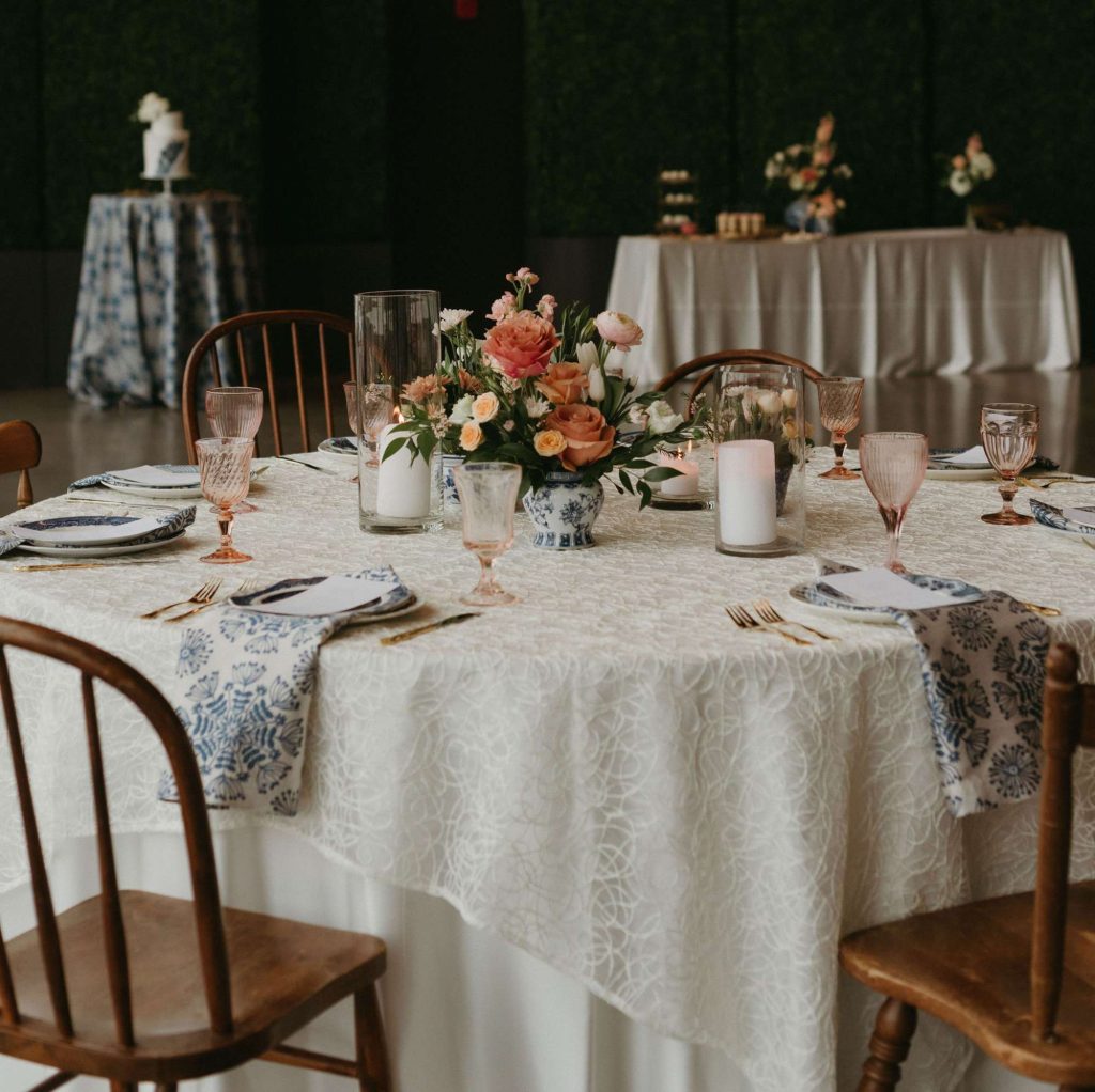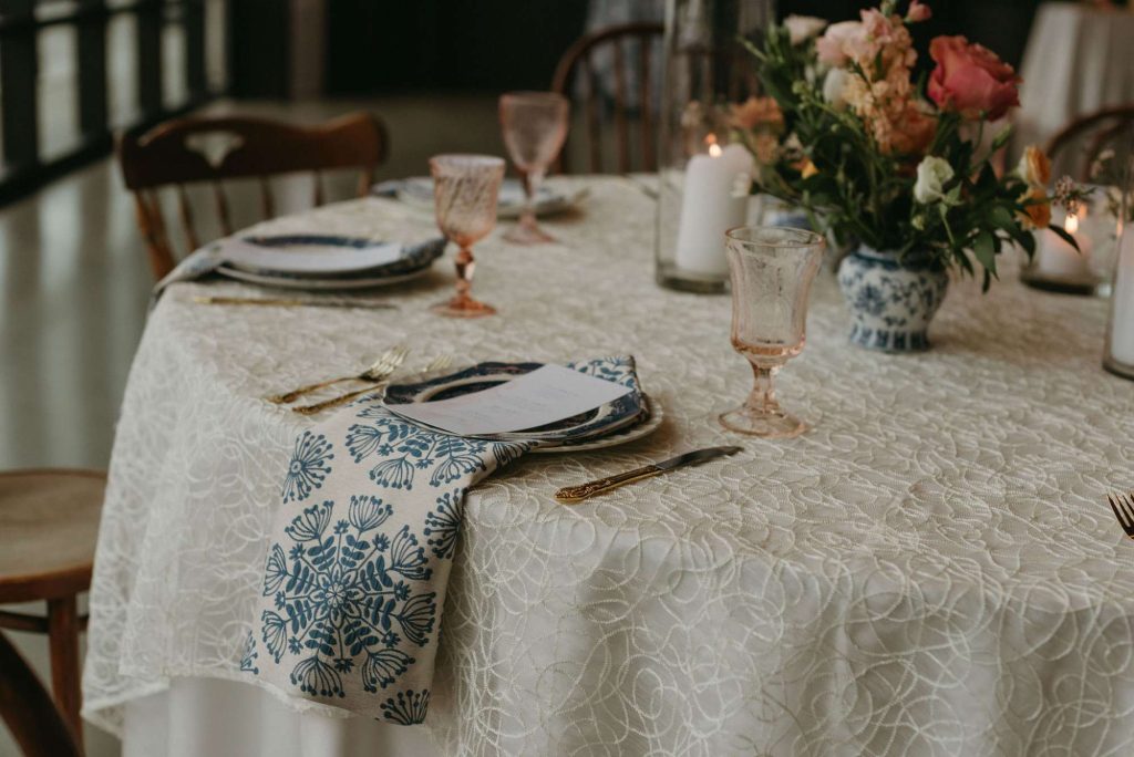 Linens from tablecloths to napkins came courtesy of Windy City Linens for our styled shoot. Throughout, we see eye-catching, patterned blue linens contrasted with white, lacey textures and coordinating napkins. Together with the mismatched plates and glassware, there’s loveliness and charm in this eclectic look, rather than a traditional sameness to the scene.
