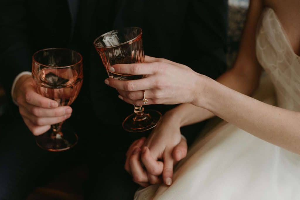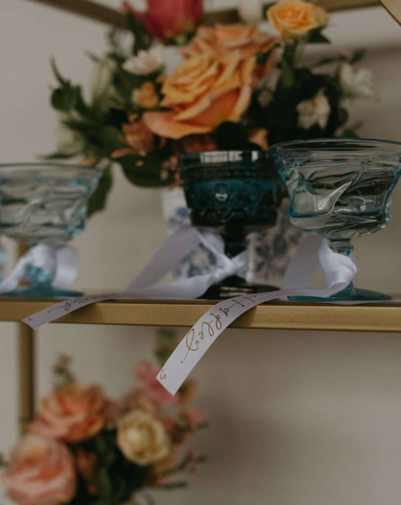 Moving to reception drinks, Relics created an artful champagne station, complete with charming blue antique coupe glasses. Sitting down for dinner, we see an eclectic array of pretty plates and soft pink glassware to lend a contrasting color to this “something blue” wedding day.