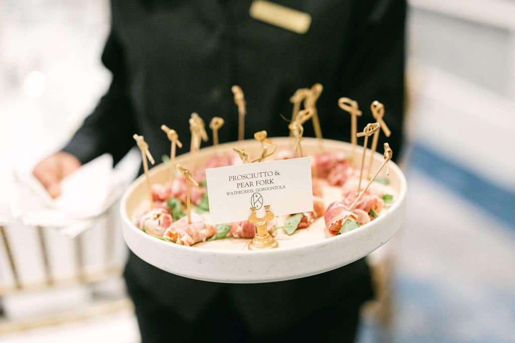 Dinner began with a beet and mozzarella salad. For the entrée course, guests had a choice between steak, salmon, and a vegetarian option. There was a dessert table as well as late-night pizza. Simma’s Bakery provided the cake, a white cake with luxurious lemon mousse. The couple offered signature cocktails to guests, including a Paloma (called the “Broloma”) and an old fashioned (called the “Old Sibal”).