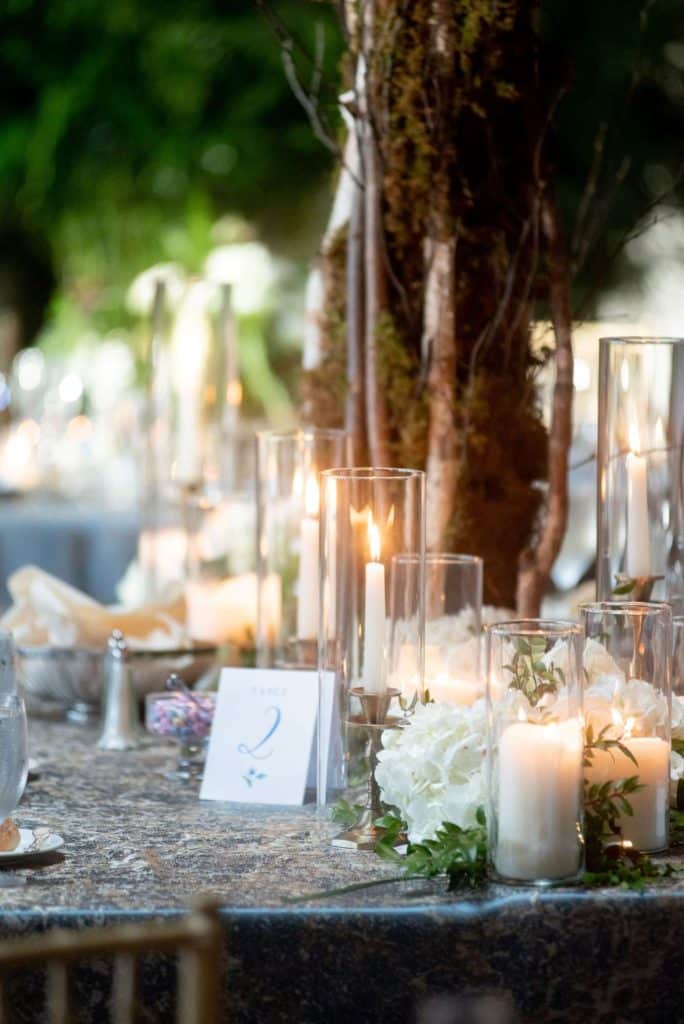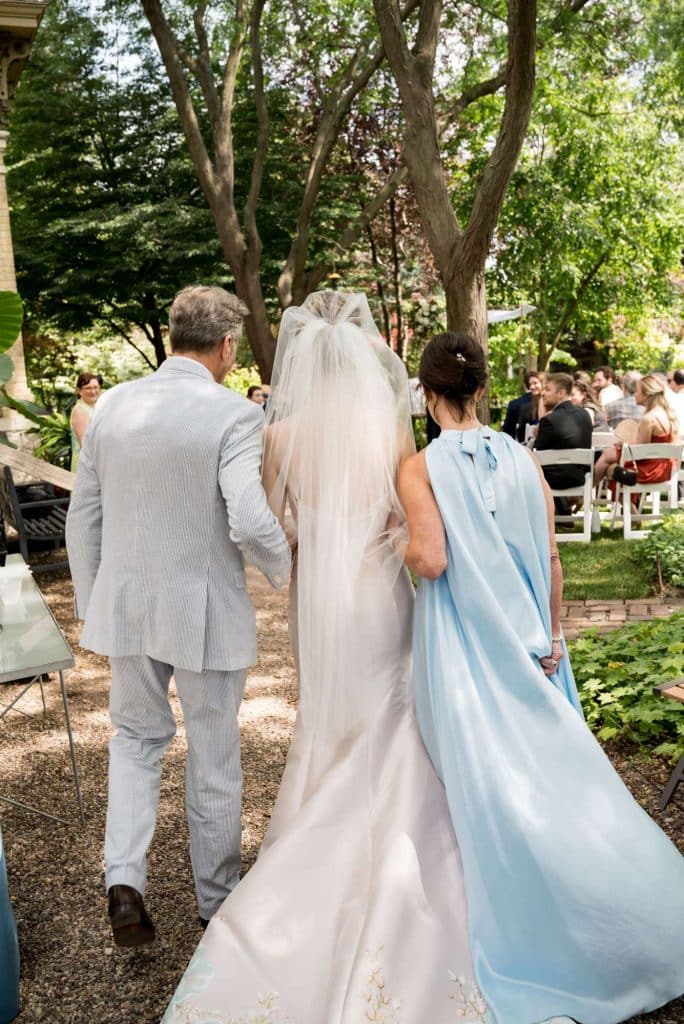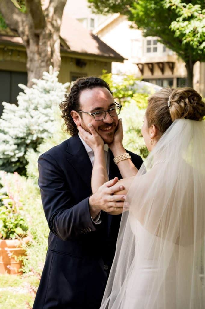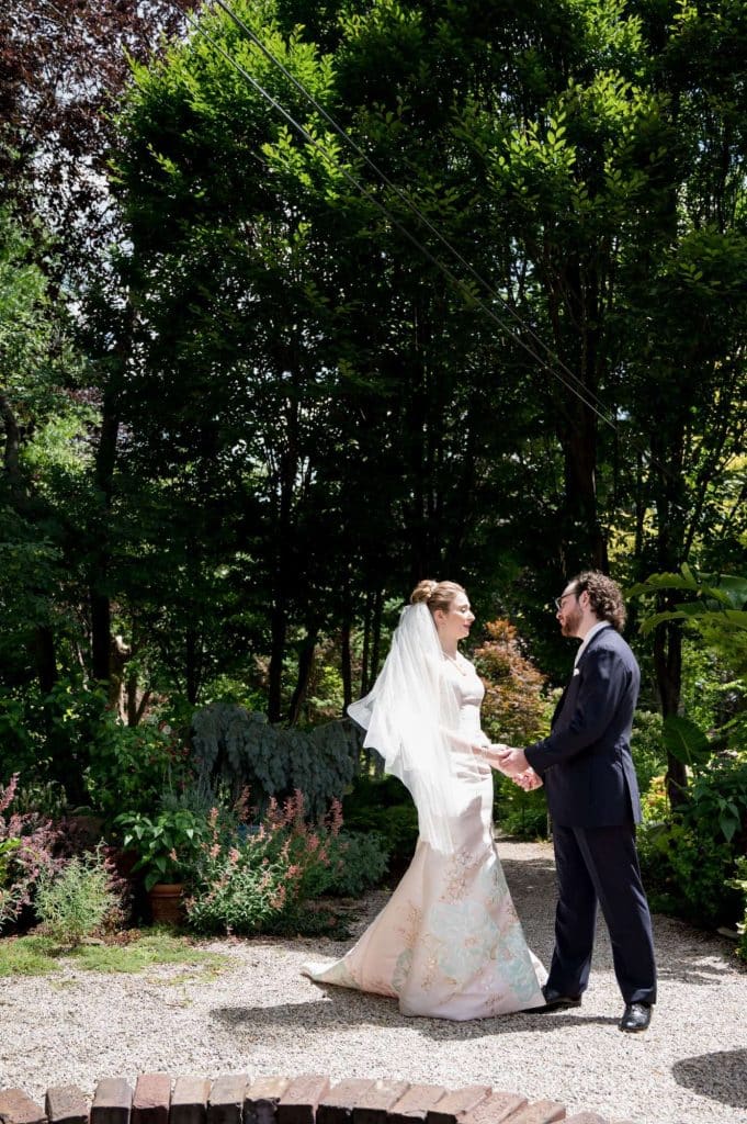 The couple describes the first look as an incredibly romantic moment. “It is beyond words to have that private moment where our nerves, anticipation, and love all coalesced as our eyes finally met. We both kept tearing up,” Michelle says.