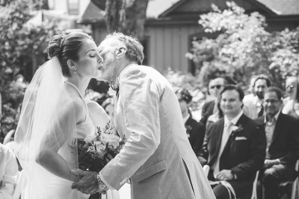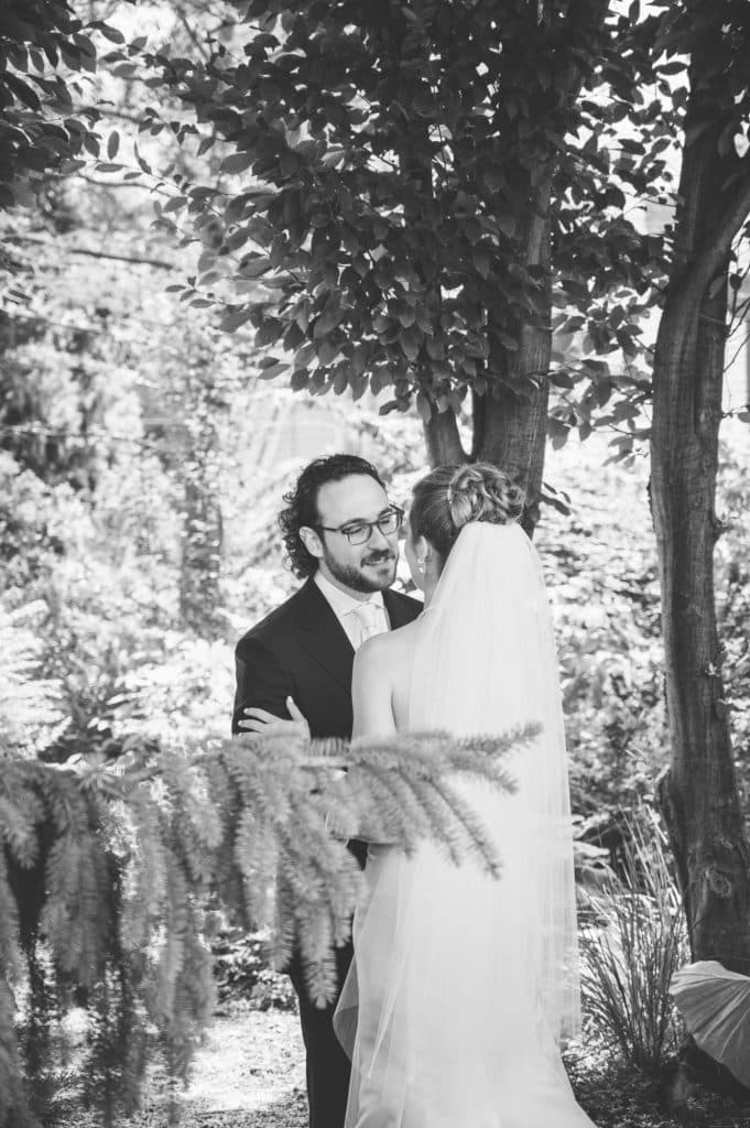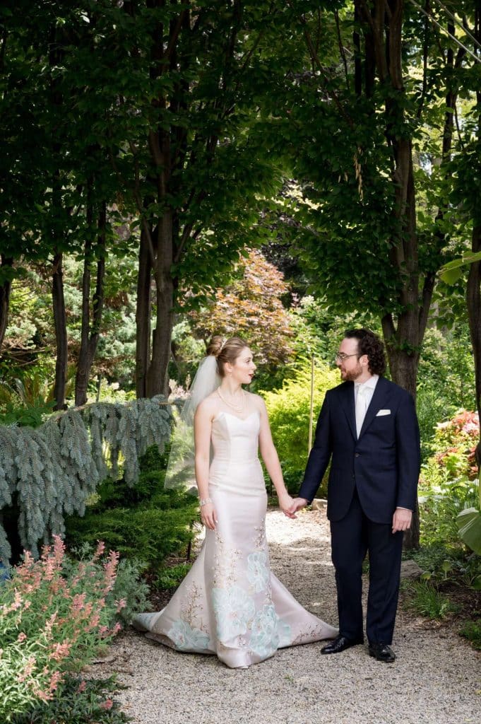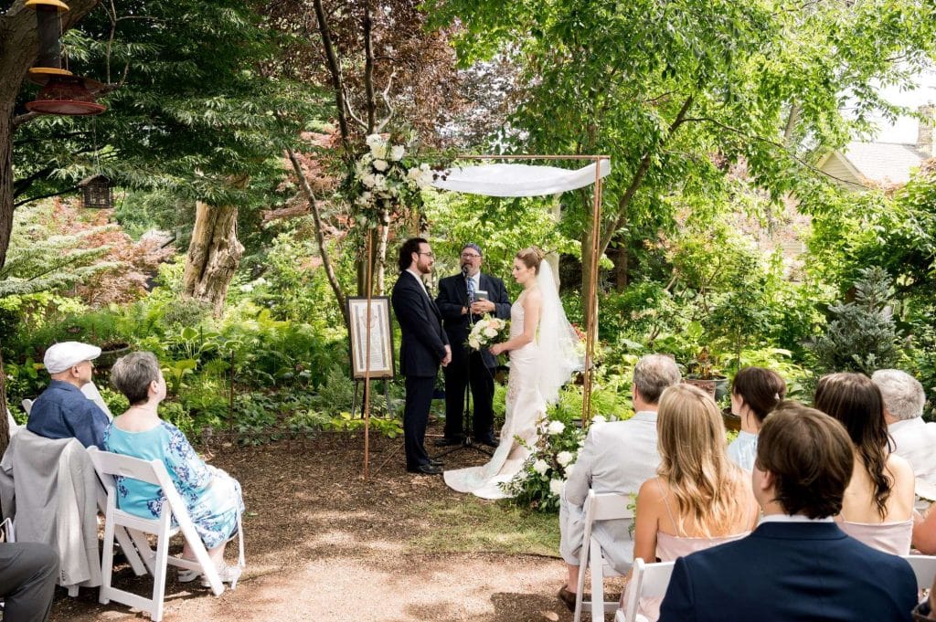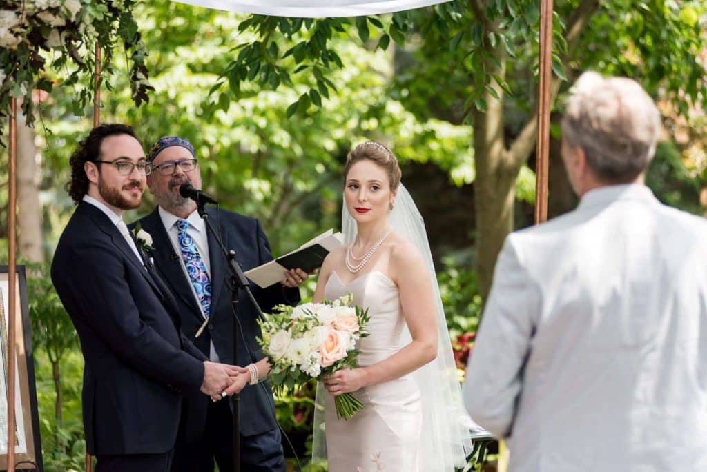 Michelle and Gregory held their intimate wedding ceremony at Sanger House Gardens in Brewer’s Hill, an incredibly beautiful venue full of rich textures and gorgeous, lush plants all around. In addition to sharing the special moment with their closest family and friends, they invited seven family members and friends to bless our new marriage. The couple modernized an old Jewish tradition by asking the witnesses to write their own blessings. They also got to know their officiant, Rabbi Ike Serotta, over the course of the six months leading up to our ceremony.
