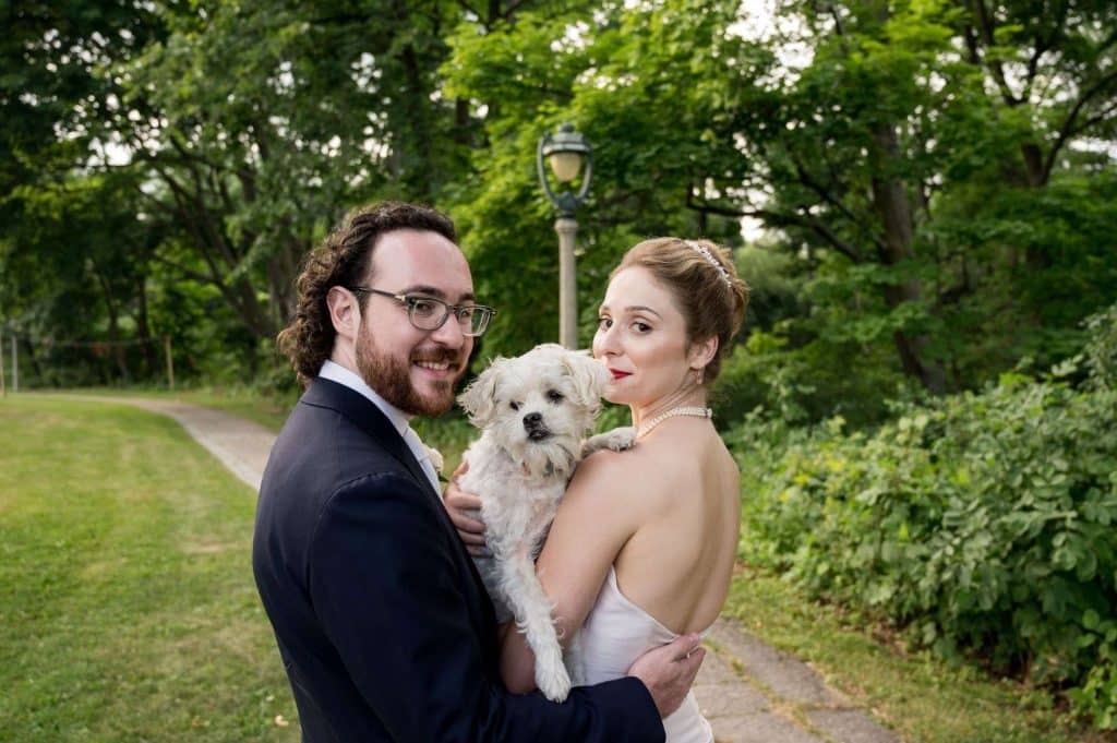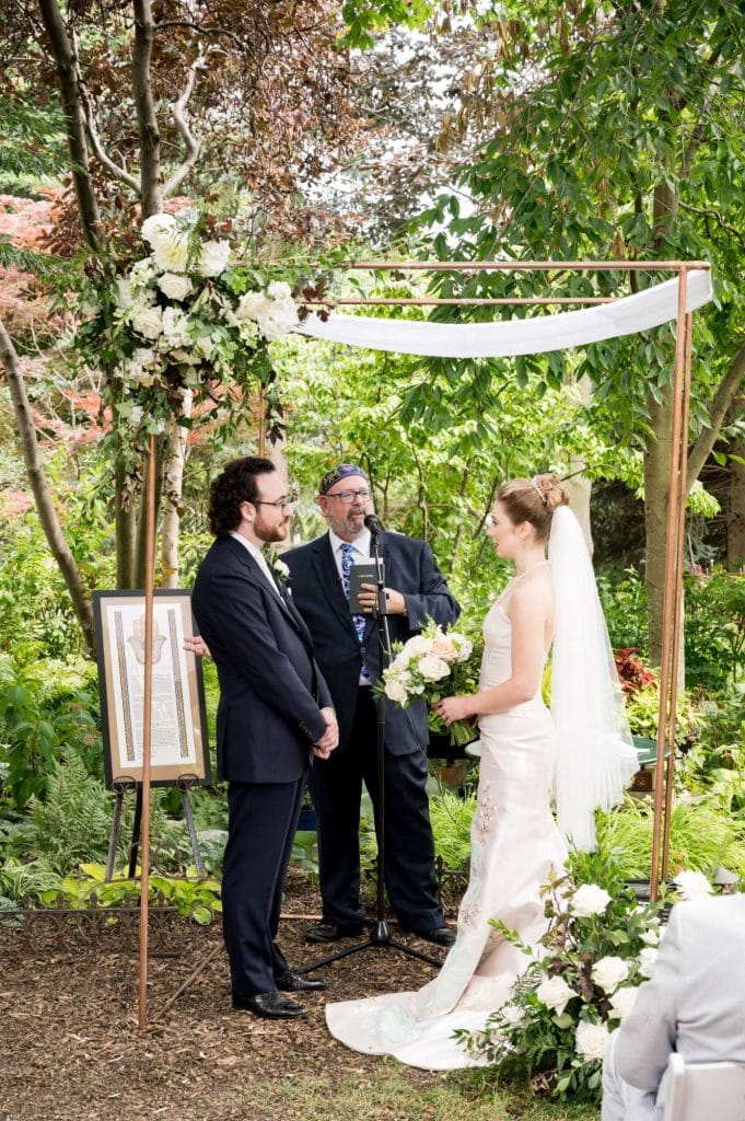 Michelle and Greg painted the cake toppers themselves: the couple in their wedding outfits, plus their dog Baxter! They also constructed their own chuppah, the Jewish wedding arch under which they were married, from copper pipe. The canopy was a tablecloth handed down through Greg’s family.