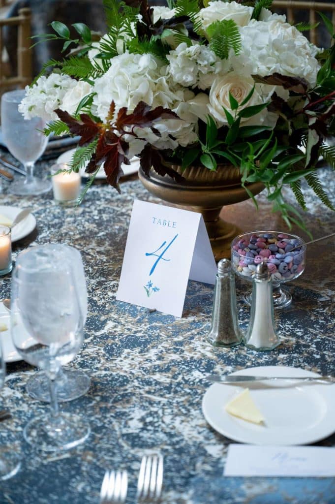 The wedding invitations and other signage were inspired by the couple’s proposal with blue flowers printed on them.