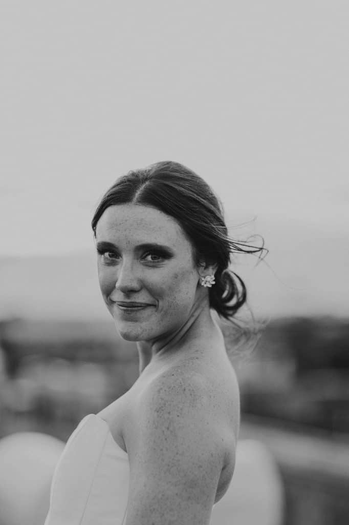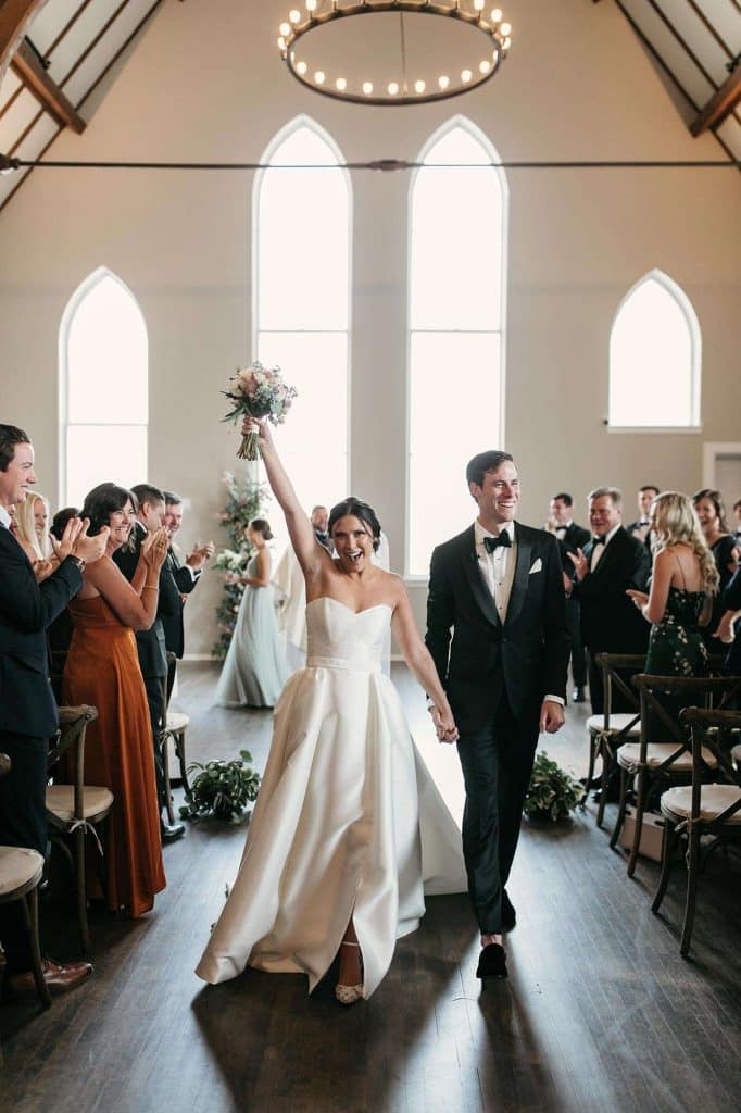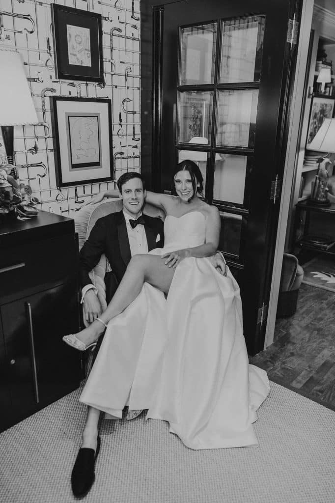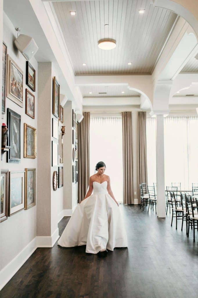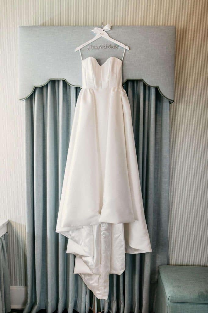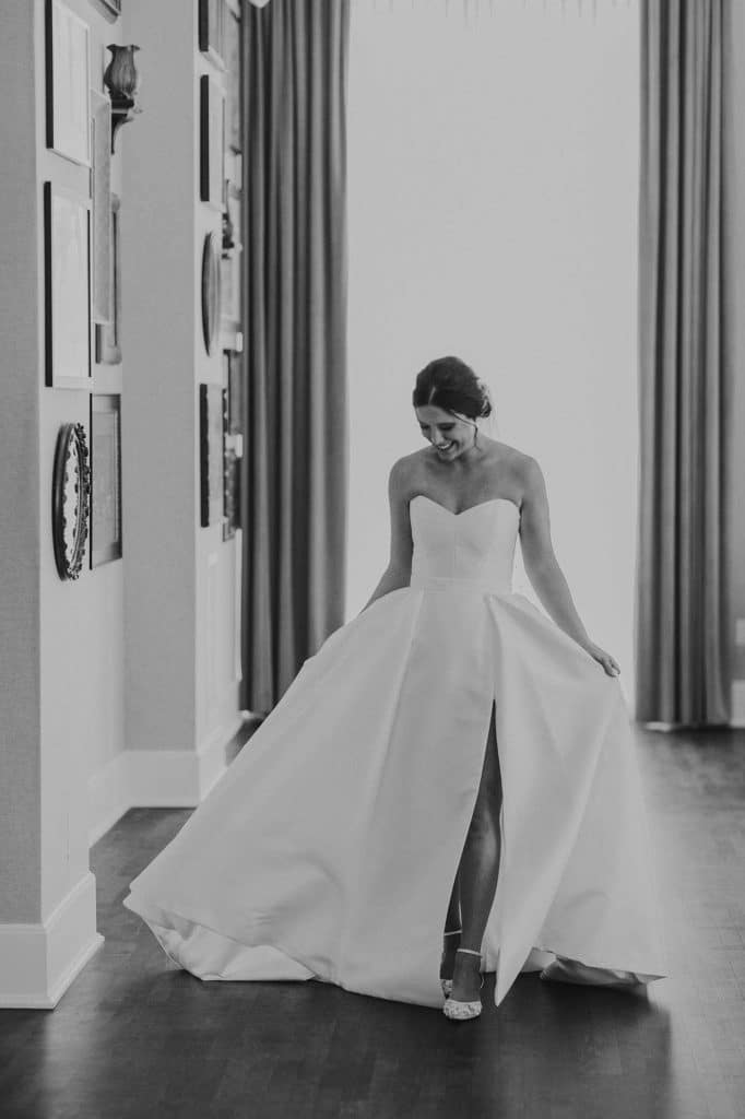 Erin found her dream wedding gown, which was designed by Karen Willis Holmes, at Gilded Rose Atelier in Barrington, Illinois. After trying on just a handful of dresses, Erin knew it was “the one” when it fit her like a glove. The dress was very flattering and formal yet elegant. She felt like a chic, modern princess, which is exactly how she wanted to feel.