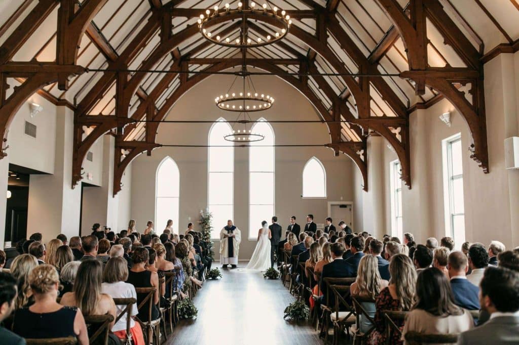 Erin and Pete’s ceremony was held at St. James 1868 in Downtown Milwaukee. It was a Catholic ceremony officiated by a priest, but instead of the full mass, it was only 25 minutes long. Since their families have differing religious beliefs, they wanted to be respectful of both sides while still making sure they incorporated valuable traditions.