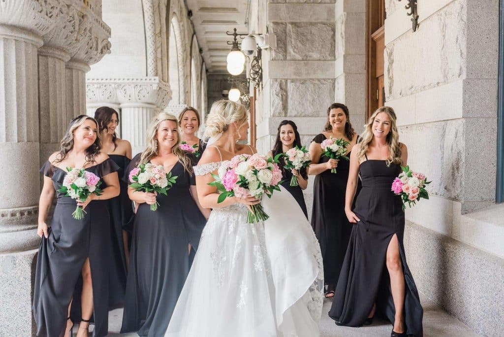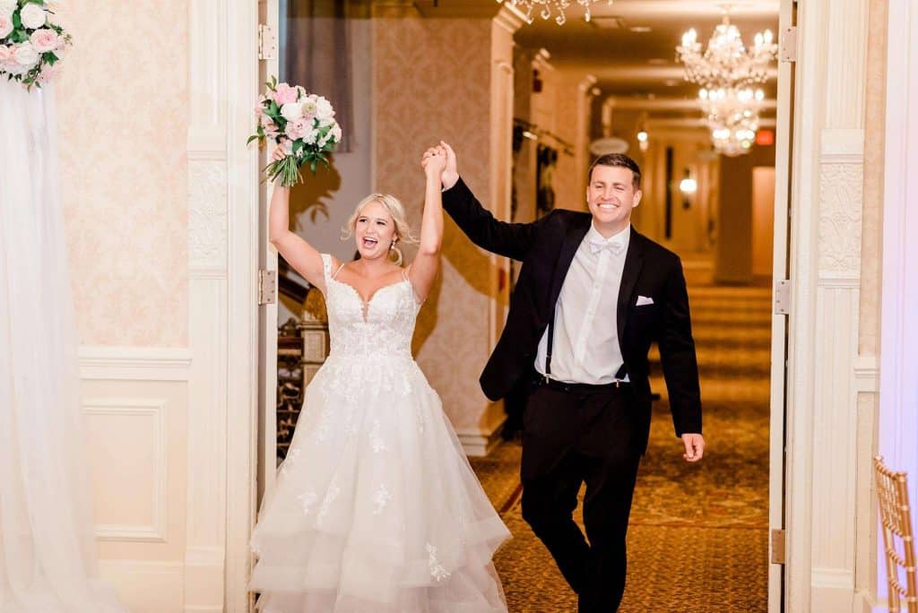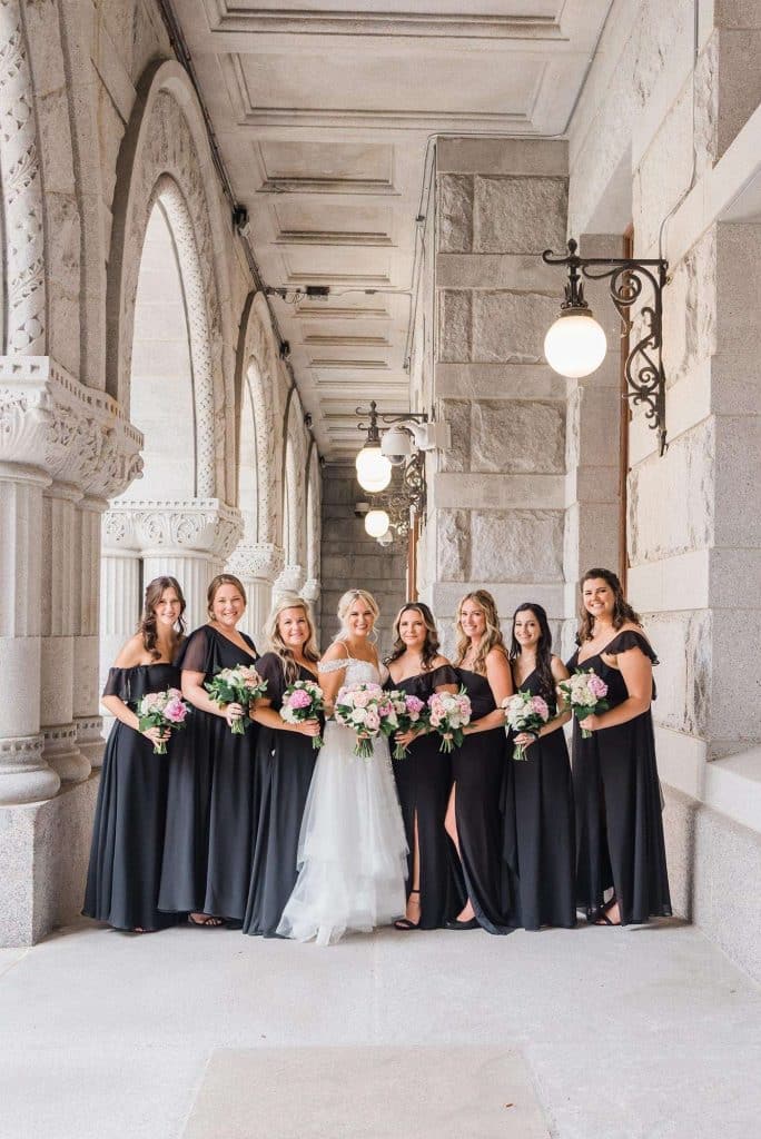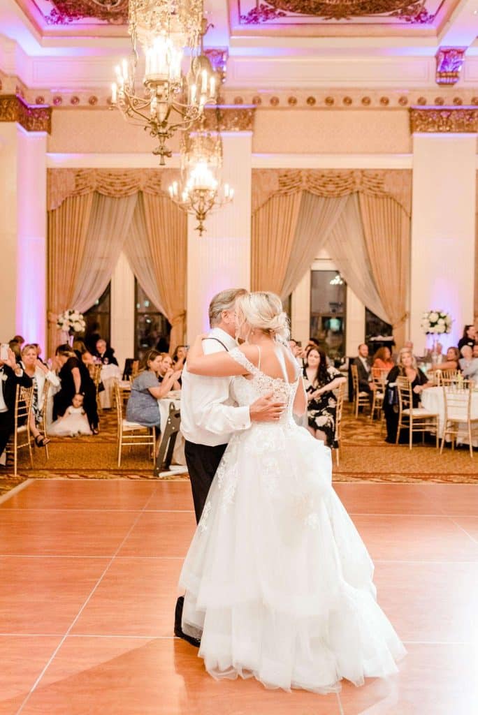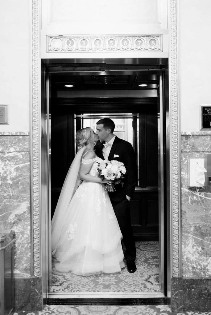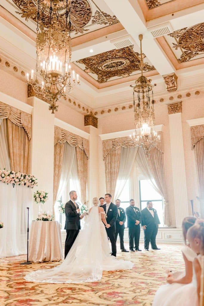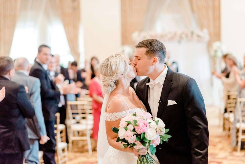 Kimmy and Ben’s wedding ceremony was held inside the Imperial Ballroom at the Pfister Hotel in Downtown Milwaukee. The bridesmaids and groomsmen were all donned in black, and the décor featured pops of pink and gold with beautiful floral by Belle Fiori. Their pastor from Oconomowoc officiated the ceremony, and a professional harpist played music as the party, groom, and bride walked down the aisle.