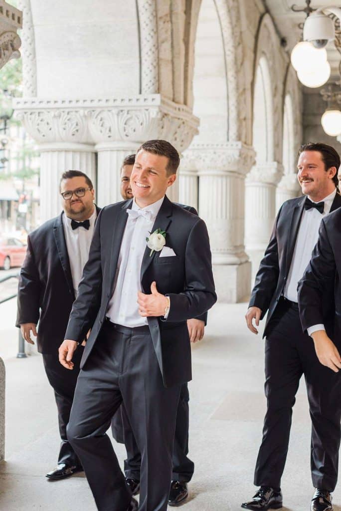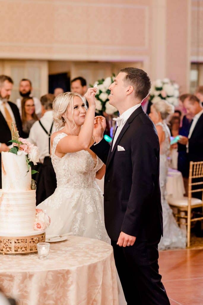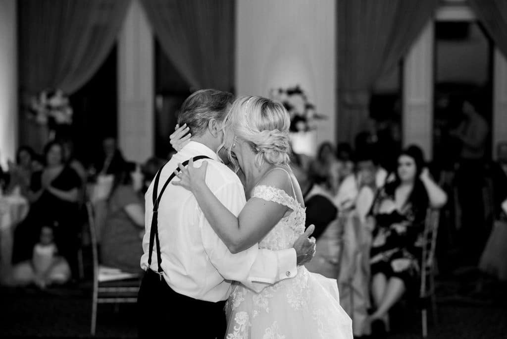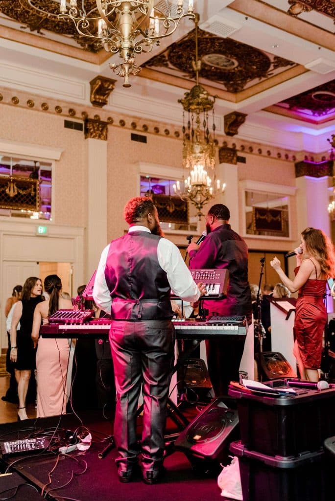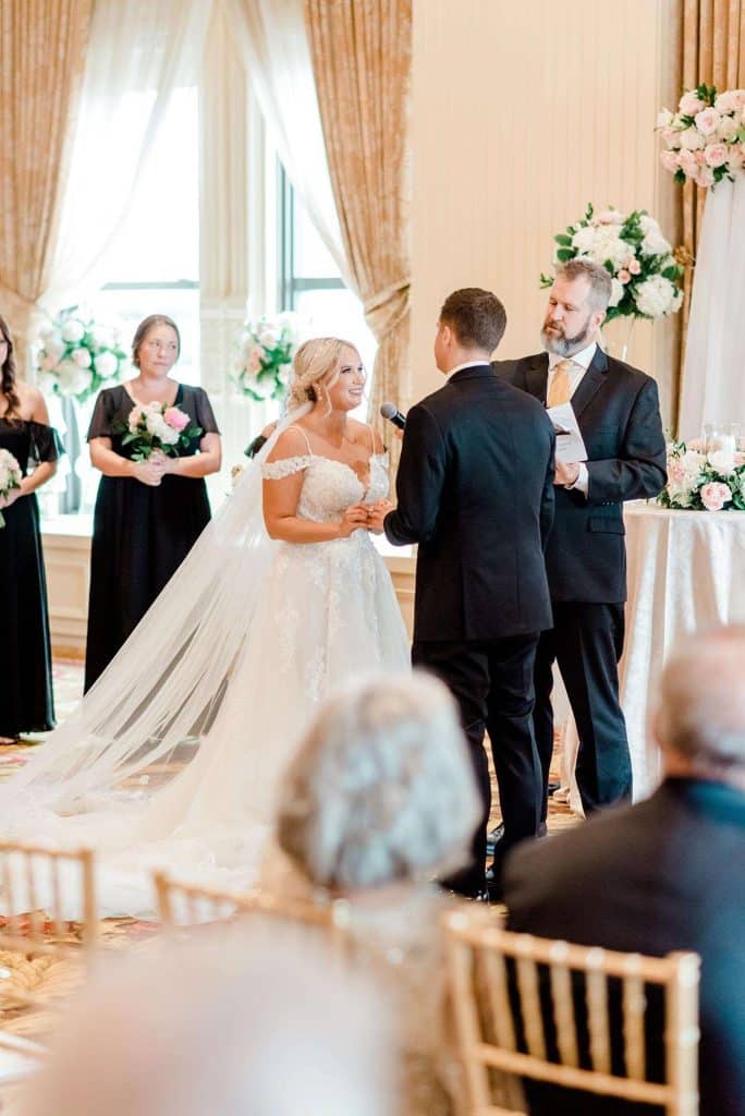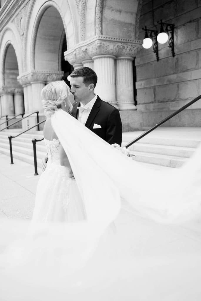 Kimmy and Ben’s wedding ceremony was held inside the Imperial Ballroom at the Pfister Hotel in Downtown Milwaukee. The bridesmaids and groomsmen were all donned in black, and the décor featured pops of pink and gold with beautiful floral by Belle Fiori. Their pastor from Oconomowoc officiated the ceremony, and a professional harpist played music as the party, groom, and bride walked down the aisle.