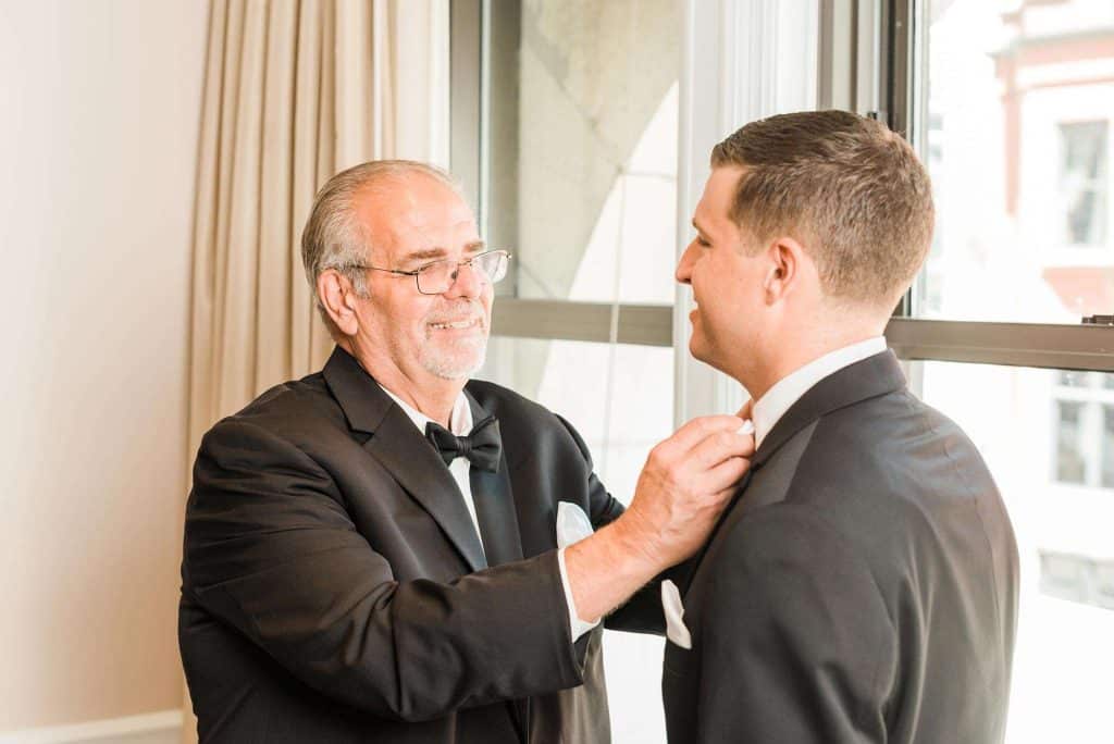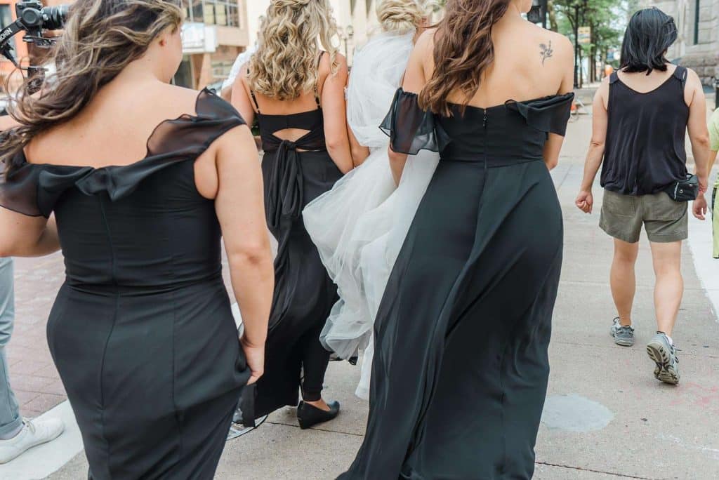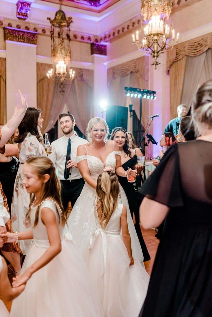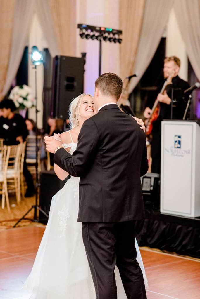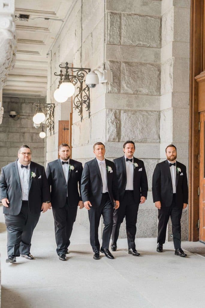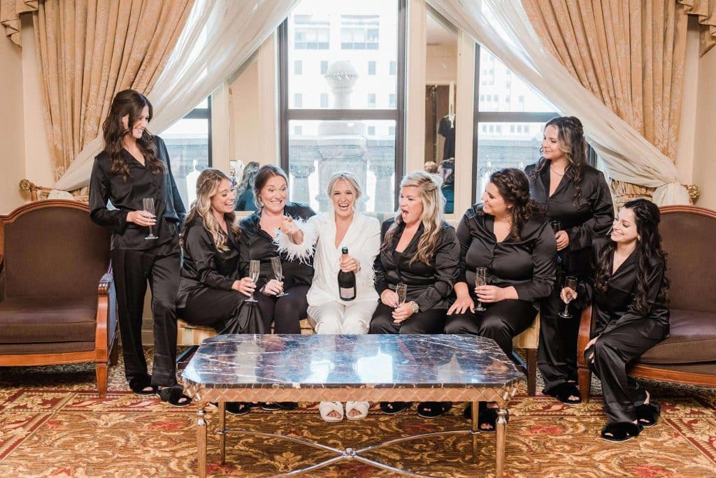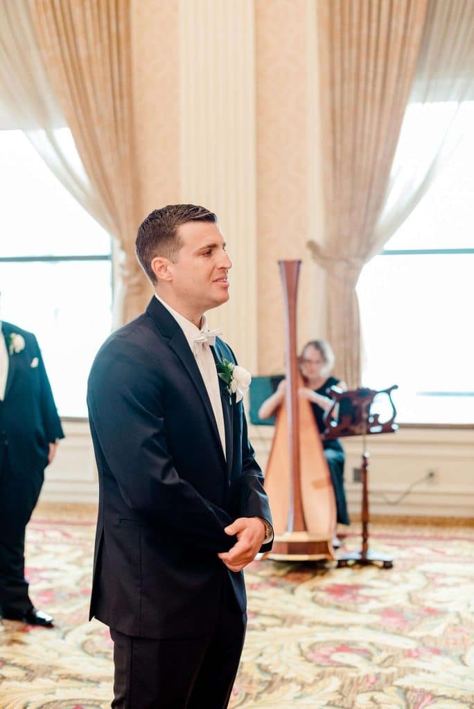 Kimmy and Ben’s wedding ceremony was held inside the Imperial Ballroom at the Pfister Hotel in Downtown Milwaukee. The bridesmaids and groomsmen were all donned in black, and the décor featured pops of pink and gold with beautiful floral by Belle Fiori. Their pastor from Oconomowoc officiated the ceremony, and a professional harpist played music as the party, groom, and bride walked down the aisle.