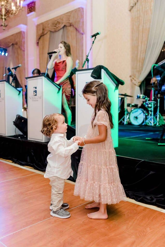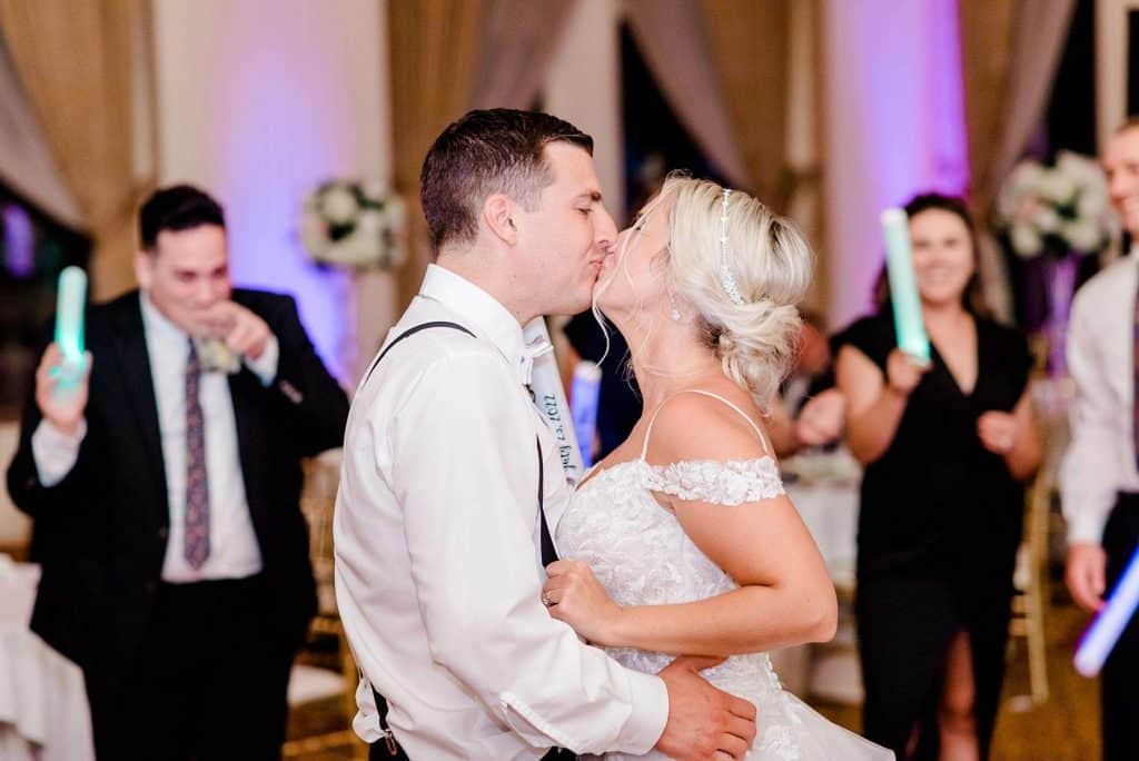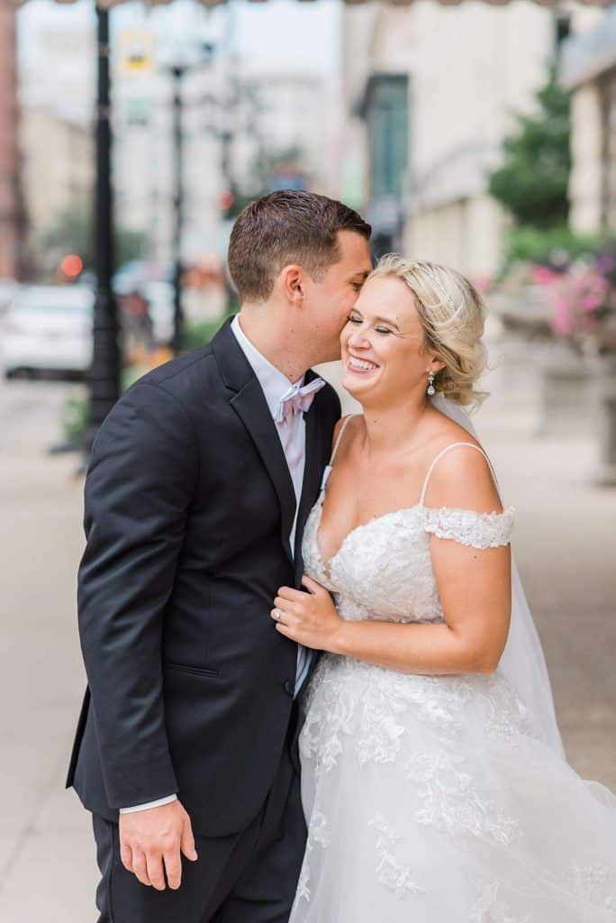 The Pfister Hotel graciously catered the meals and drinks for Kimmy and Ben’s wedding, including a four-course meal, an open bar, a Champagne toast, and a late night snack. For dinner, guests enjoyed an option of steak, chicken, or salmon — all of which were delicious and cooked to perfection. The Diamond Package also included hors d’oeuvres during the cocktail hour as well as a fancy spread of cheeses and meats. There was also a dessert bar courtesy of LoLo Loves Cakes in Hartland and French bulldog-shaped macarons by Mac MKE.