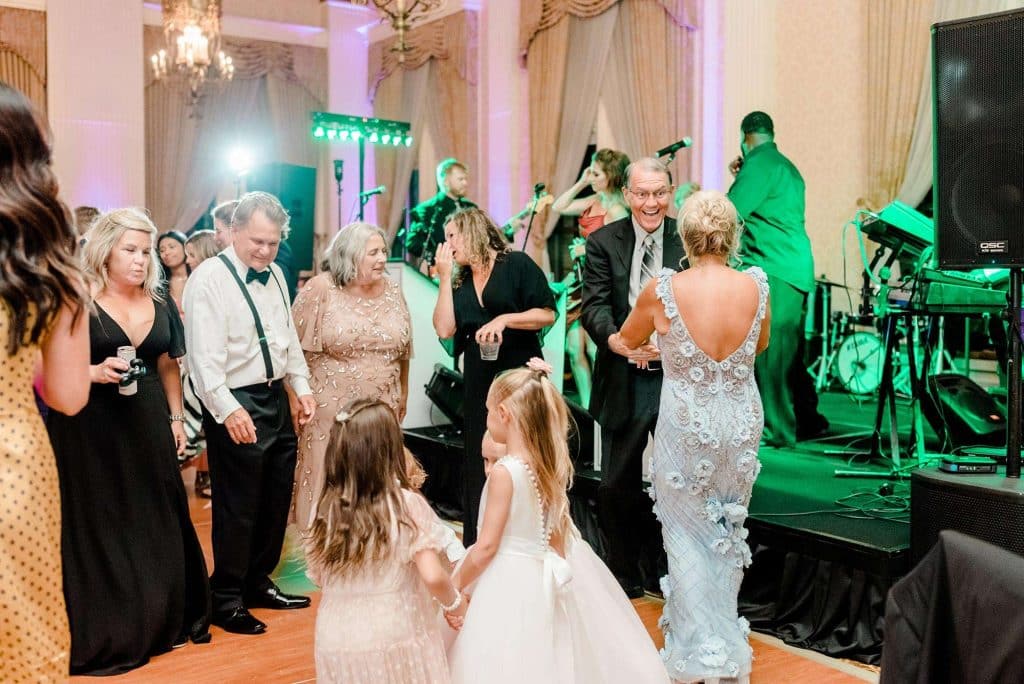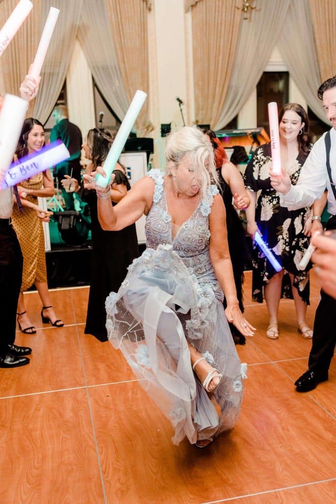 The reception was also held in the Imperial ballroom at the Pfister. The wedding band, North Coast Orchestra, had the dance floor packed till midnight! Guests were handed colorful glow foam sticks, which made for some awesome photos.