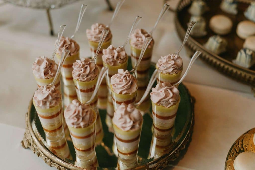 Greige’s stunning custom cakes will be the center of attention after guests enjoy a delicious dinner and get ready to dance the night away. In addition to wedding cakes, the in-house pastry chef creates mini desserts such as salted caramel tarts, lemon bar bites, cookies, shooters, and French macaroons.