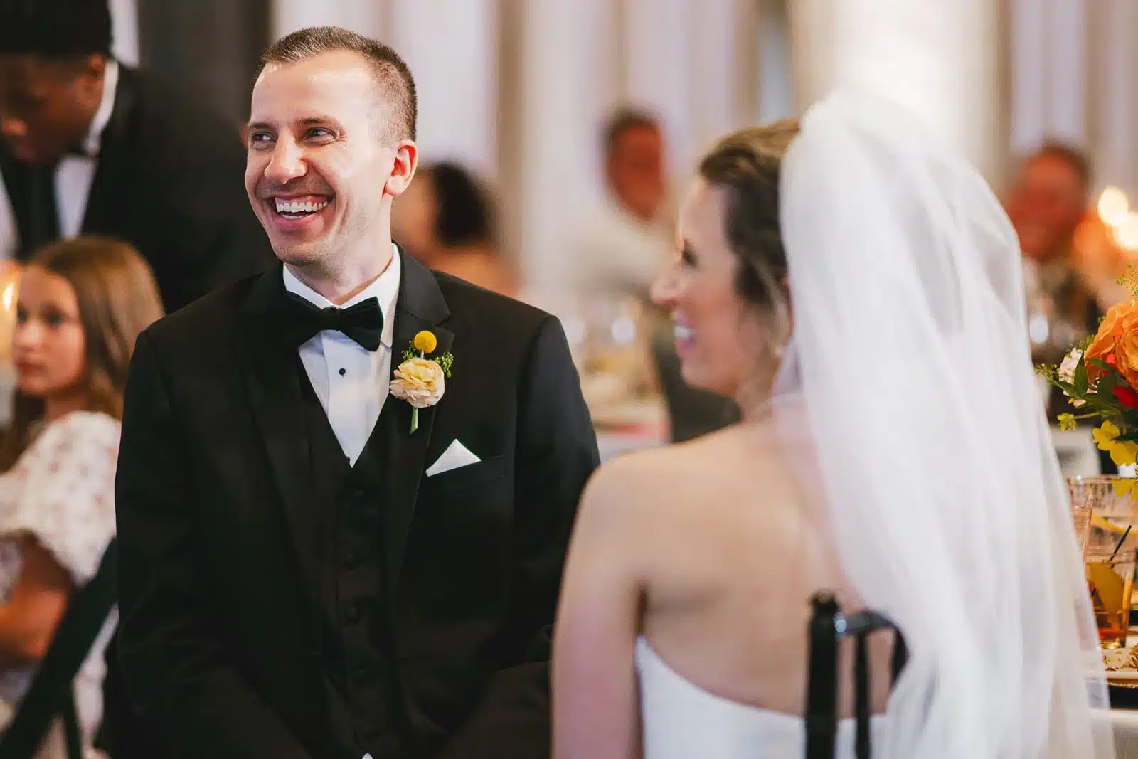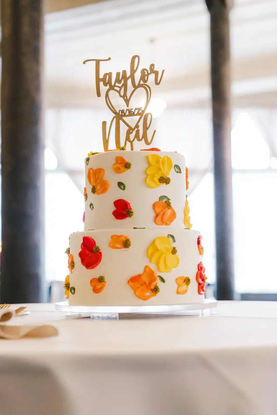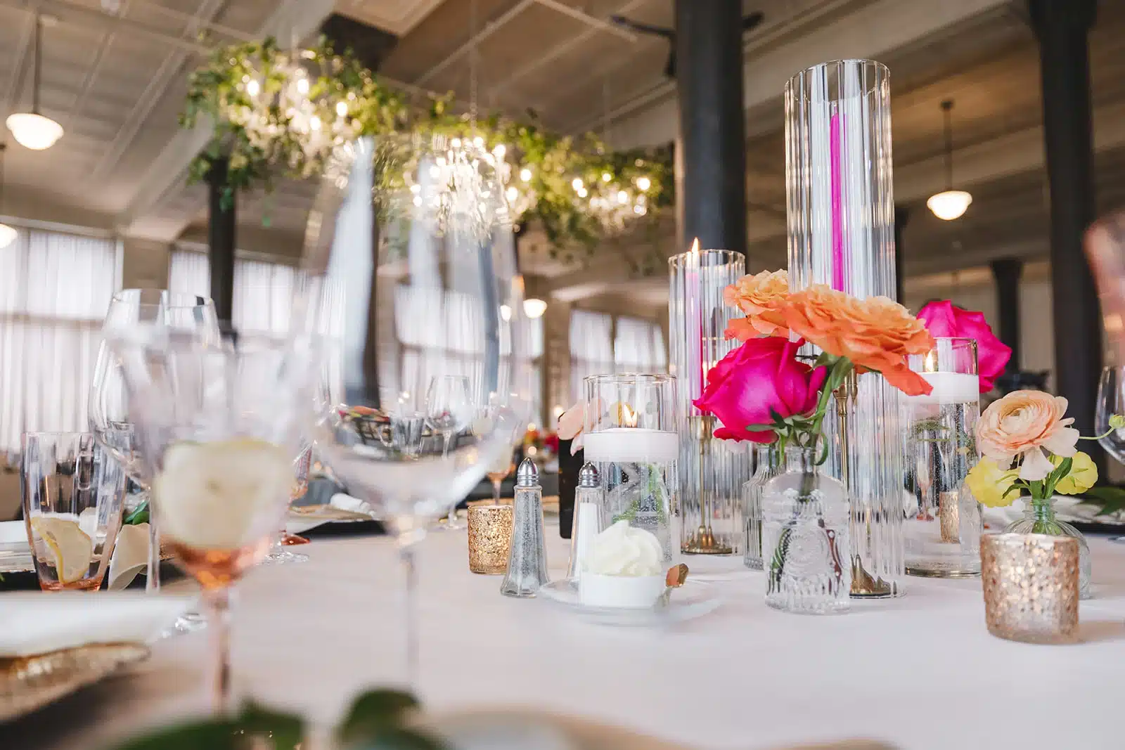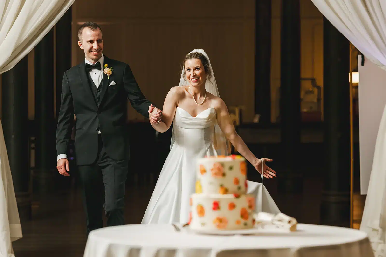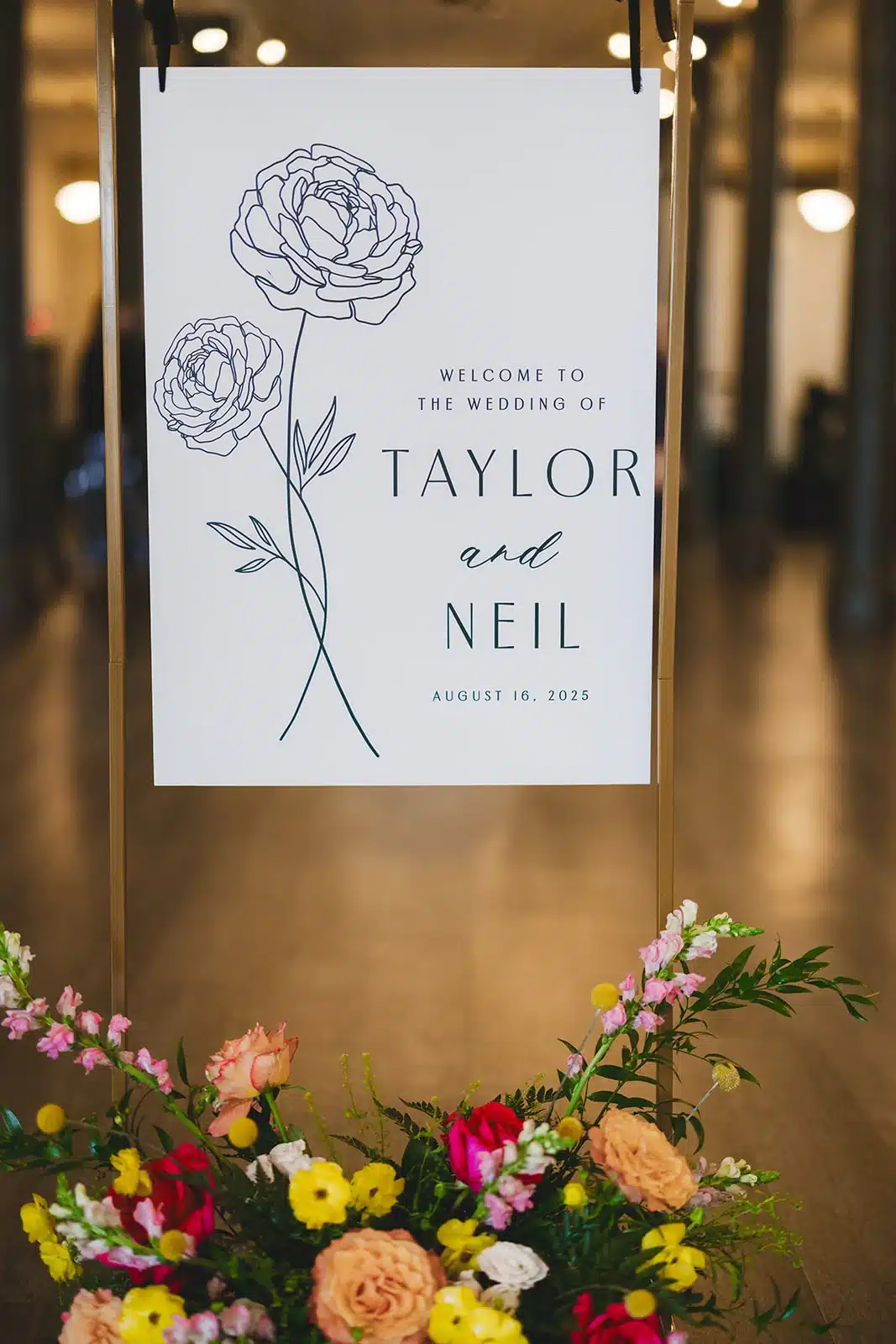 “My vision was for the wedding to be unique and vibrant, but also feel elegant for a late-summer wedding. I wanted to keep the evening classic and timeless (with black/white/gold), but bring in pops of color to make the reception space feel dreamy and inviting (especially since the Pritzlaff has so much Cream City brick). The floral arrangements mixed roses and delicate blooms in peach, pink and yellow with soft greenery adding natural texture. Roses also tied into our invitations and signage, creating a cohesive look throughout the whole wedding experience.