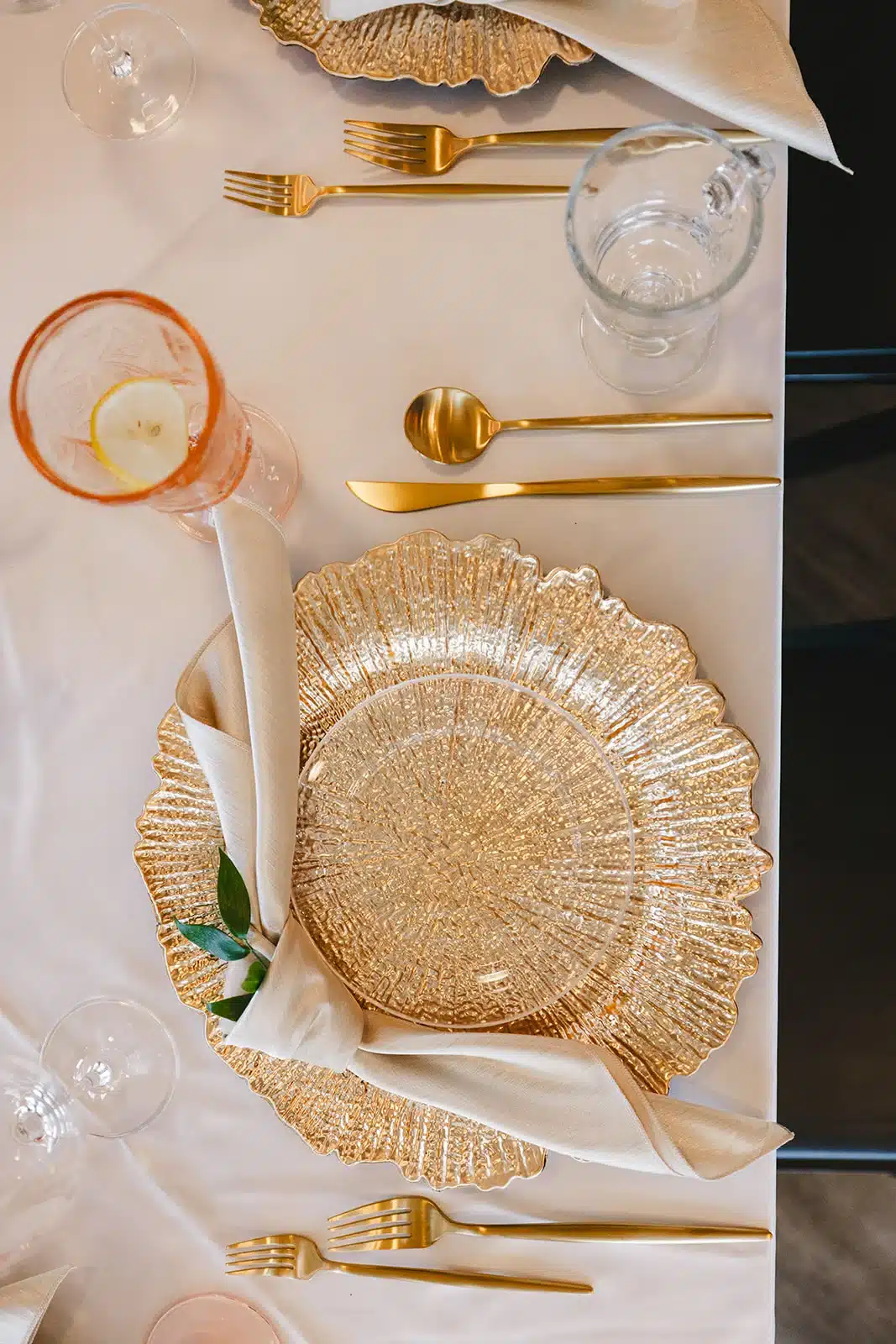 “Knowing how big the 333 Pritzlaff room is, we separated out the cocktail hour and reception space with beautiful lighting, drapery and plenty of seating to give each part of the evening its own space. We had the band set-up in the back that allowed for a big dance floor that was close to the bar, so people could always be near the action (which kept the party going all night long). At the reception, we alternated between some tables having larger centerpieces, and other tables being centered on candles and small bud vases to make each setting feel special. The greenery trellis above the head table added soft dimension, and the florals paired beautifully with the golden tableware. We also upgraded to more premium linens and a fun design on the head table linens, which really elevated the space.